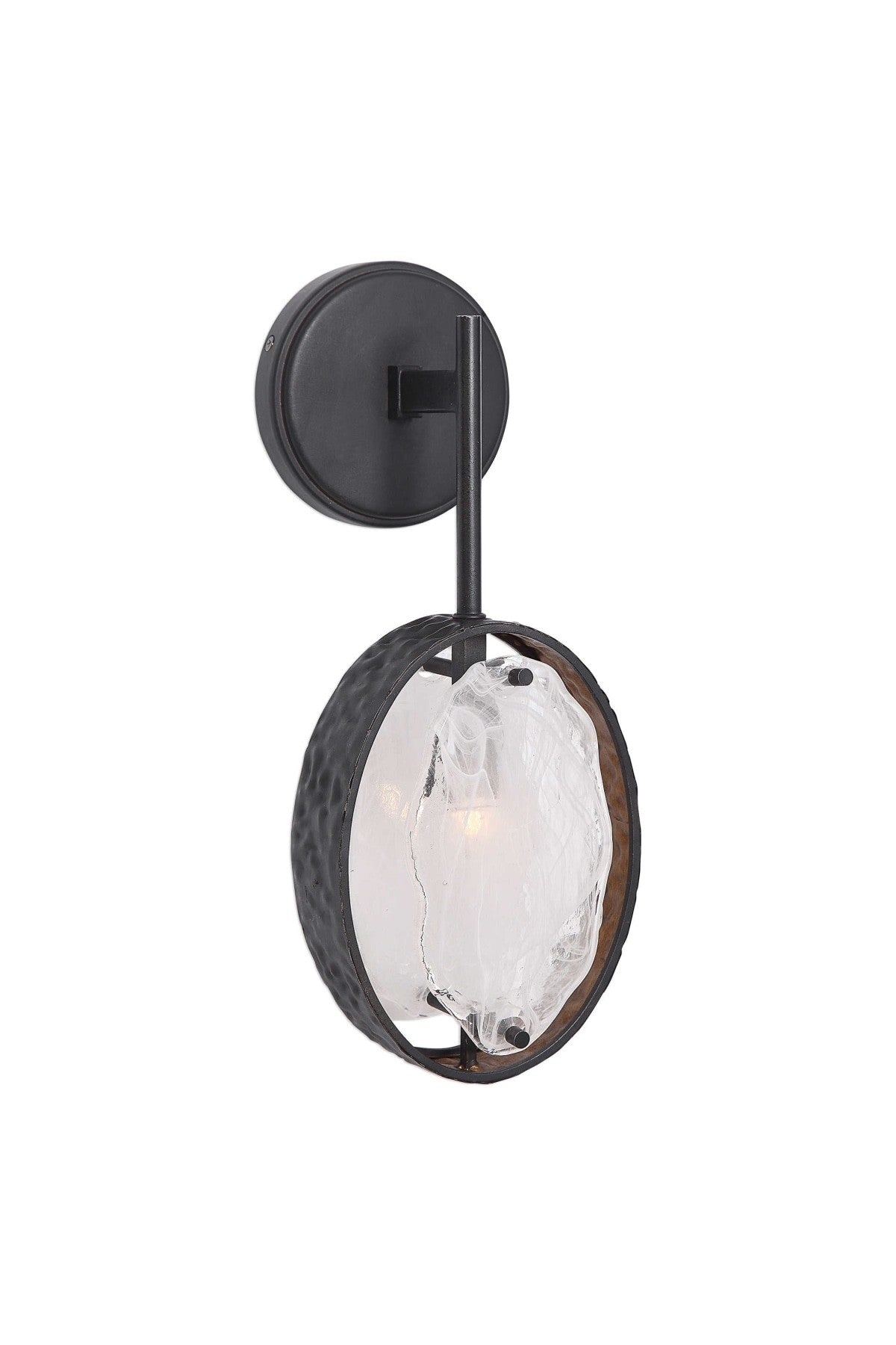 Meet the Maxin 1-Light Sconce. Ring of dark hammered bronze finished metal with a subtle golden interior. Inspired from mid-century modern design, the ring holds two handmade artisan inspired clear and white swirl glass ovals. Bulb(s) not included.