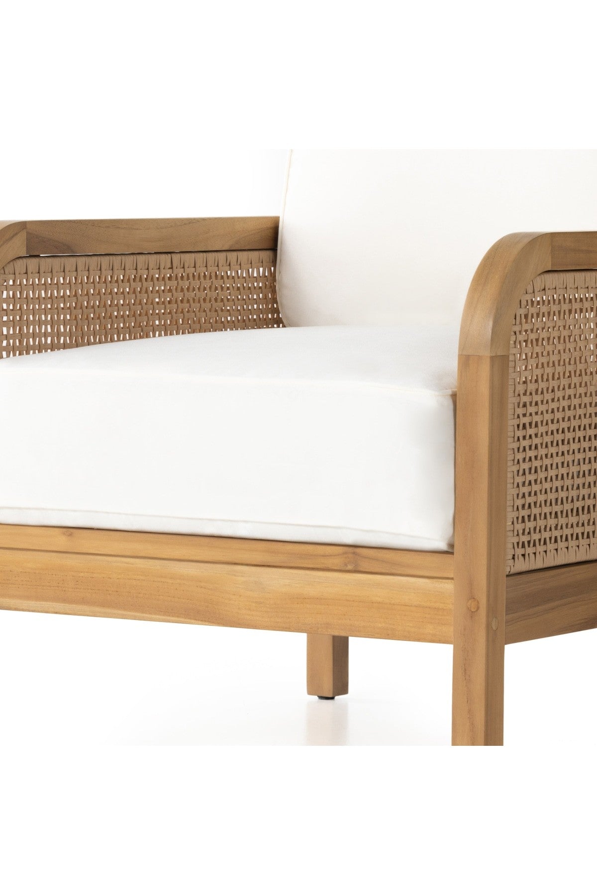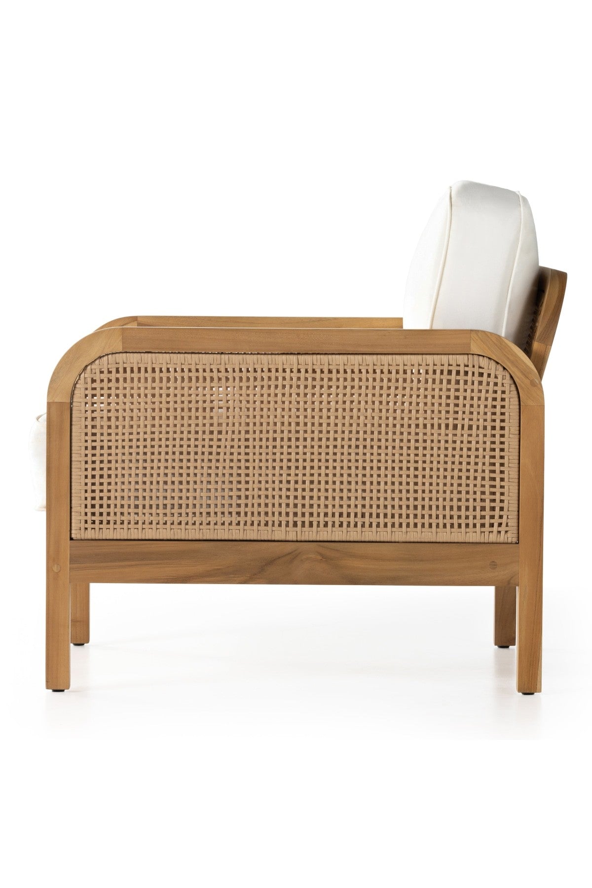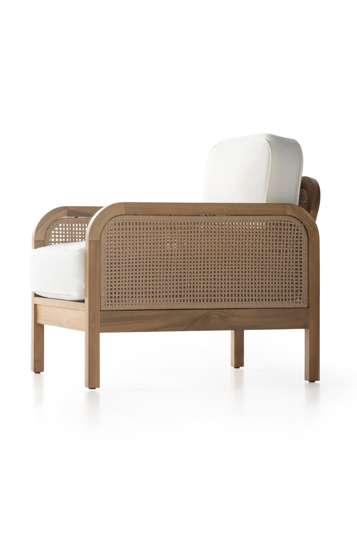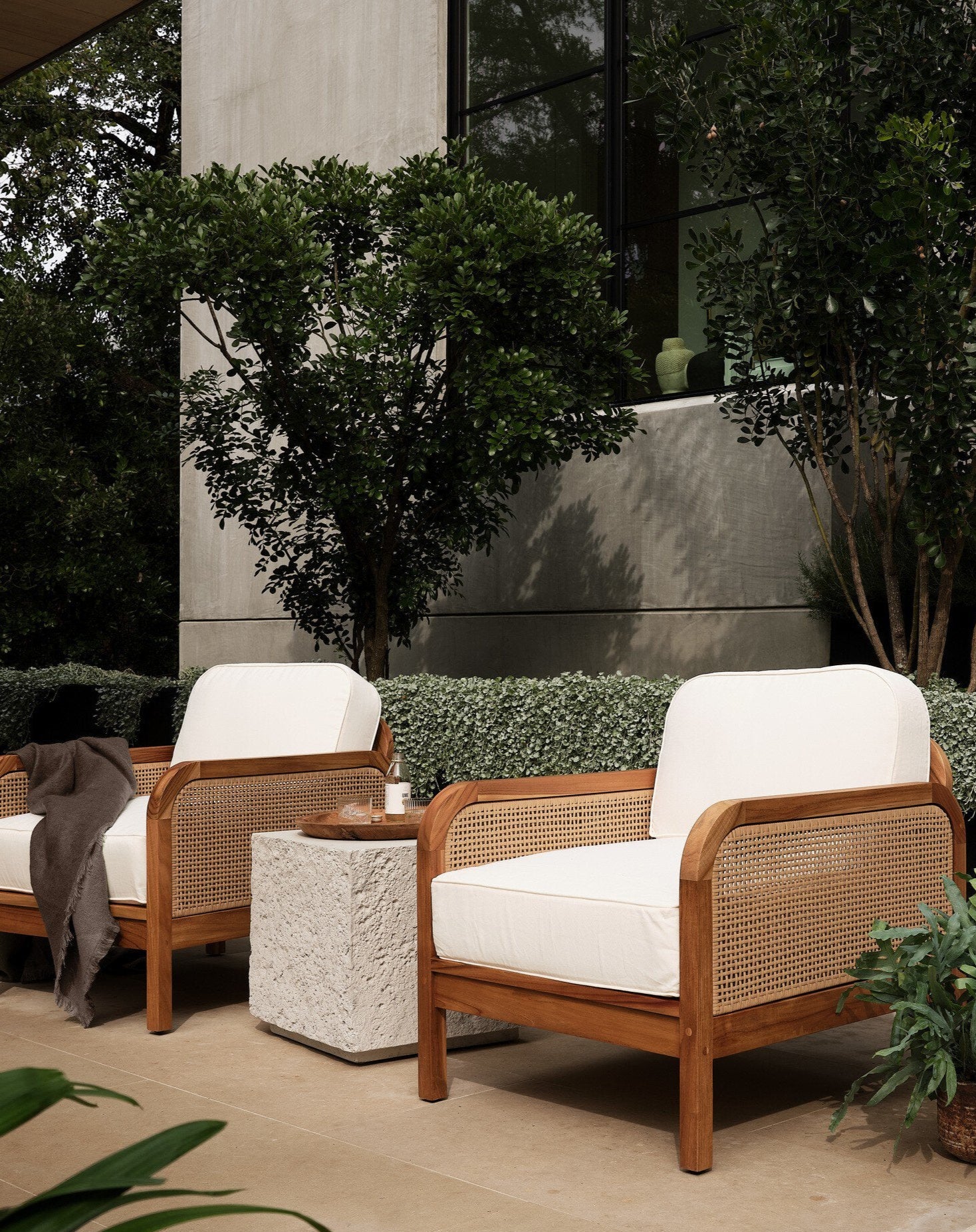 Meet the Merit Outdoor Chair. The cane trend moves outdoors. Rattan-inspired woven panels accent a rounded frame crafted of FSC-certified teak. Thick rounded edge cushioning is covered in 100% Olefin, known for its UV-resistant, water-repellent, quick-drying abilities. Cover or store indoors during inclement weather and when not in use.