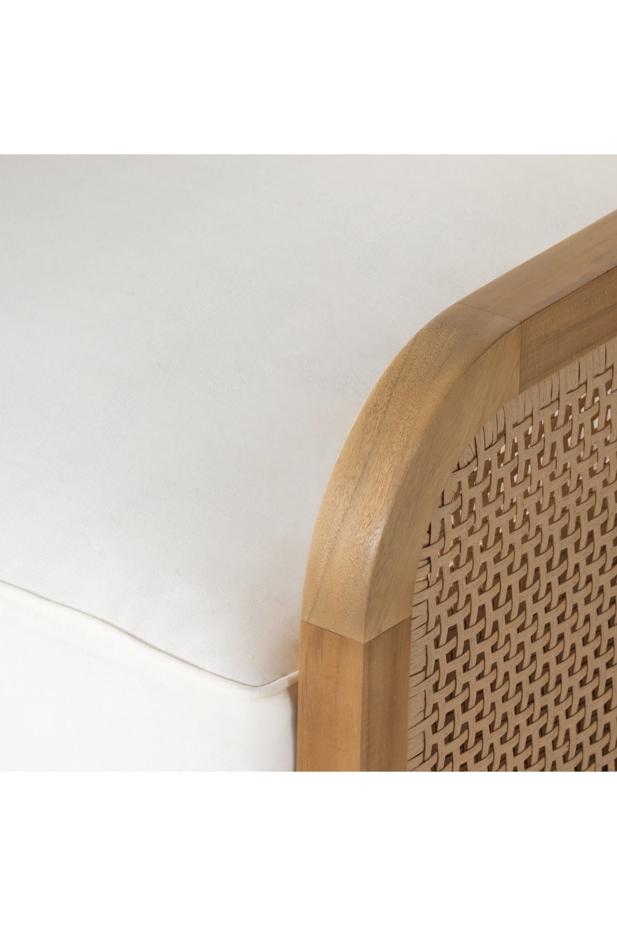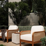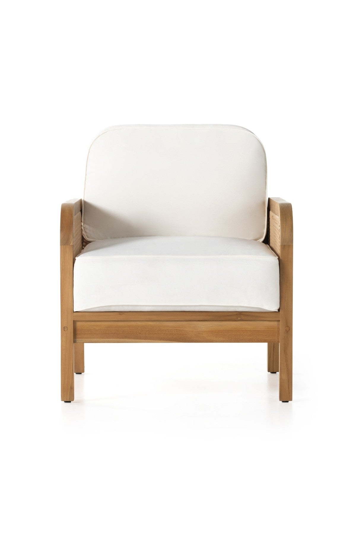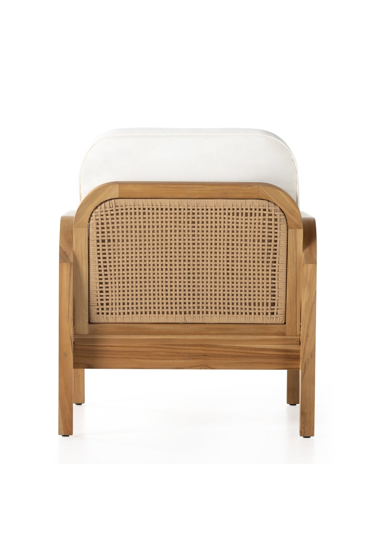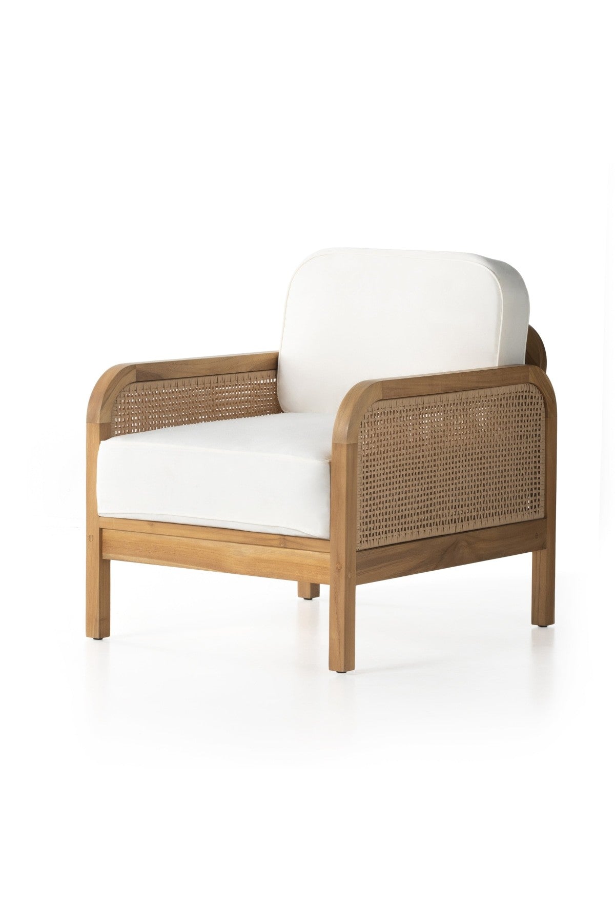 Meet the Merit Outdoor Chair. The cane trend moves outdoors. Rattan-inspired woven panels accent a rounded frame crafted of FSC-certified teak. Thick rounded edge cushioning is covered in 100% Olefin, known for its UV-resistant, water-repellent, quick-drying abilities. Cover or store indoors during inclement weather and when not in use.