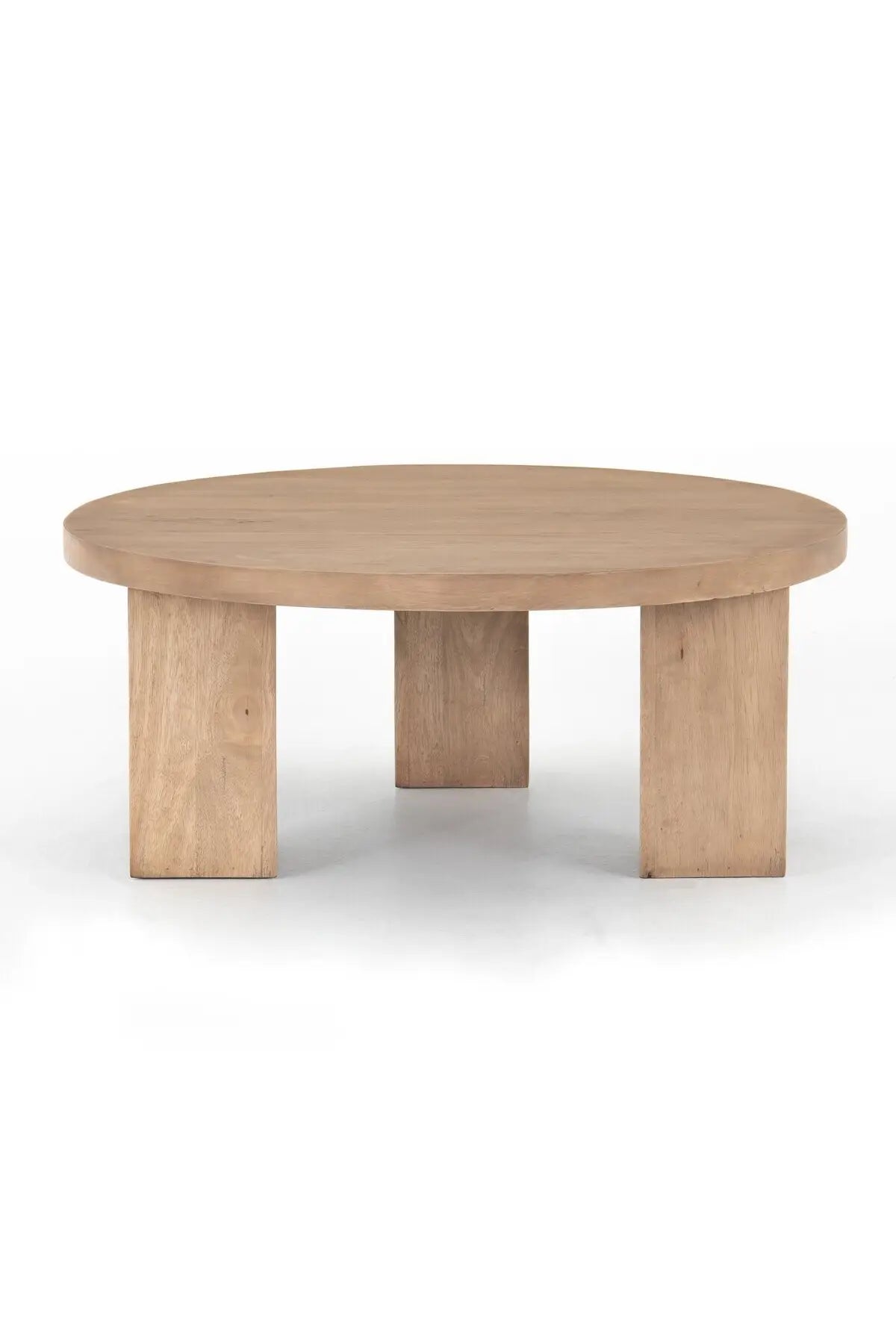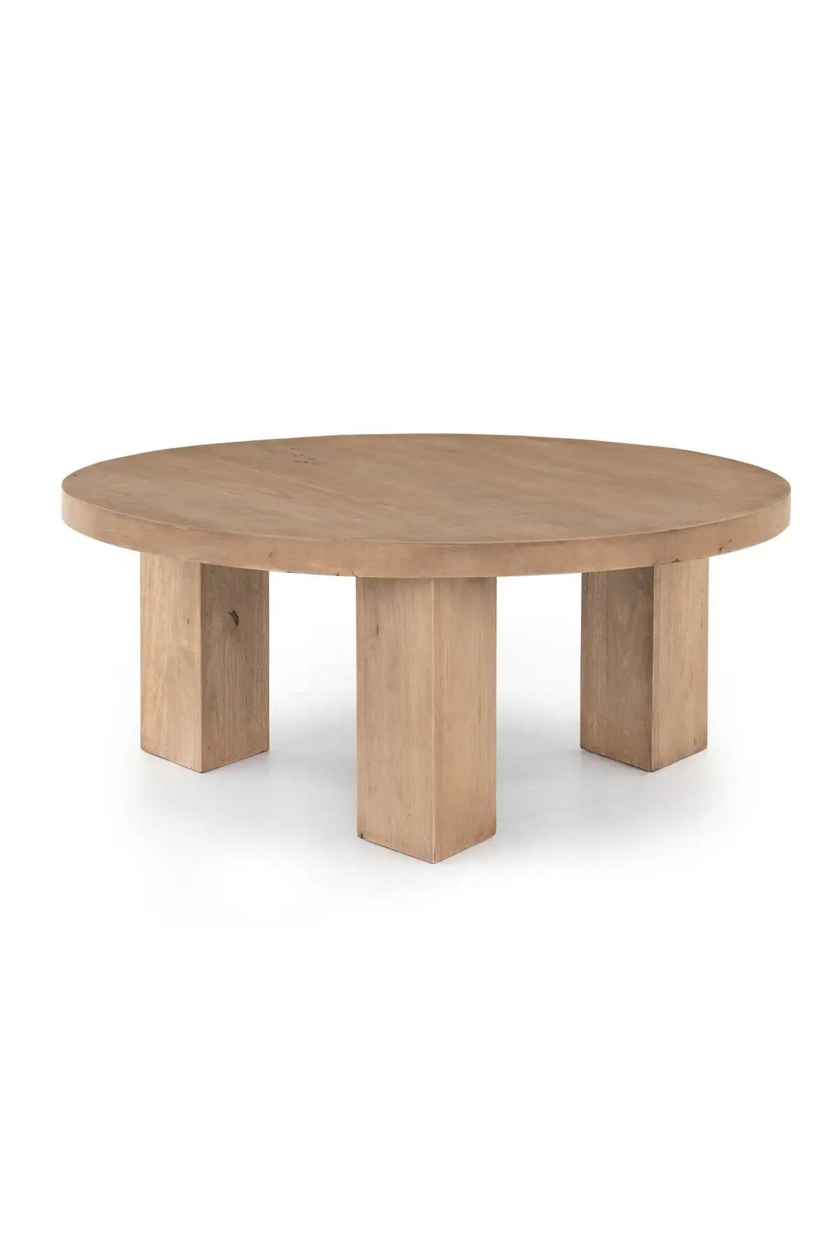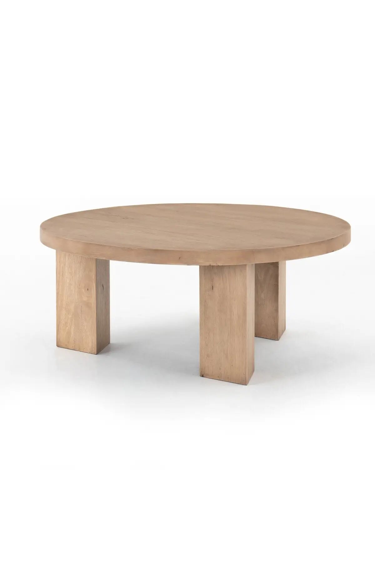Meet the Mesa Round Coffee Table. Light-brushed parawood forms a rounded tabletop, with thick, triangular pedestal legs inspired by modern European design.