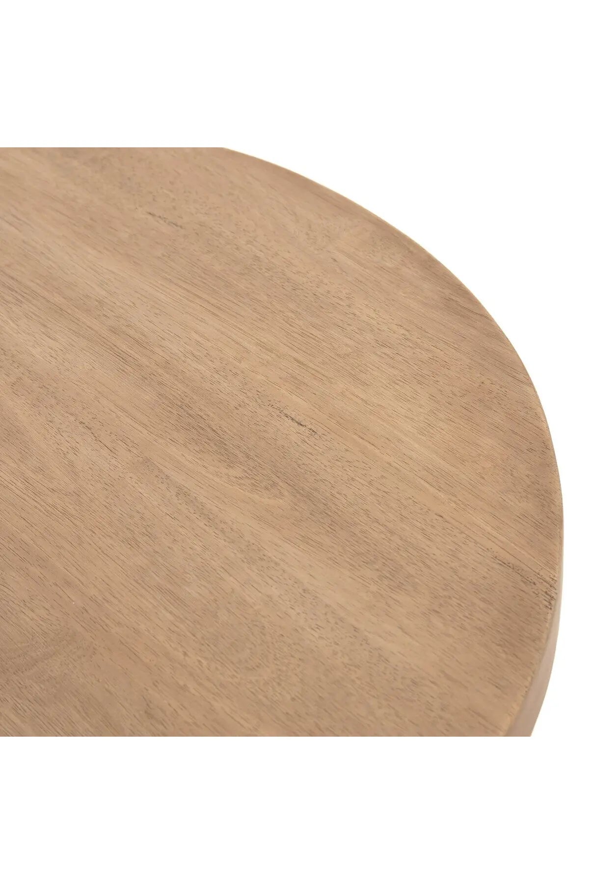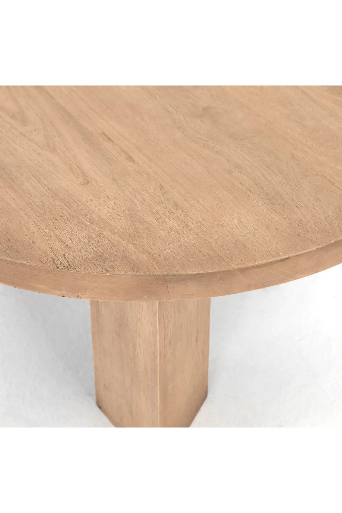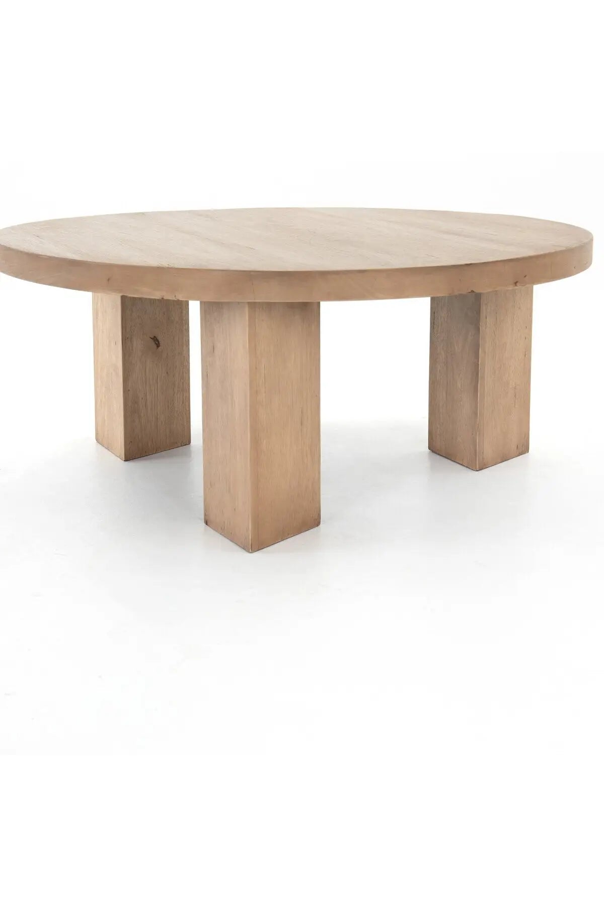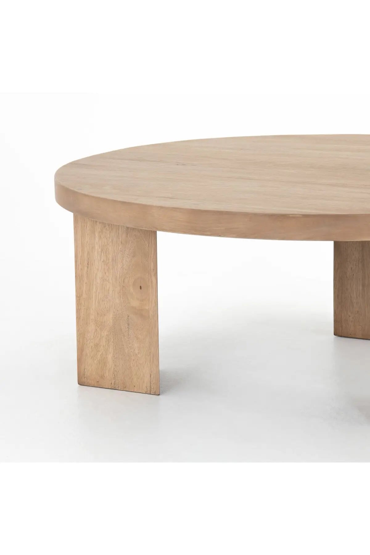 Meet the Mesa Round Coffee Table. Light-brushed parawood forms a rounded tabletop, with thick, triangular pedestal legs inspired by modern European design.