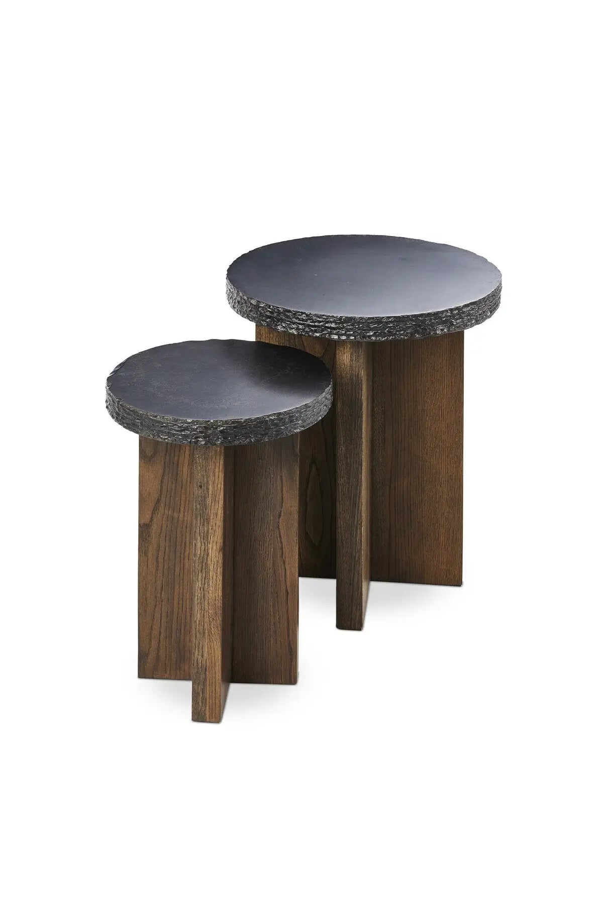 Meet the Mezes Nesting End Table Set. Natural elements and architectural inspiration, captured in a pair of nesting end tables. Rounded basalt tabletops rest on intersecting oak planes in this statement-making pair that lends form and function to the living space.