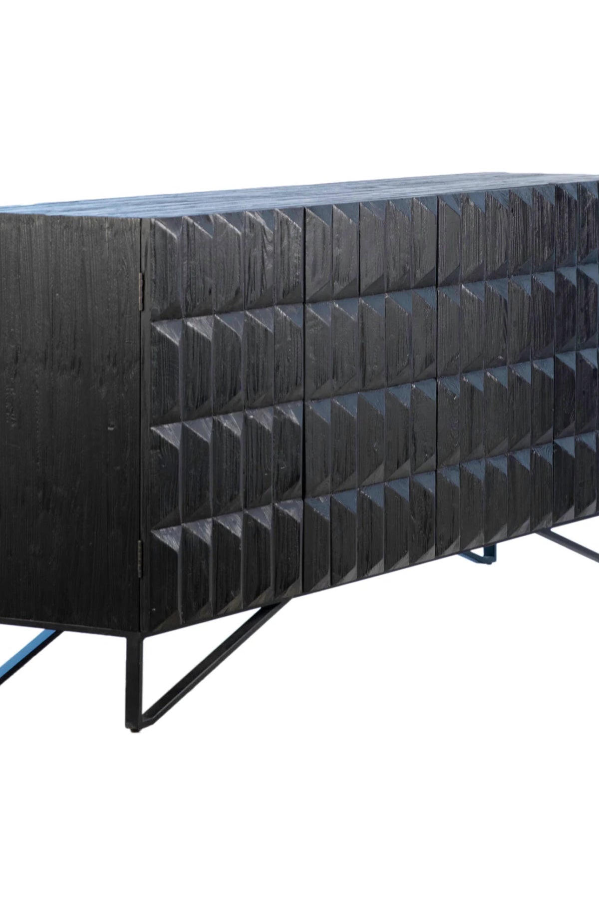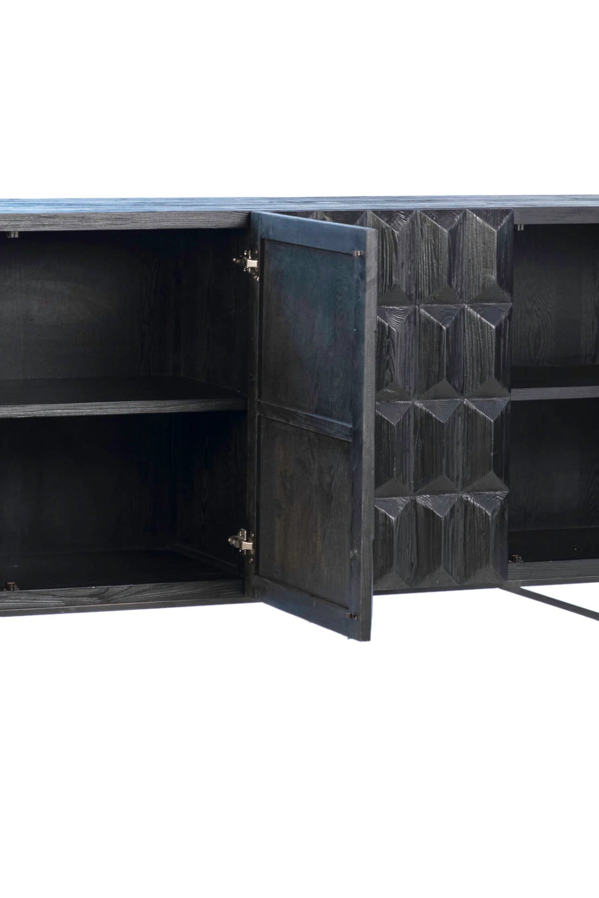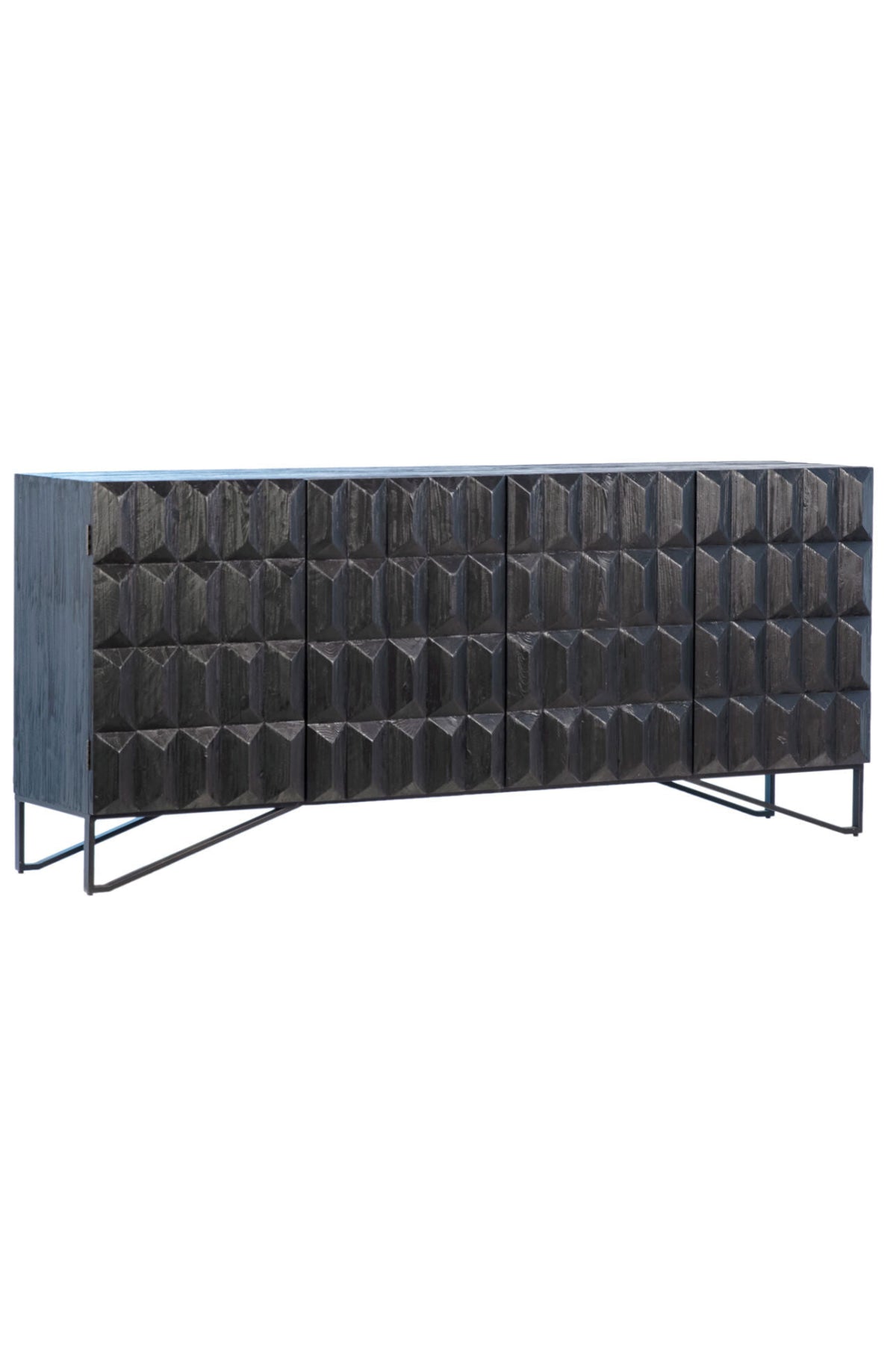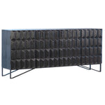 The versatile Montoya Sideboard mixes materials and textures to create a striking design. Made from reclaimed pine wood in an edgy antique black finish. Featuring a stunning hand-carved design on each of the four doors that open to find two built-in shelves for added storage. Sitting atop a black metal base for extra support, this sideboard is equal parts durable, functional, and stylish.