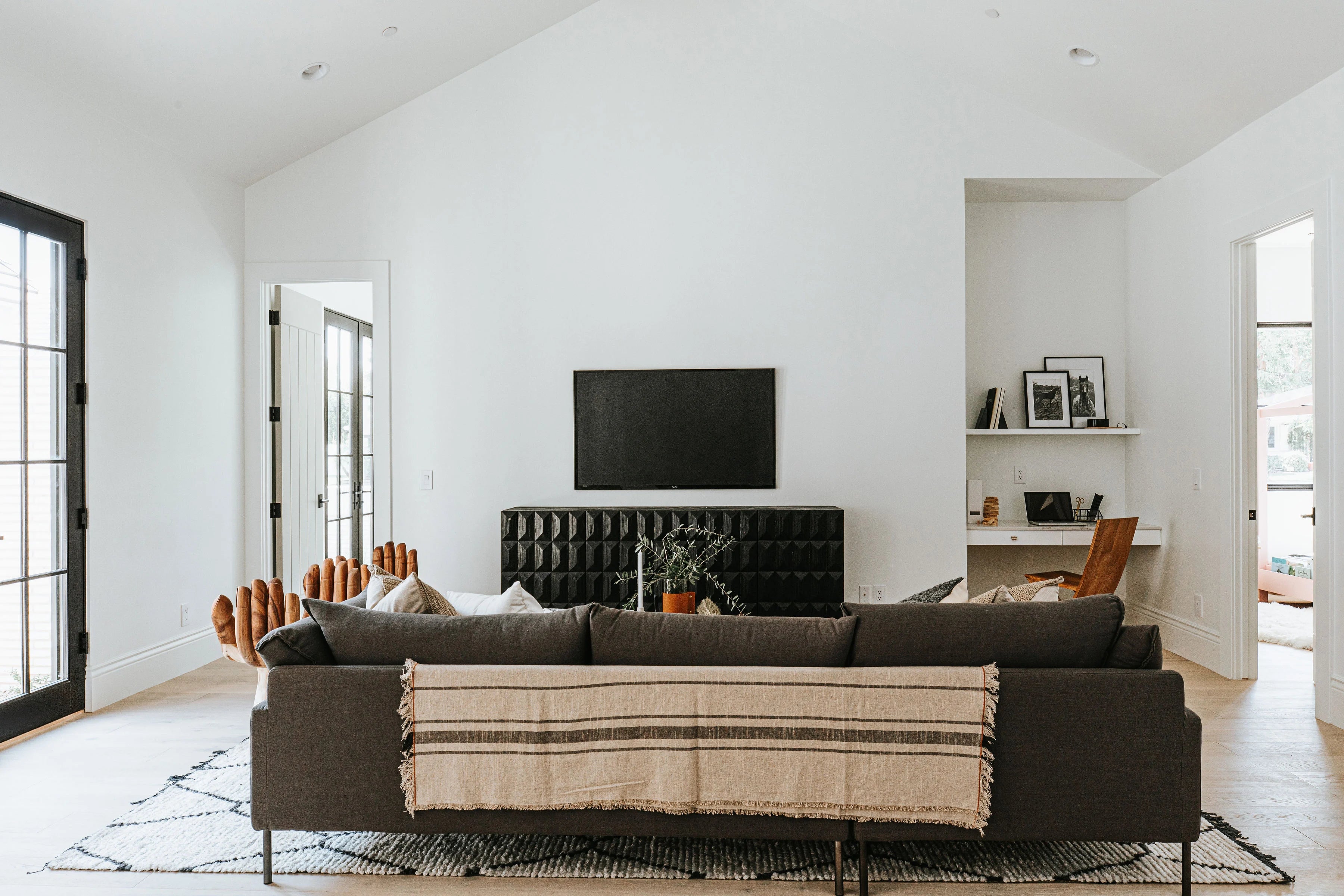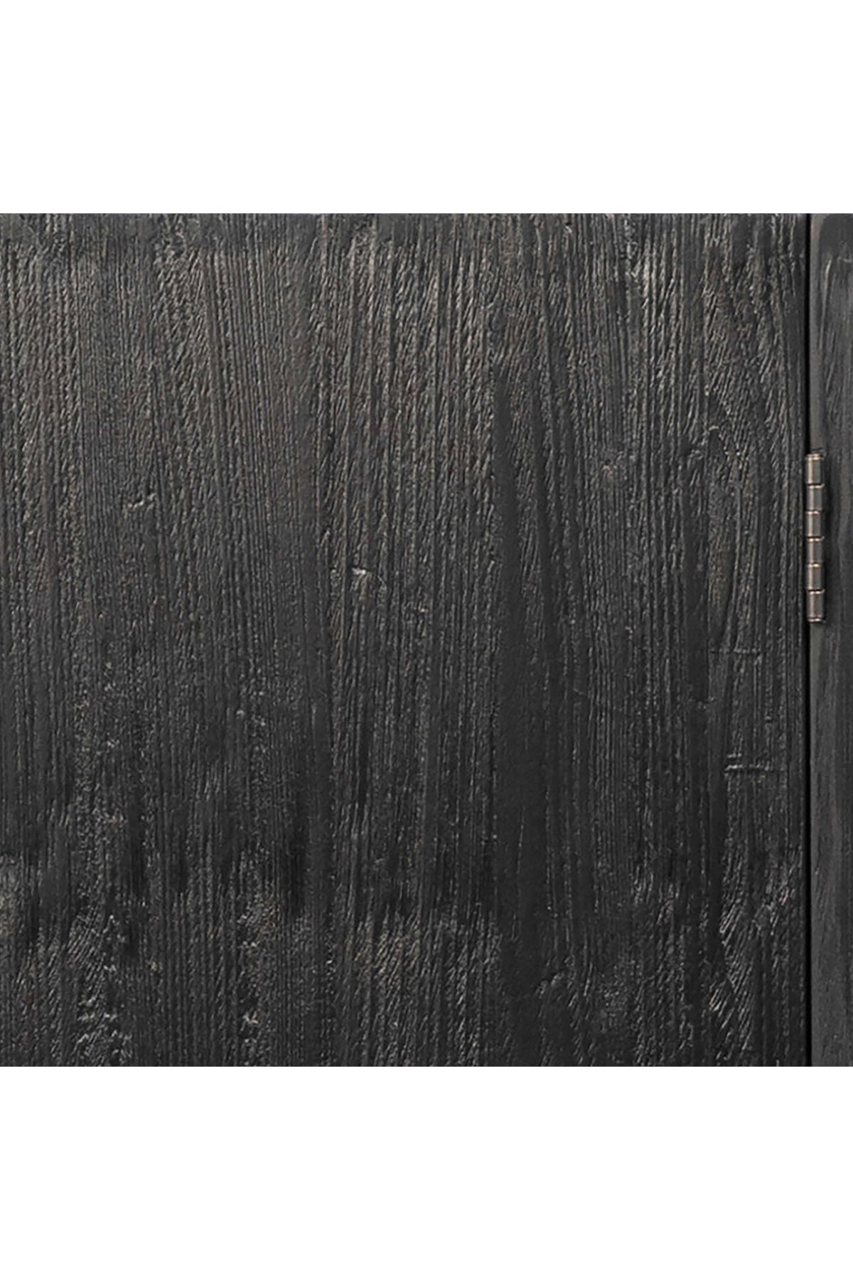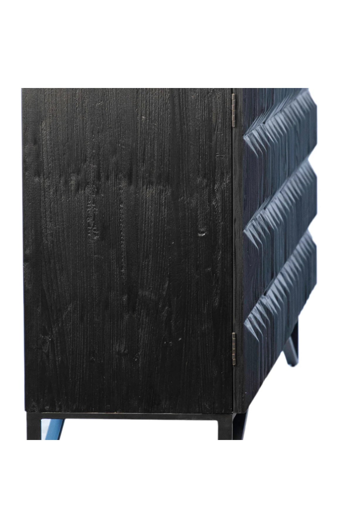 The versatile Montoya Sideboard mixes materials and textures to create a striking design. Made from reclaimed pine wood in an edgy antique black finish. Featuring a stunning hand-carved design on each of the four doors that open to find two built-in shelves for added storage. Sitting atop a black metal base for extra support, this sideboard is equal parts durable, functional, and stylish.