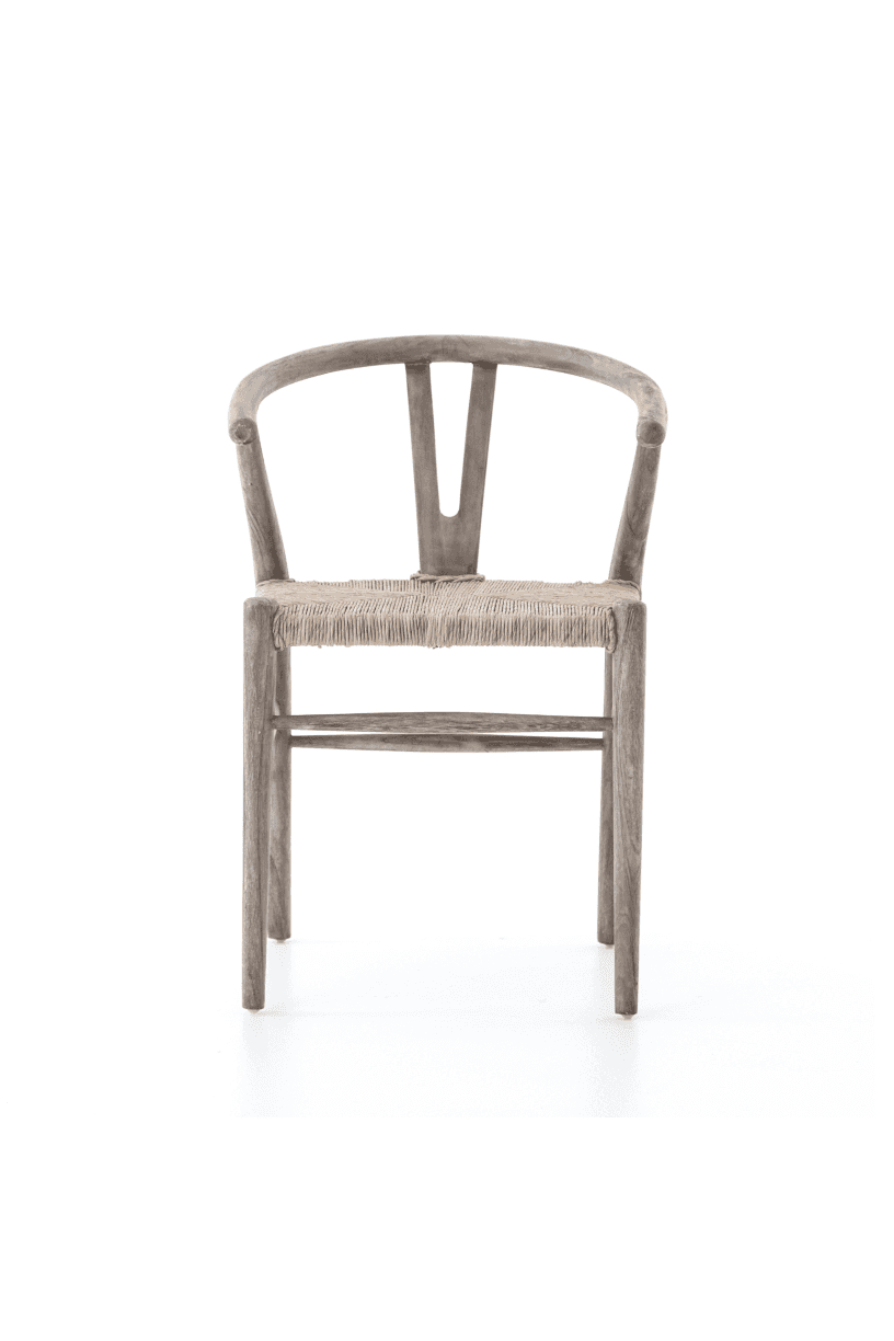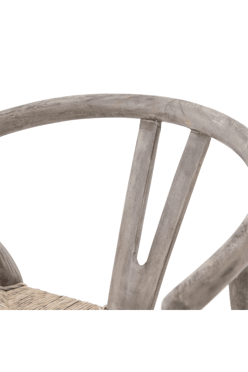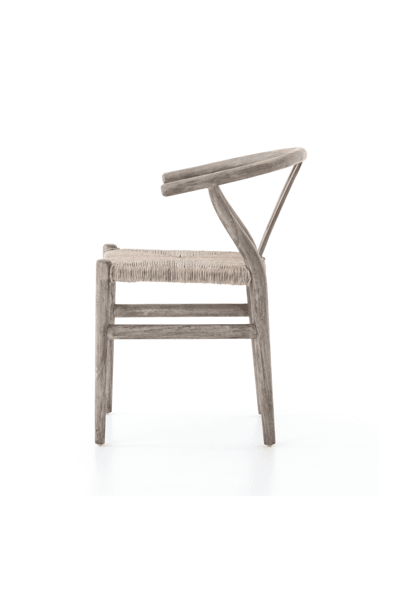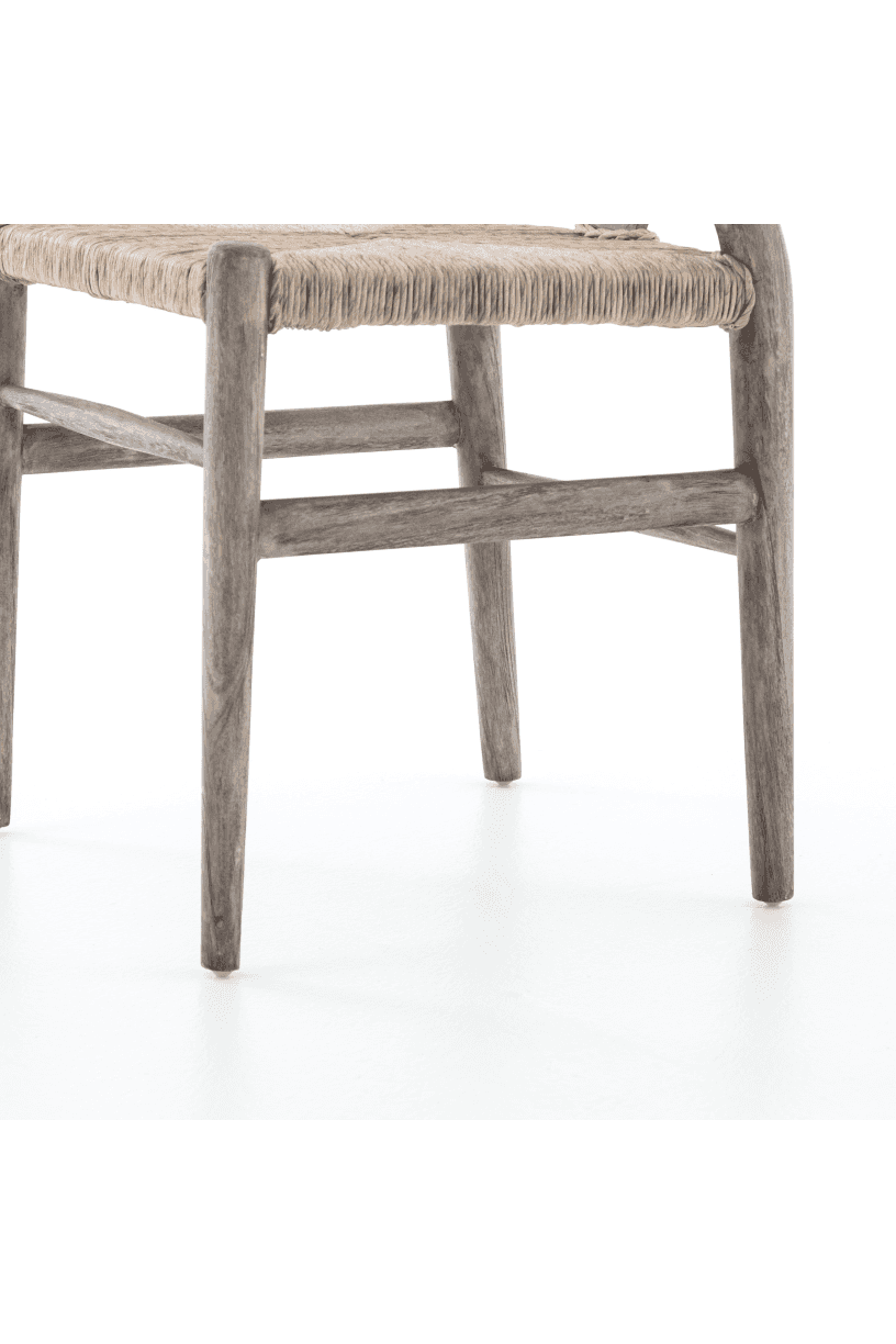 Meet the Muestra Dining Chair. Modern curves redefine the classic wishbone-style seating. Vintage white, all-weather wicker is woven for a dose of fresh texture against a neutral frame of natural teak. Cover or store indoors during inclement weather and when not in use.