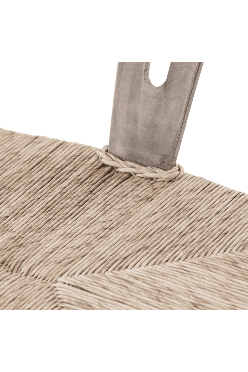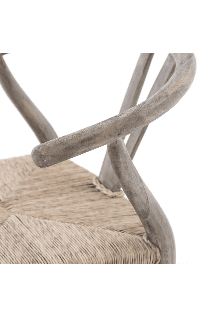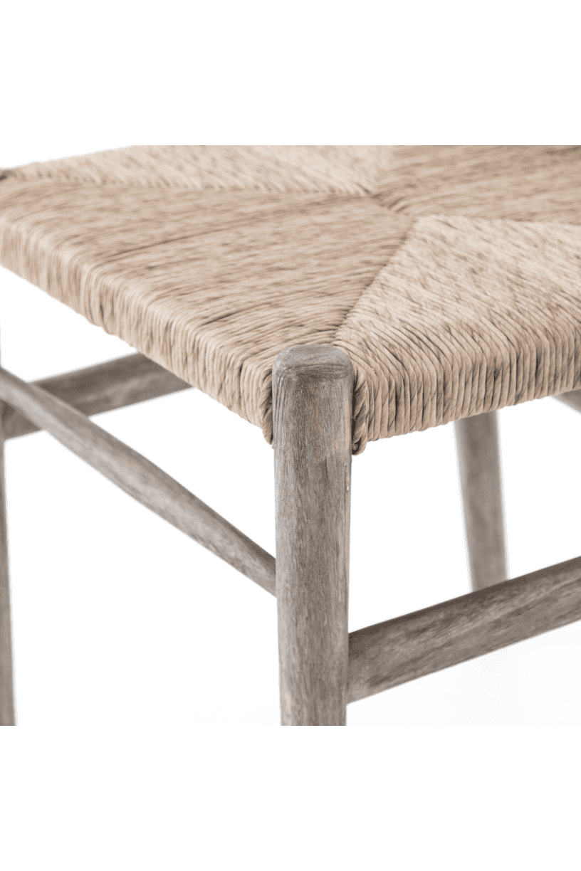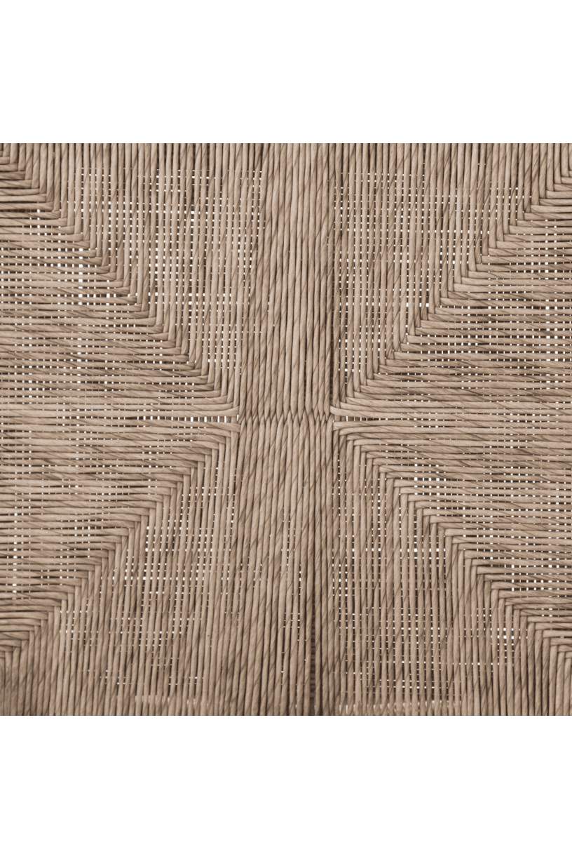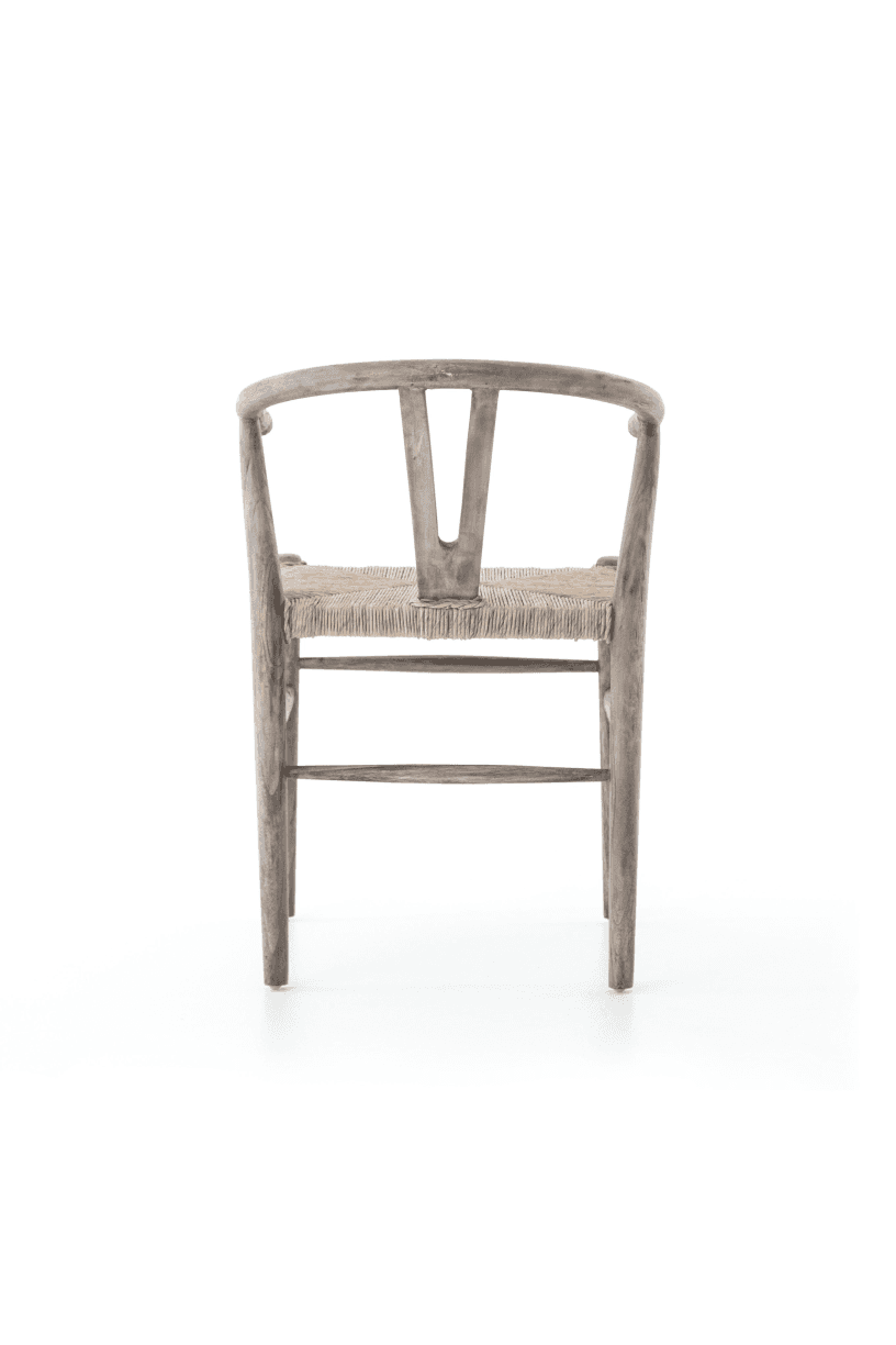 Meet the Muestra Dining Chair. Modern curves redefine the classic wishbone-style seating. Vintage white, all-weather wicker is woven for a dose of fresh texture against a neutral frame of natural teak. Cover or store indoors during inclement weather and when not in use.