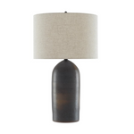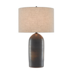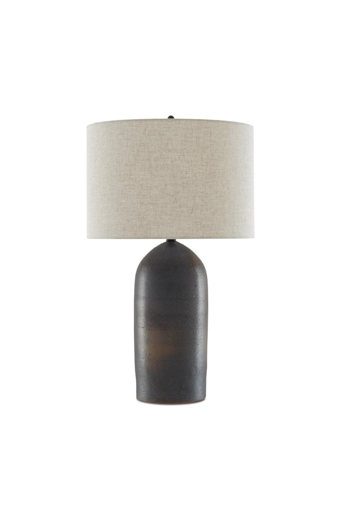 The torpedo-shaped body of the Munby Table Lamp has subtle variations in texture. Made of rust-colored and iron-hued ceramic, dark grey tones dominate on the lamp's body with rust patches showing through. Metal hardware in a semi-glossy black finish and a matching finial secure the natural linen shade to the grey lamp. Bulb(s) not included.