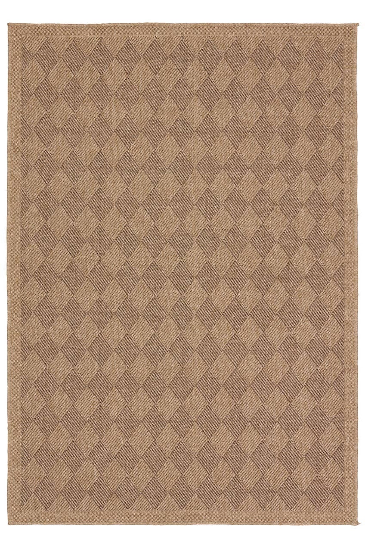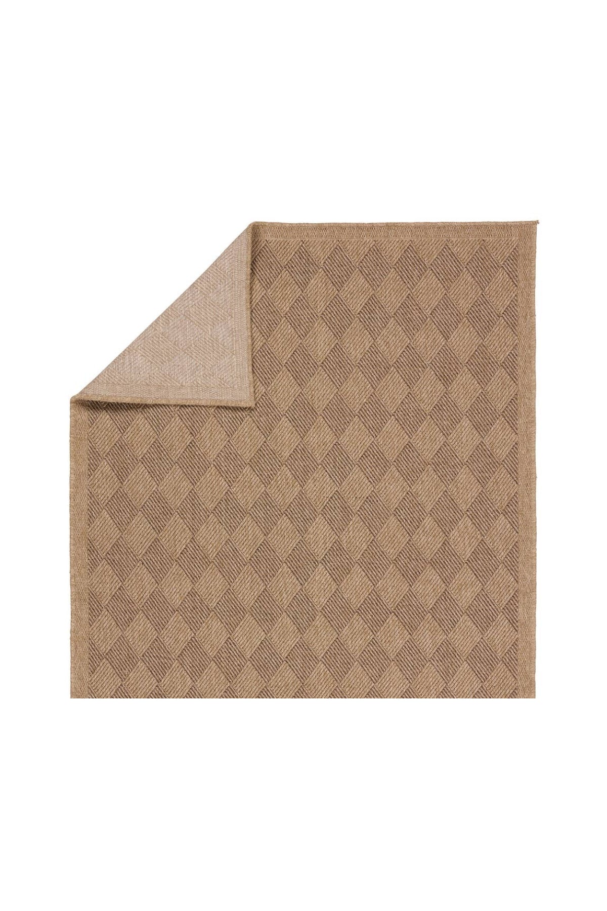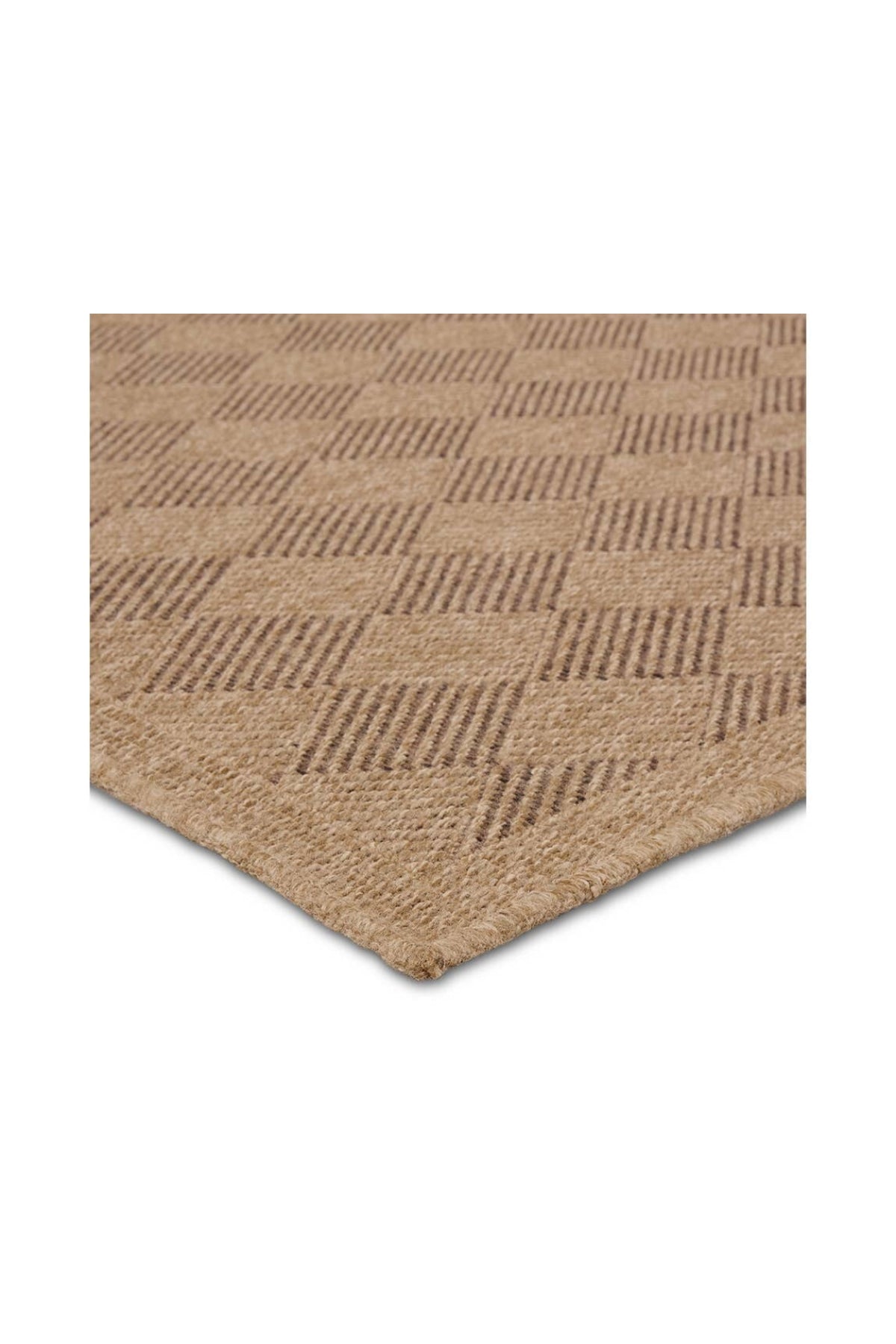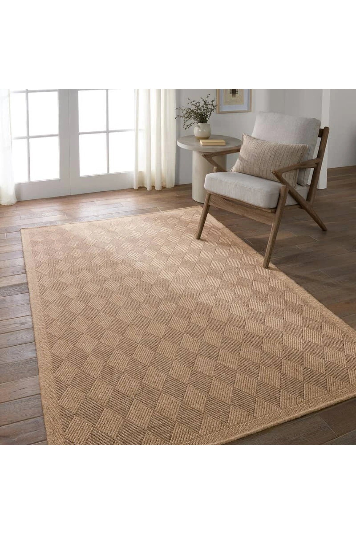Grounding and impressively versatile, the Nambe Rug features a durable, weather-resistant quality that mimics flatwoven natural looks. Emanating the classic colors of grass fibers, this assortment of indoor-outdoor rugs boasts a warm neutral palette. The Nambe Rug features a checkboard design and matching border in various brown tones.