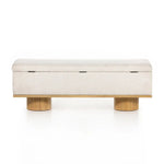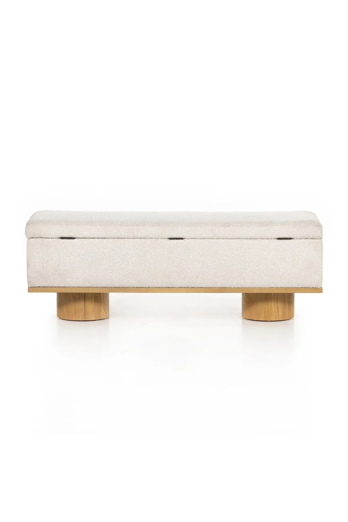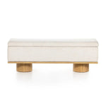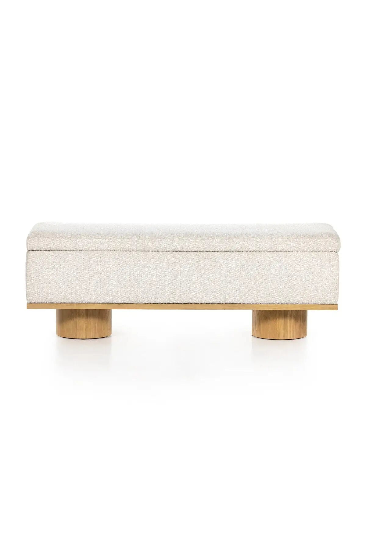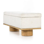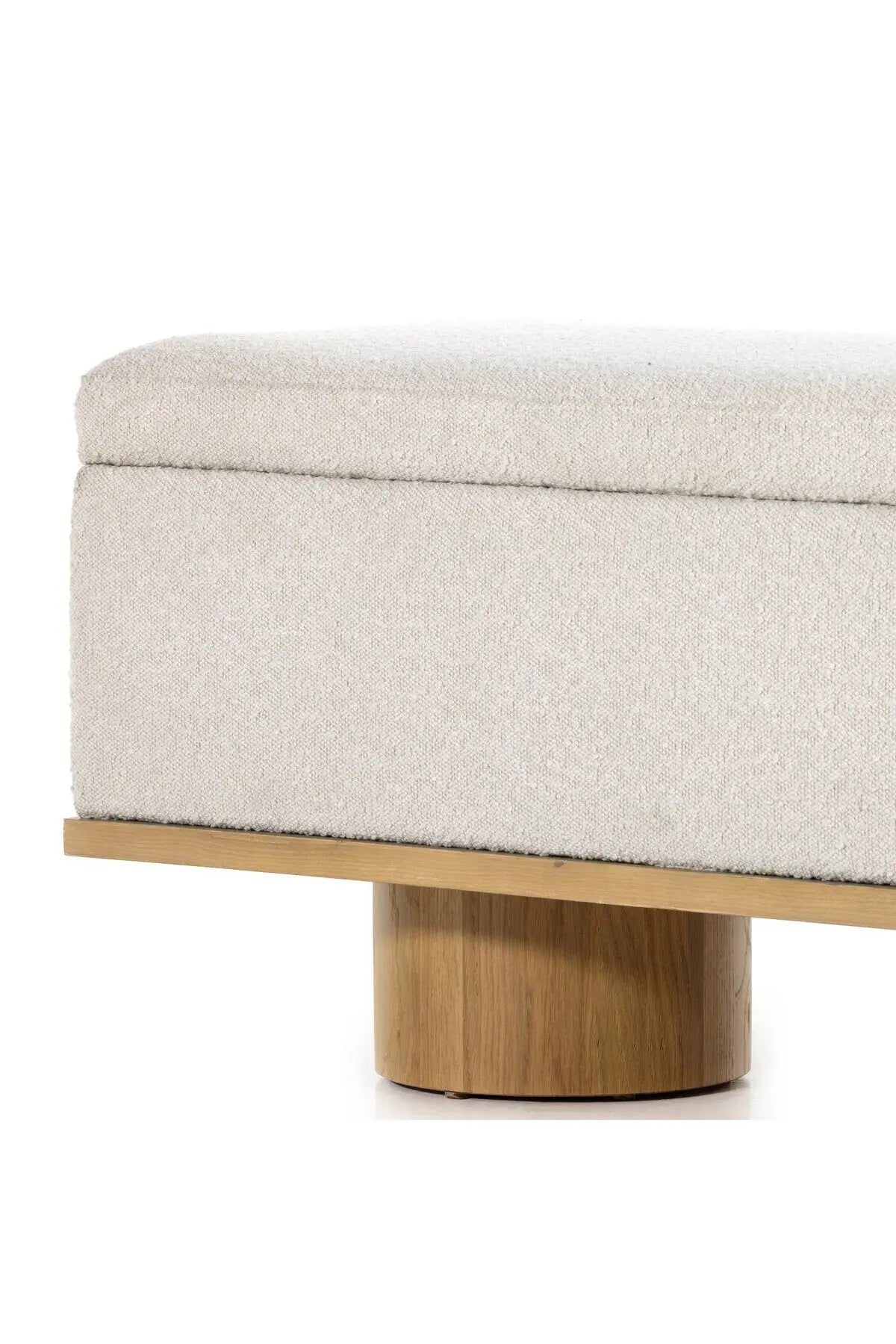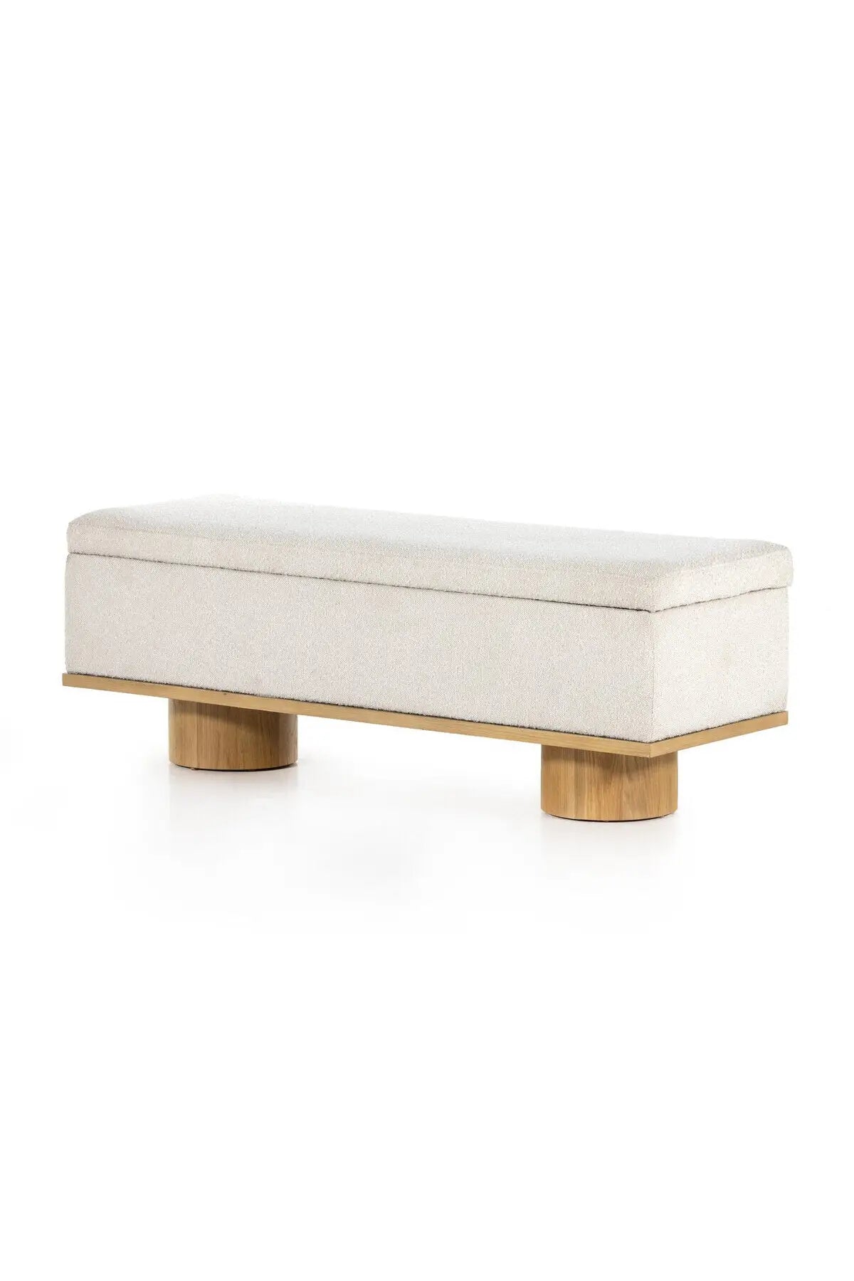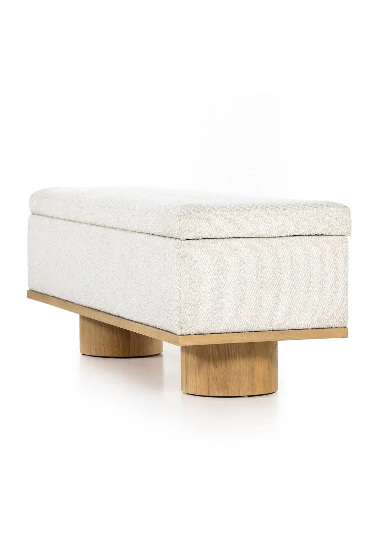 Meet the Navi Trunk. Bring stylish storage space to the bedroom and beyond. Large, cylindrical legs of natural-finished solid oak support upholstered bench seating in a cream-colored boucle. Perfect styled in the entryway or at the foot of a bed for extra linens. Performance fabrics are specially created to withstand spills, stains, high traffic and wear, ensuring long-term comfort and unmatched durability.