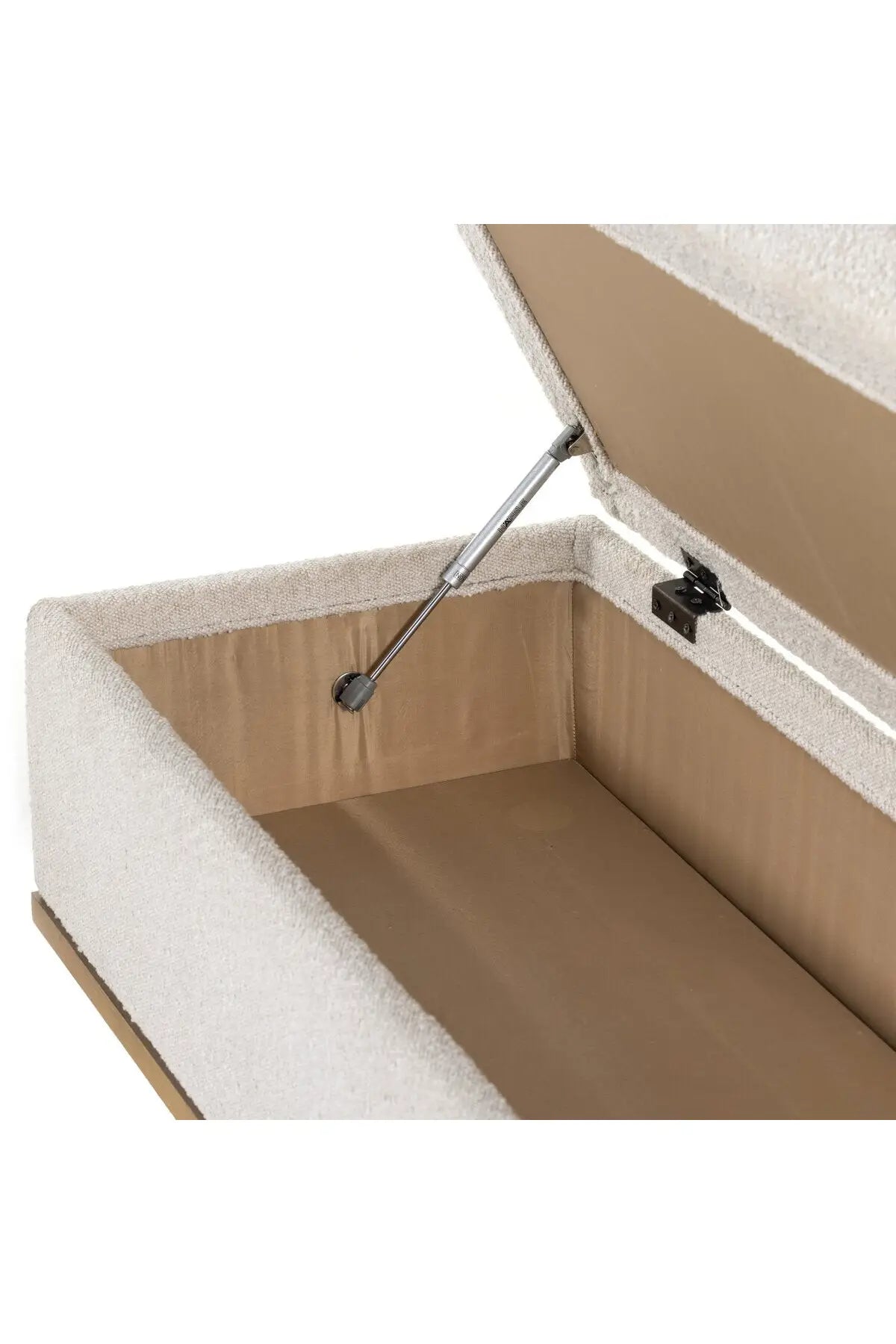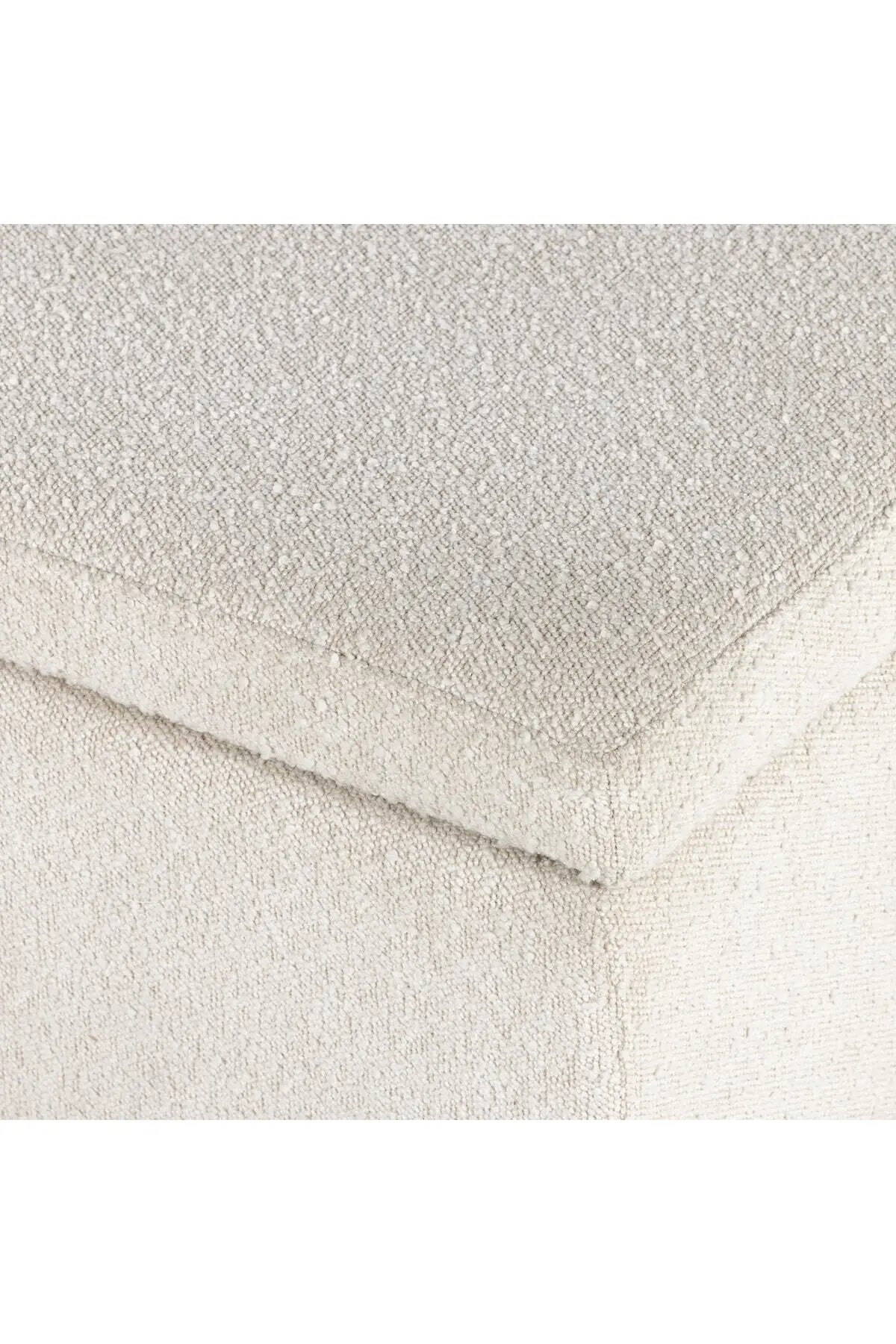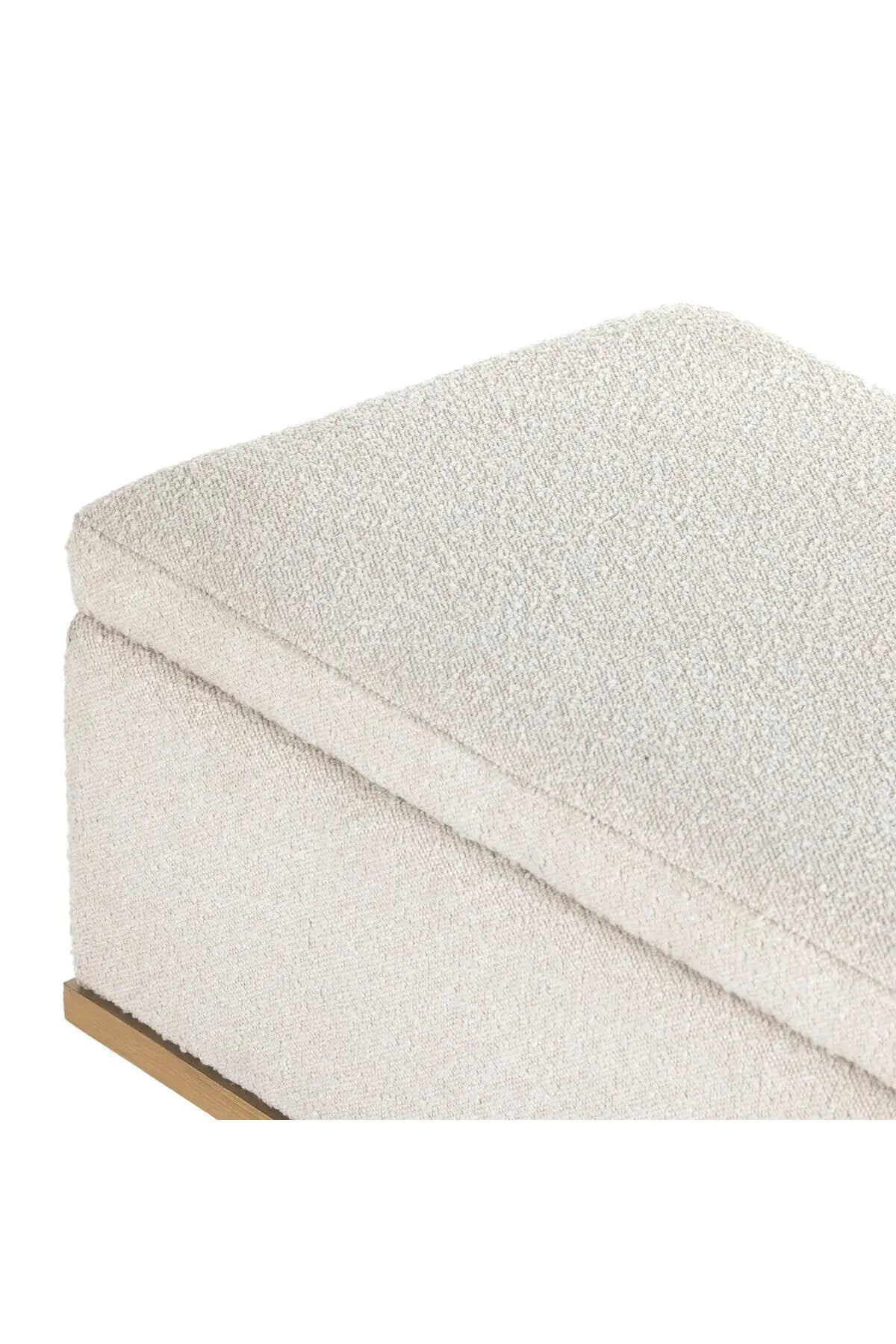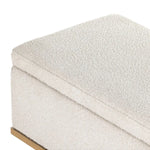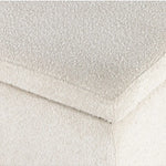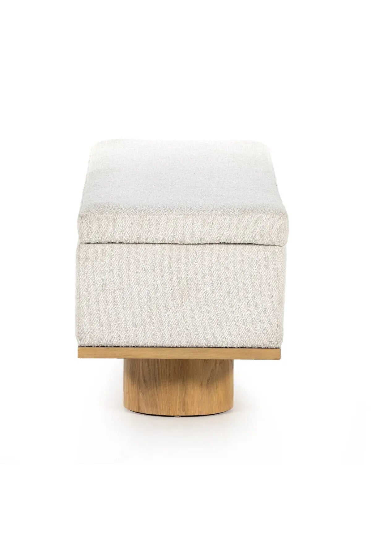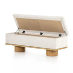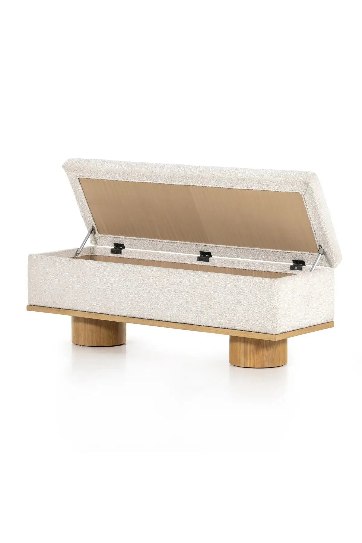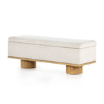 Meet the Navi Trunk. Bring stylish storage space to the bedroom and beyond. Large, cylindrical legs of natural-finished solid oak support upholstered bench seating in a cream-colored boucle. Perfect styled in the entryway or at the foot of a bed for extra linens. Performance fabrics are specially created to withstand spills, stains, high traffic and wear, ensuring long-term comfort and unmatched durability.