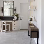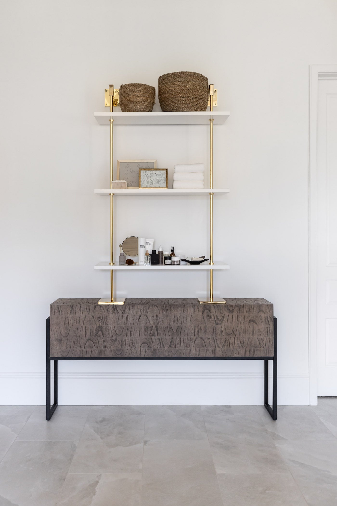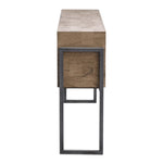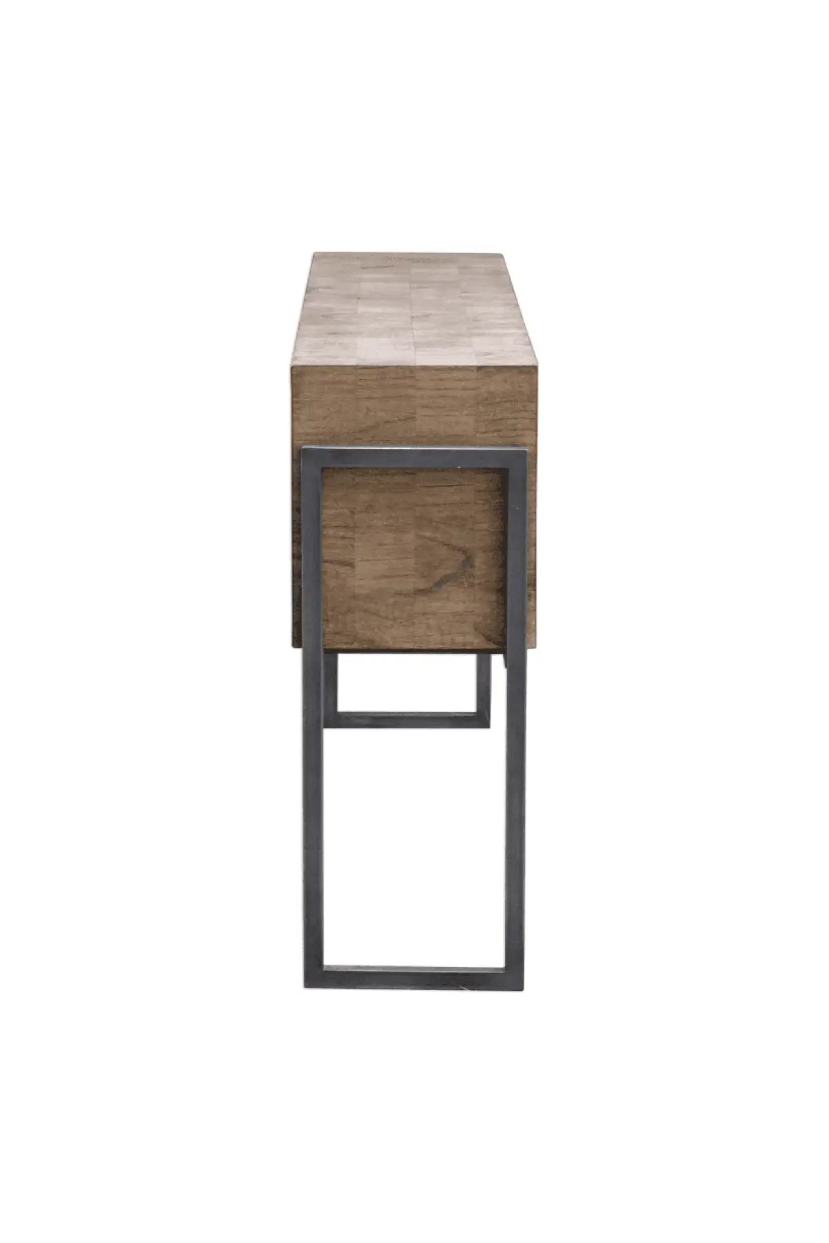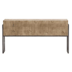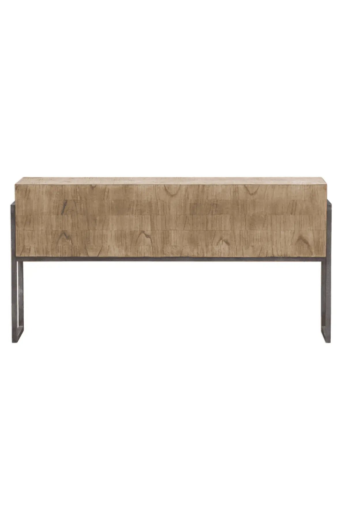 Meet the Nevis Console Table. A clean contemporary accent, featuring mahogany solids with Mindi veneer, finished in a hand applied light oatmeal wash. Veneer is applied in a layered fashion, creating the varying grain patterns on the body, set into an aged iron frame.