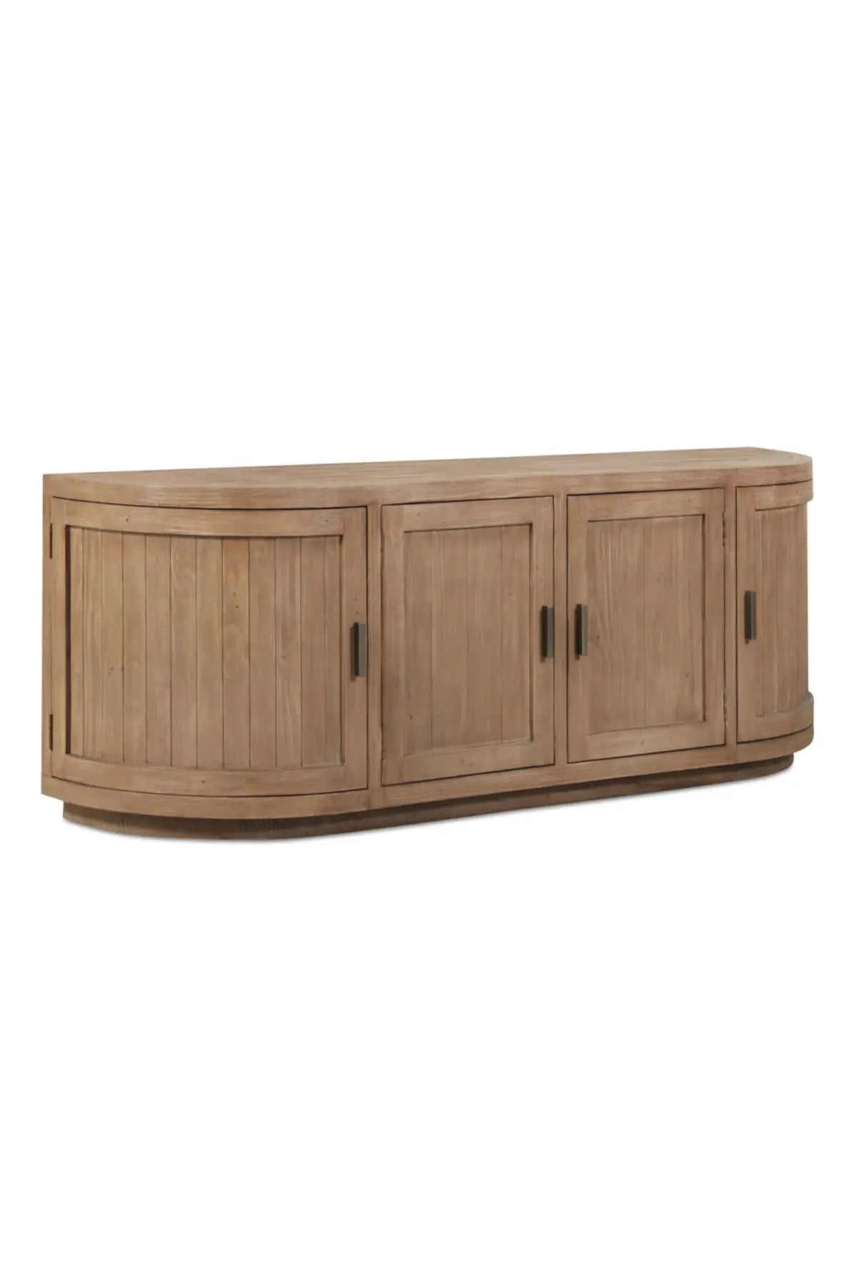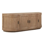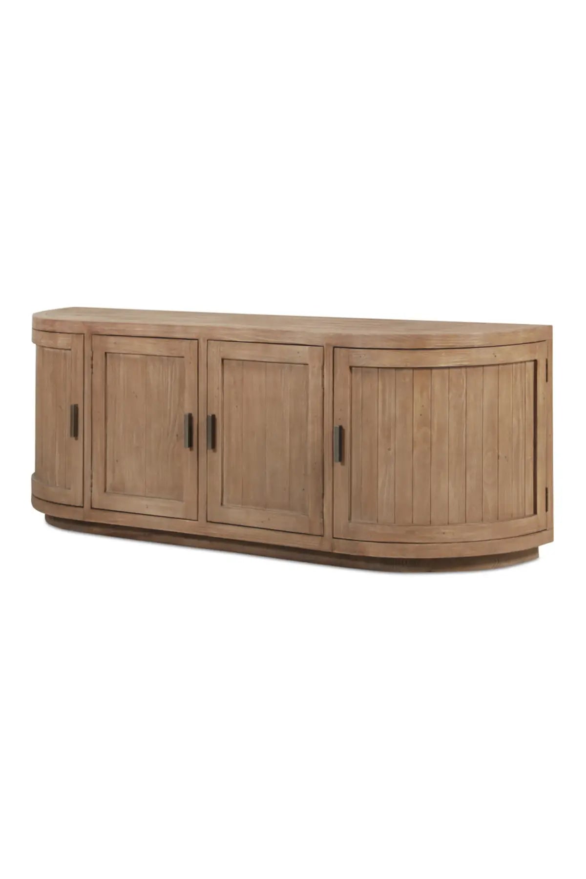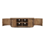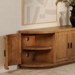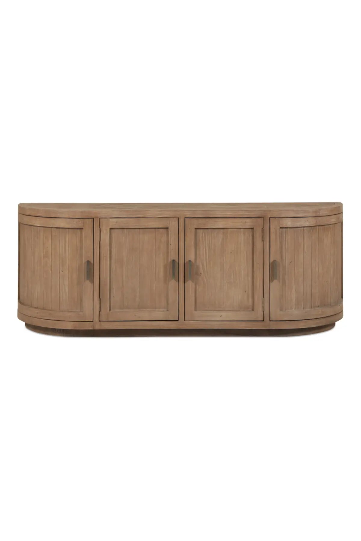 A blend of modern and vintage with its contemporary silhouette, the Nicola Media Cabinet features curved doors that smooth the bold textures of reclaimed wood. Its striking form stands on a recessed base, offering a stark contrast that beautifully complements transitional settings.