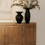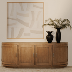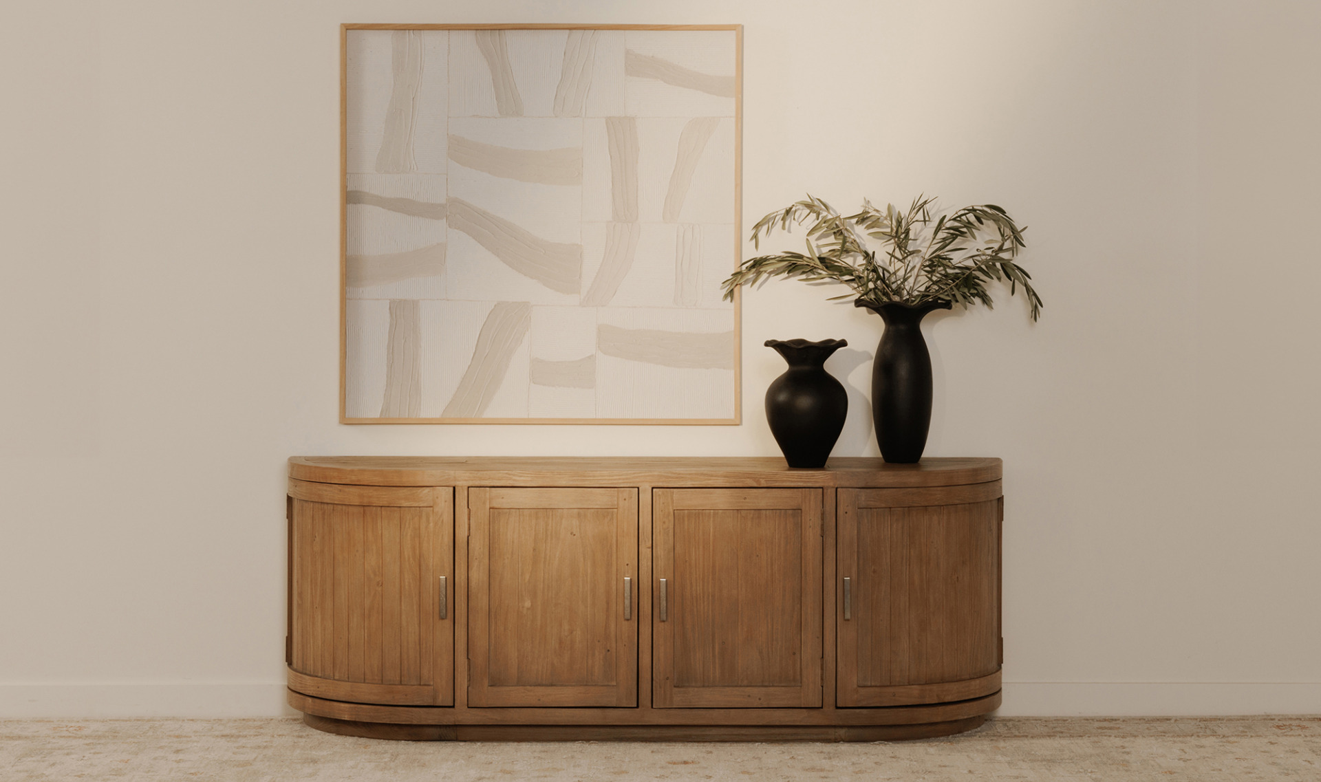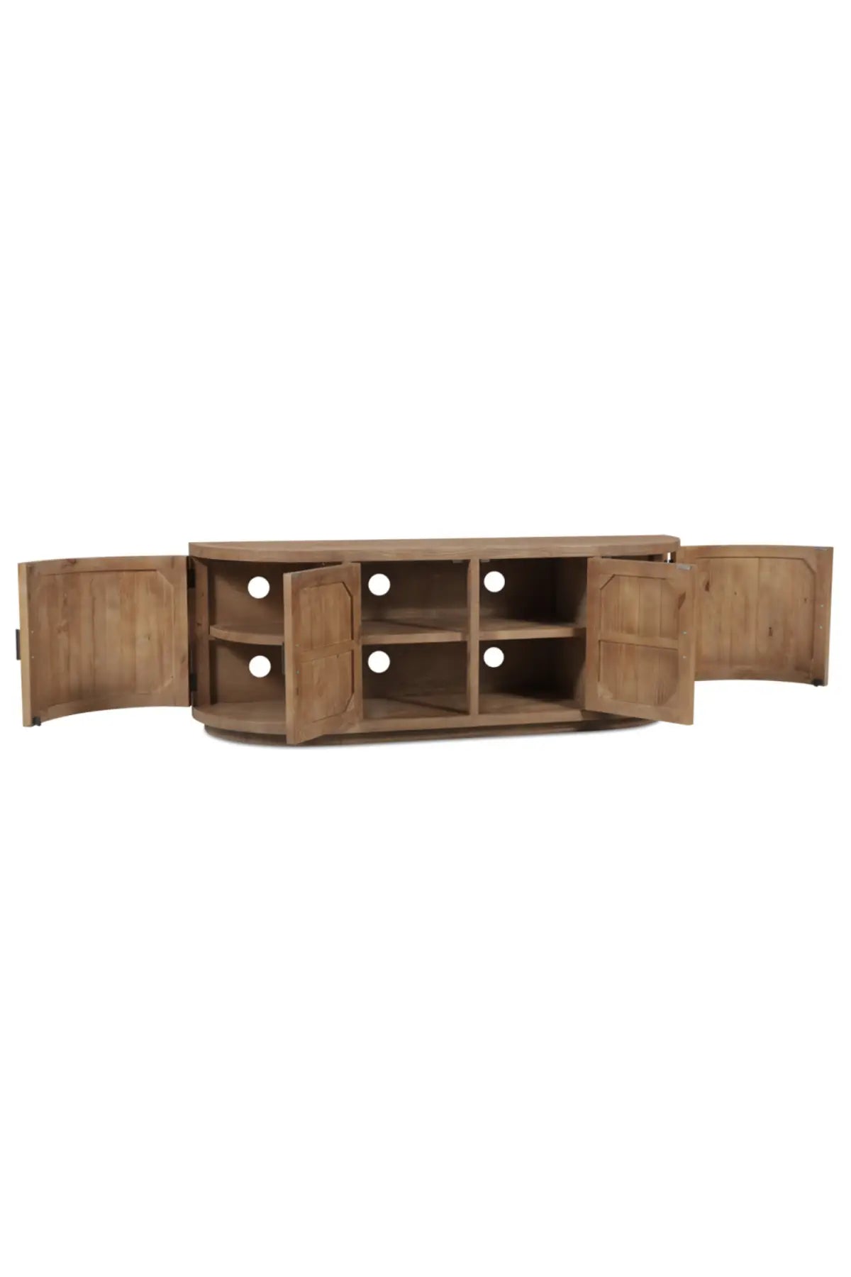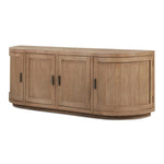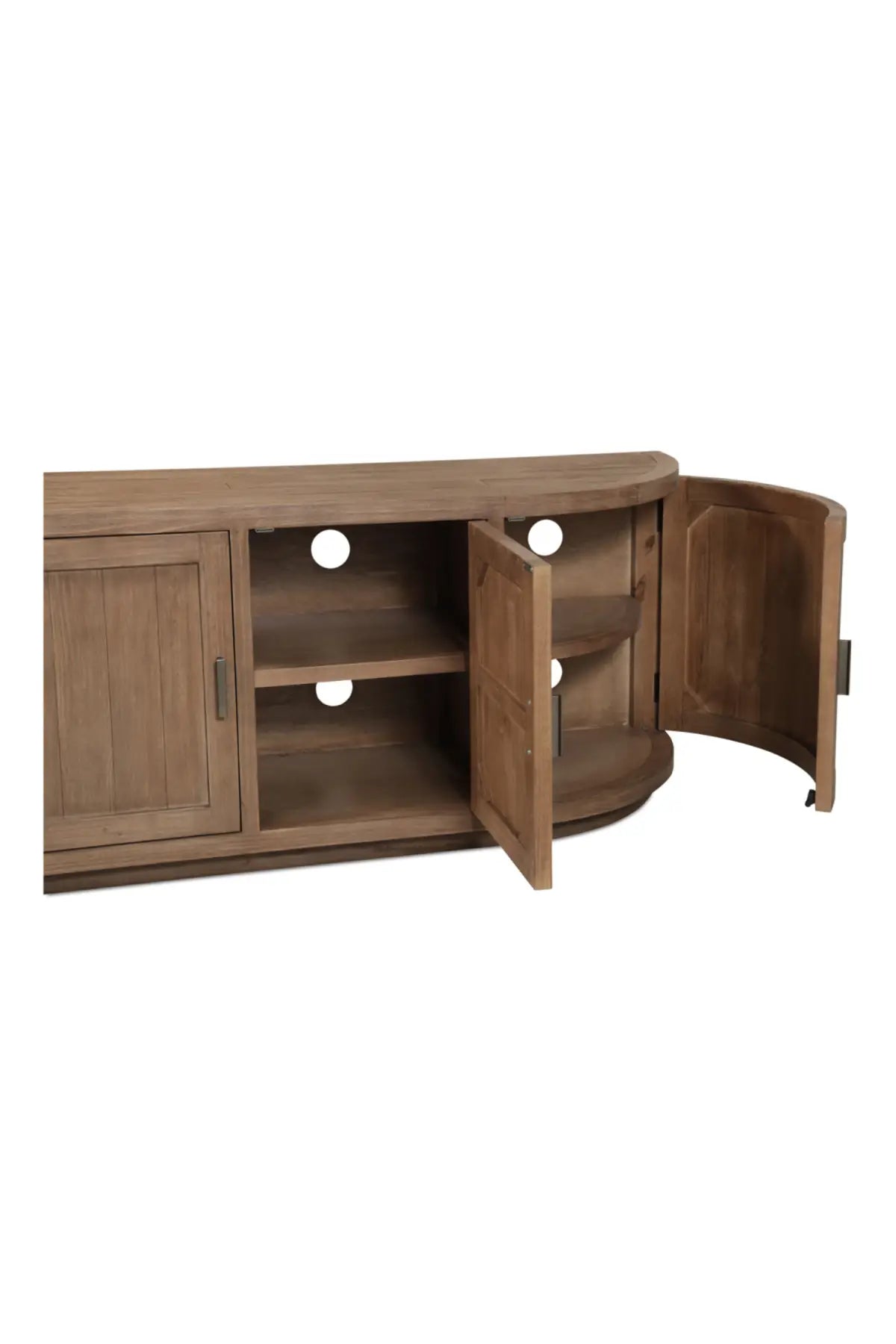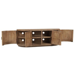 A blend of modern and vintage with its contemporary silhouette, the Nicola Media Cabinet features curved doors that smooth the bold textures of reclaimed wood. Its striking form stands on a recessed base, offering a stark contrast that beautifully complements transitional settings.