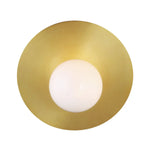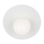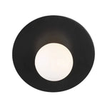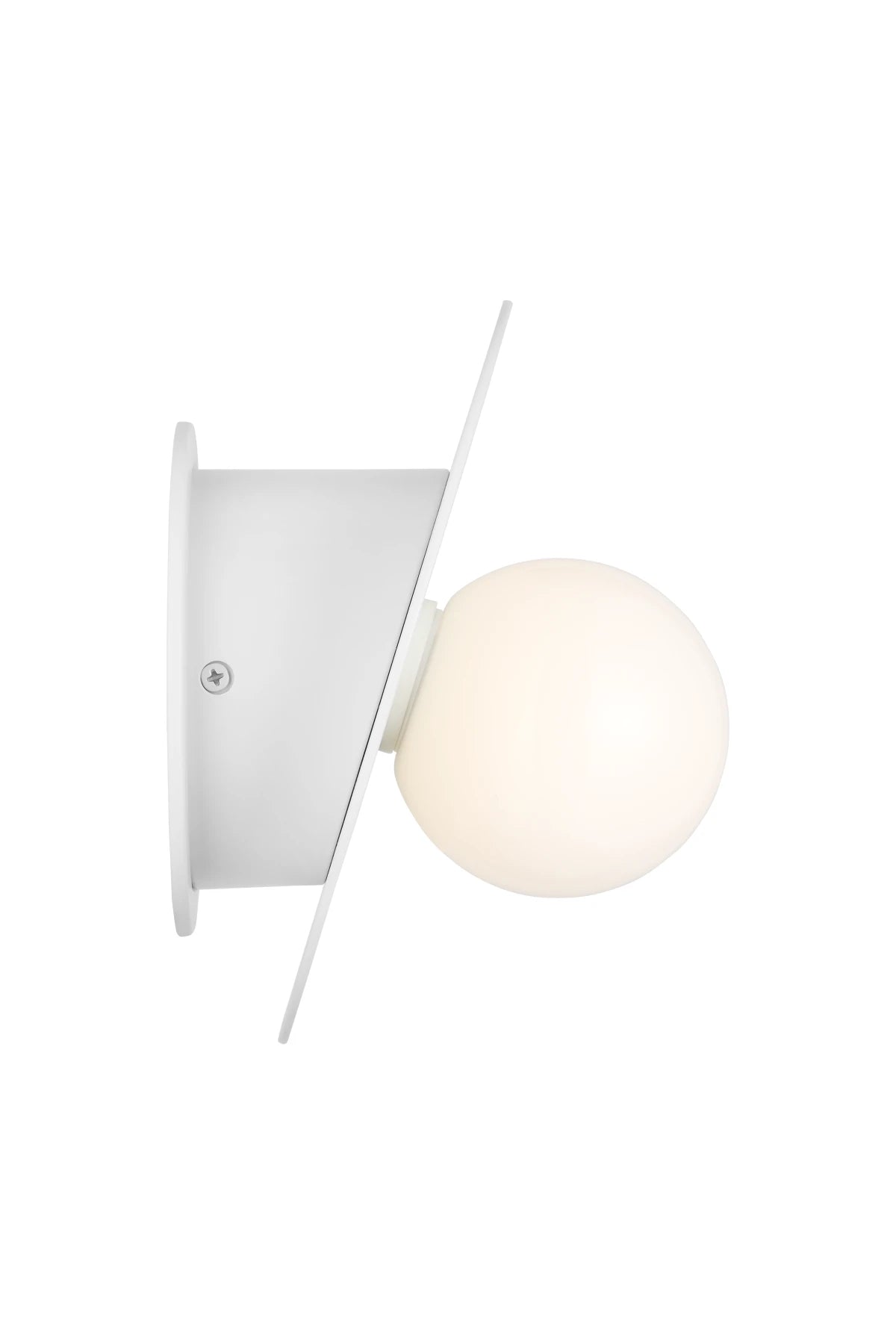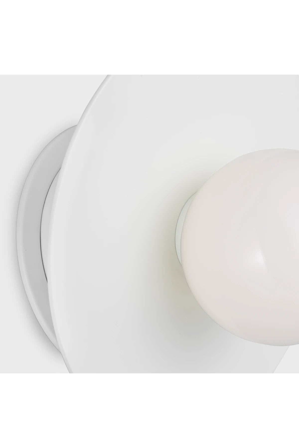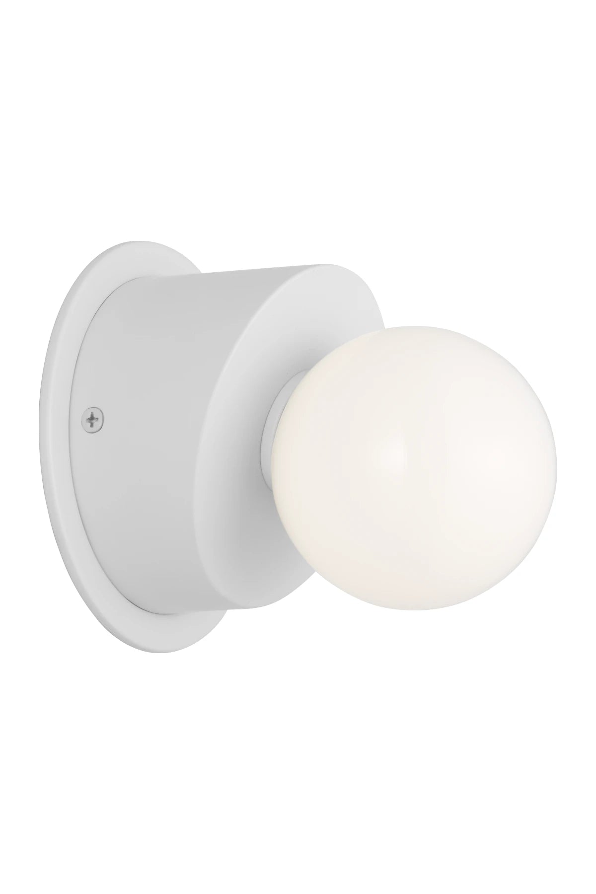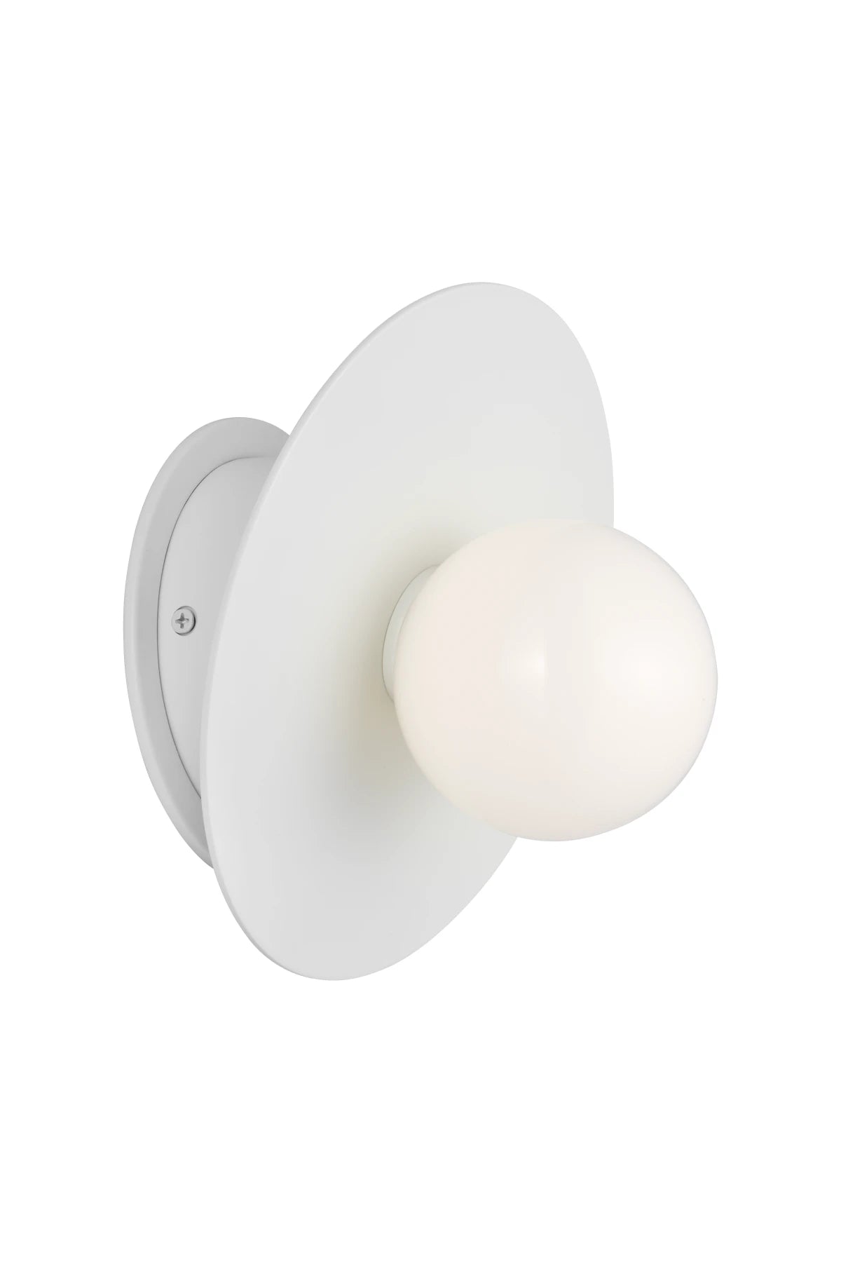 Meet the Nodes Large Angled Sconce. Light radiates from milk glass globe, offering a soft, diffused glow, set against metal discs. All fixtures can be used with or without the discs. The Damp Rated design makes it suitable for bathrooms, kitchens, and covered outdoor spaces. Hanging fixtures within this family feature black fabric cords, while pivot sconces can be cord and plug or hardwired. Bulb(s) not included.