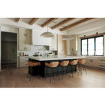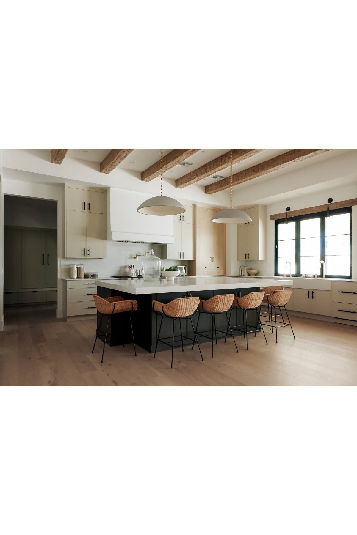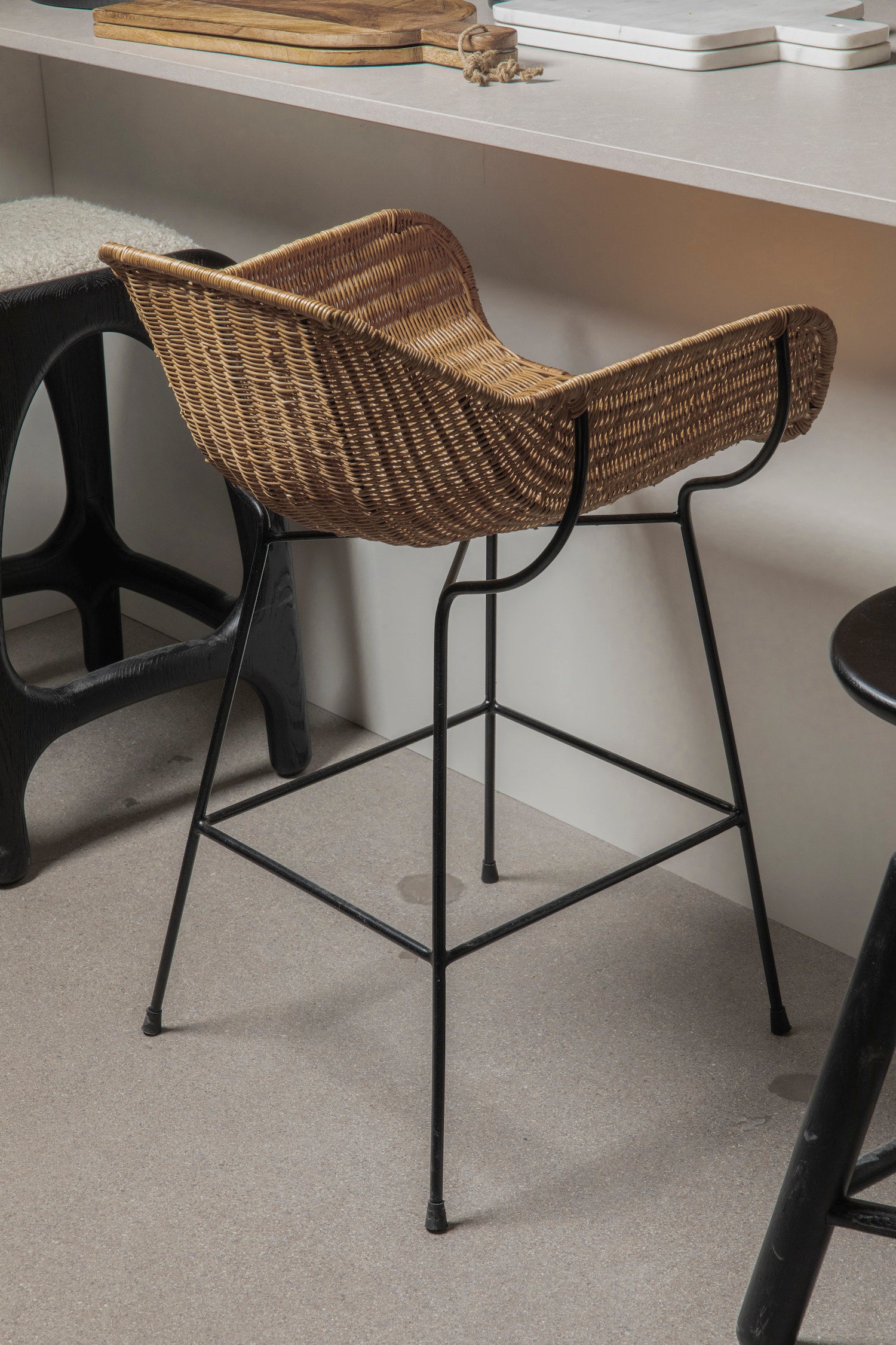 Meet the Nusa Counter Stool. This molded bar stool comfortably wraps you in woven rattan, placed on refined black metal legs makes the perfect addition to your kitchen space. This piece is modeled at our North Scottsdale/Phoenix location.