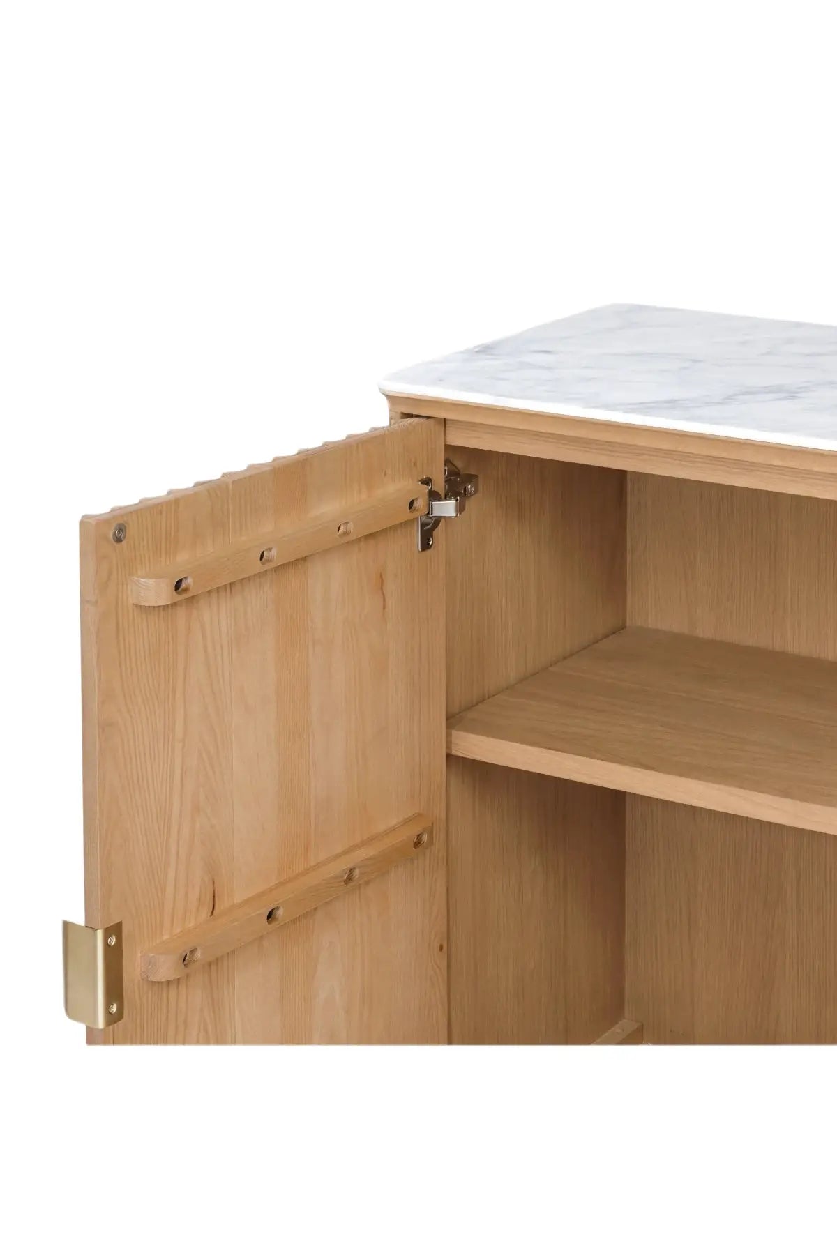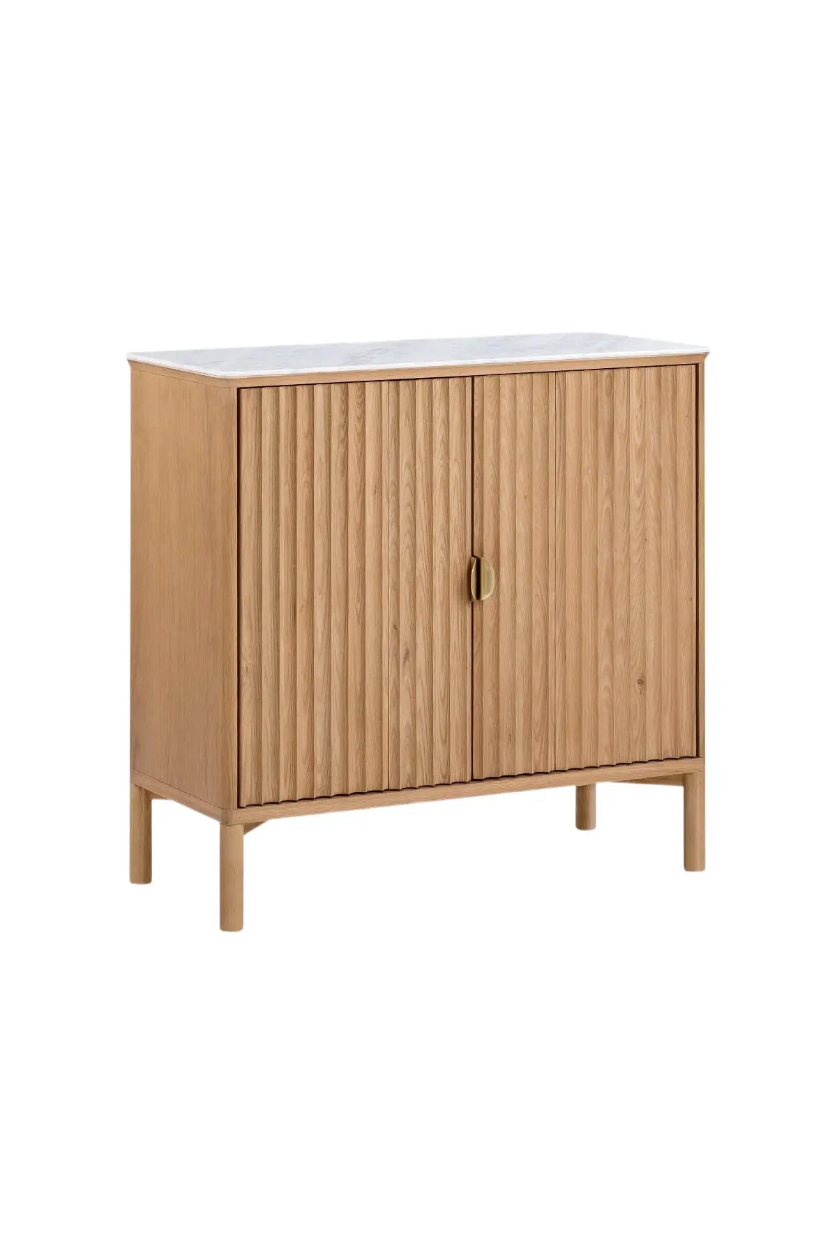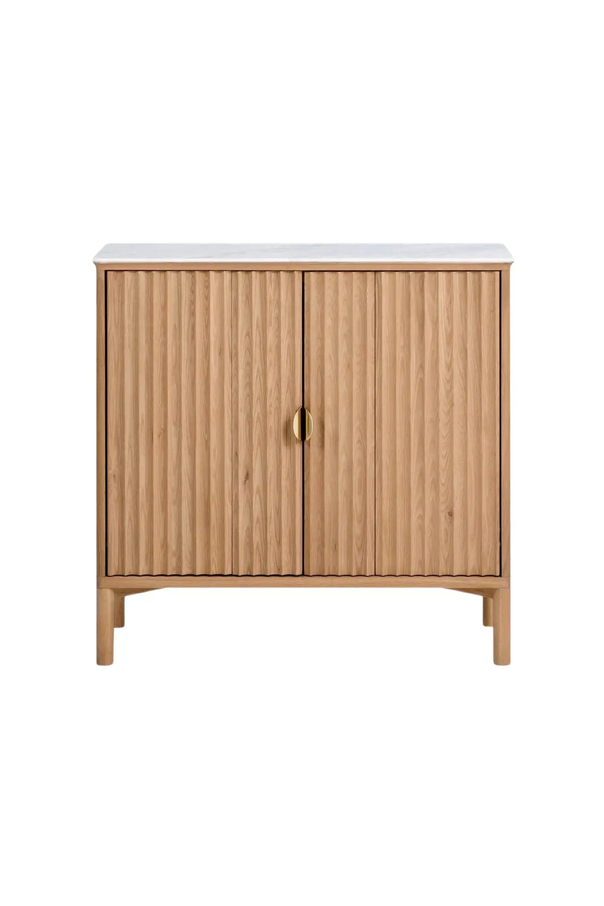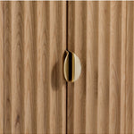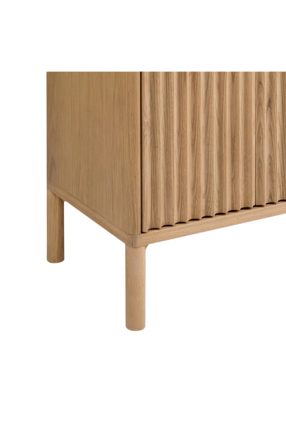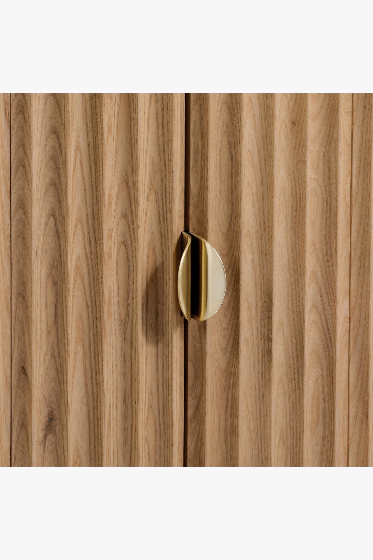 The Olive Reeded Cabinet is expertly crafted from a combination of ash and oak wood, and features reeded door front detailing, which adds a distinctive and textured element to the design. The reeded pattern consists of deep vertical grooves carved into the wood, creating a visually interesting surface.