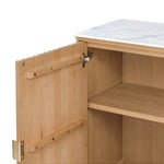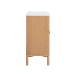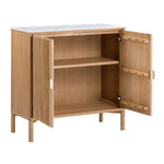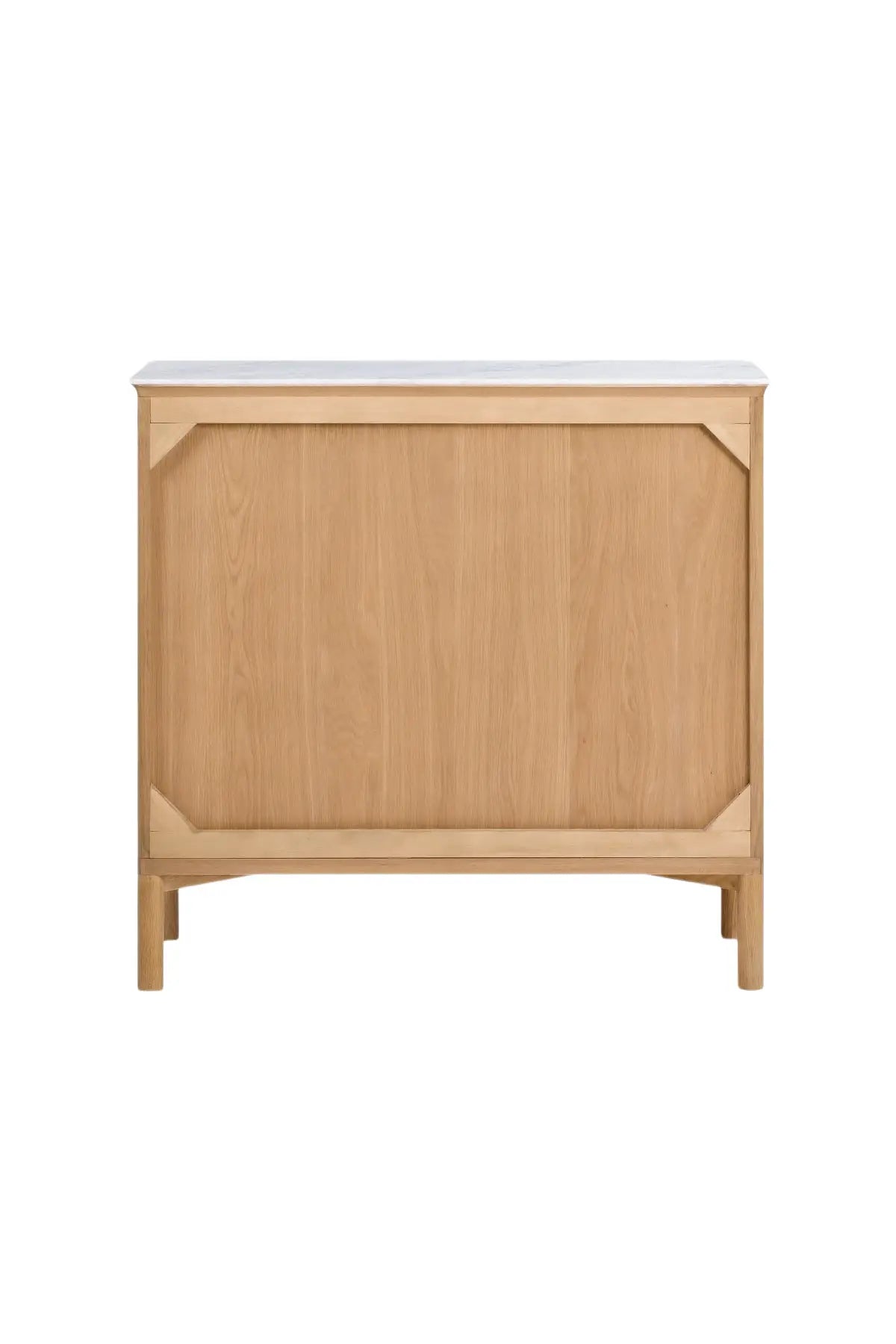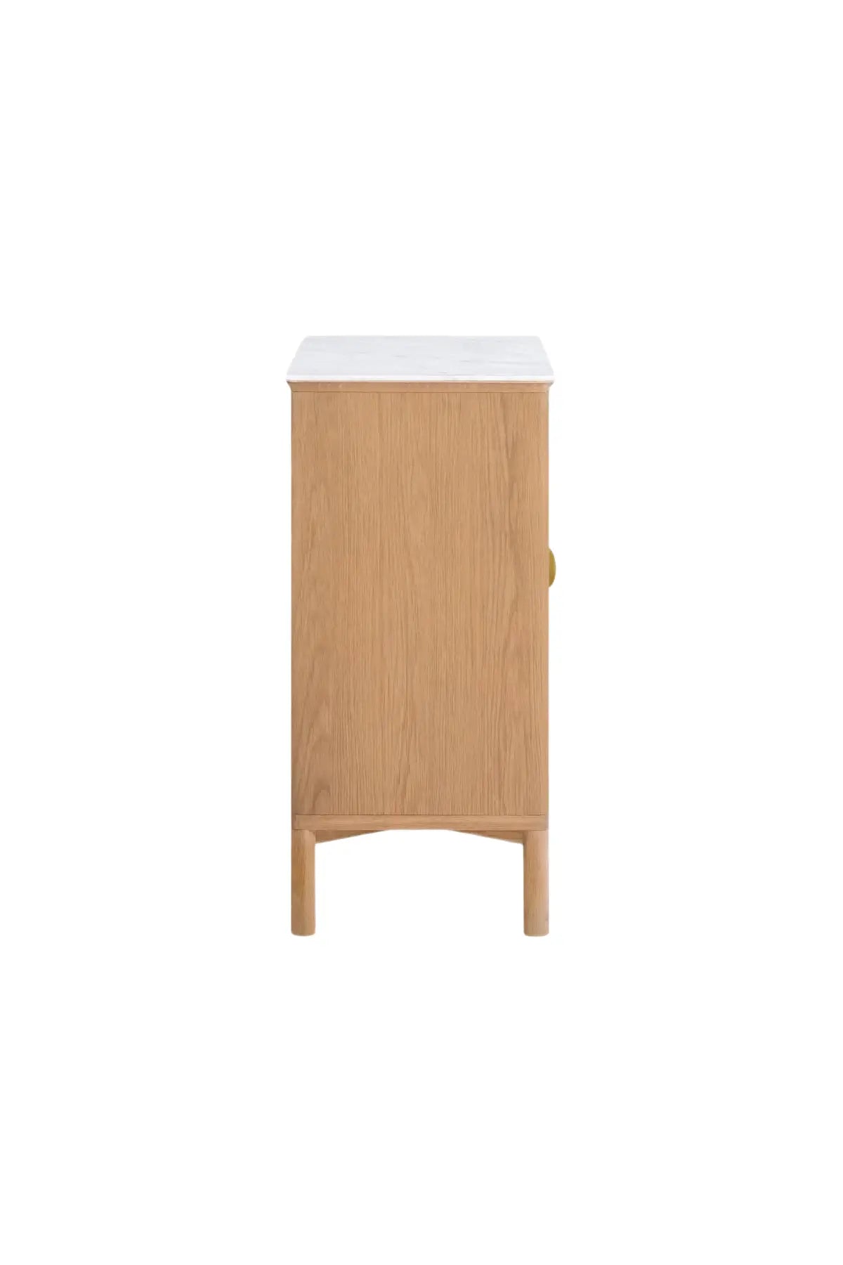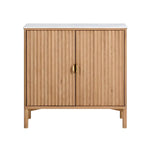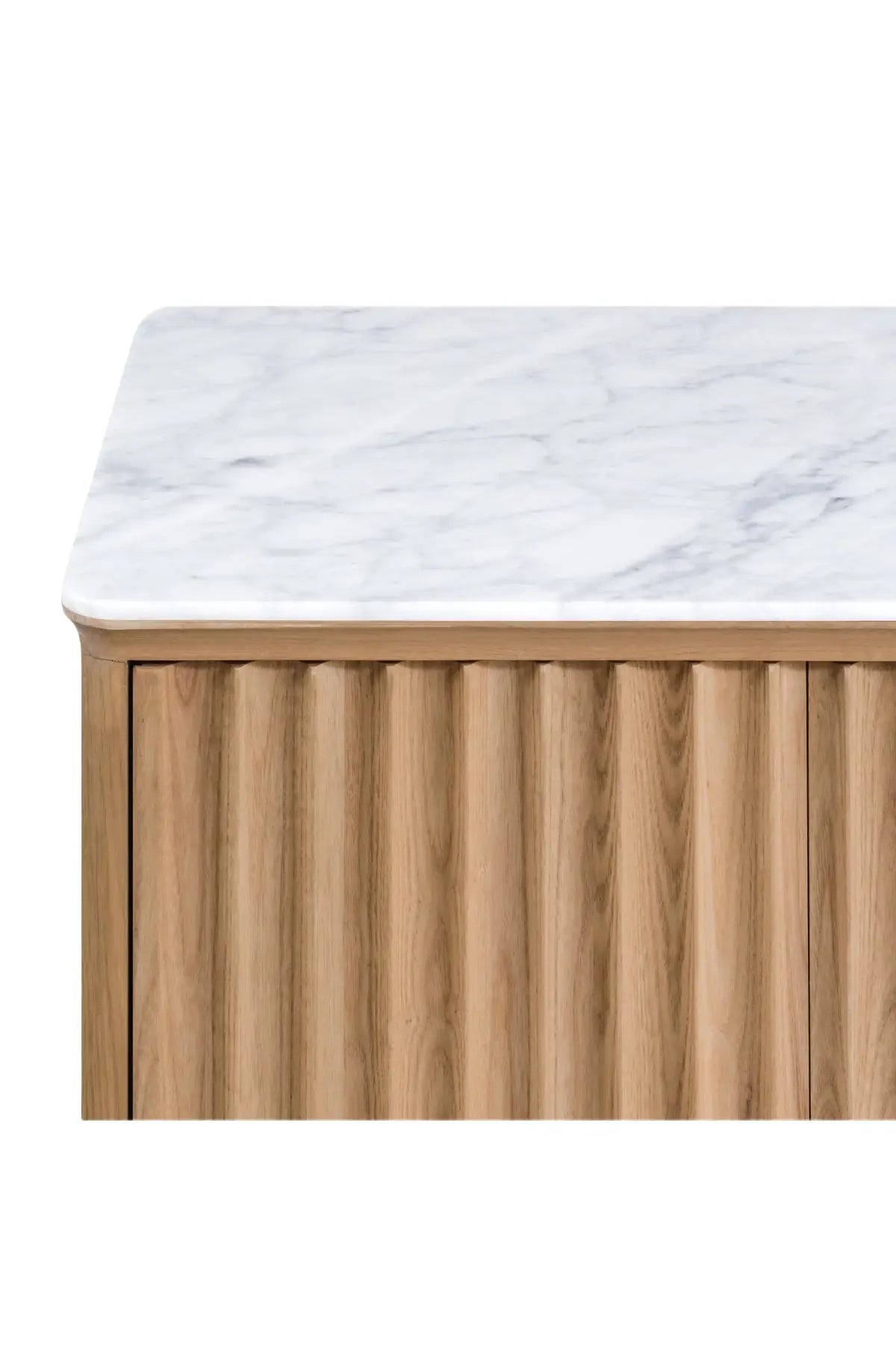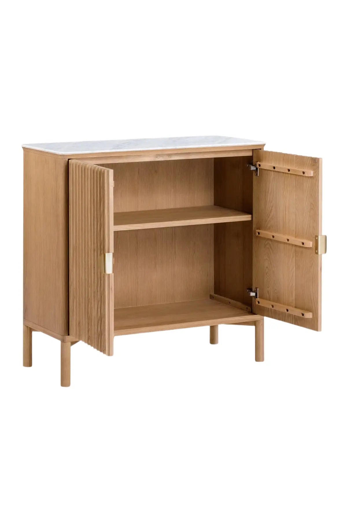 The Olive Reeded Cabinet is expertly crafted from a combination of ash and oak wood, and features reeded door front detailing, which adds a distinctive and textured element to the design. The reeded pattern consists of deep vertical grooves carved into the wood, creating a visually interesting surface.