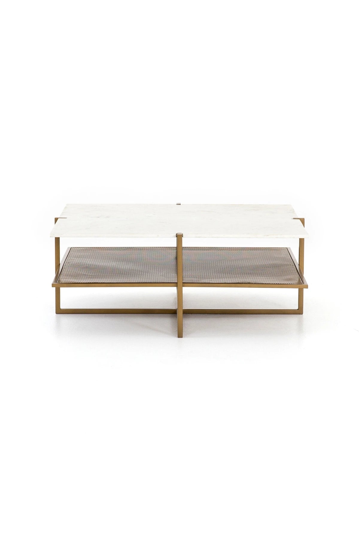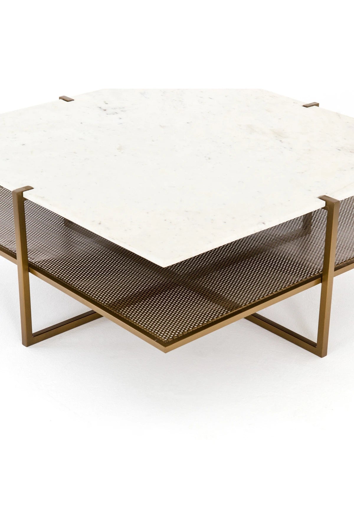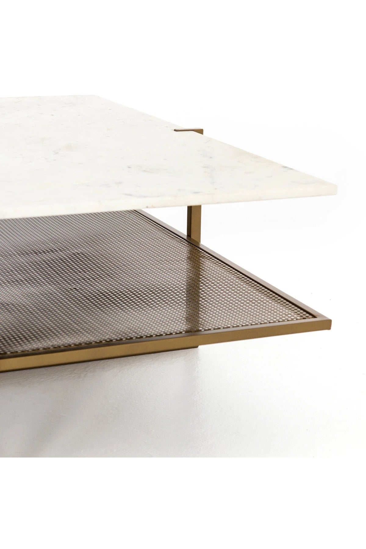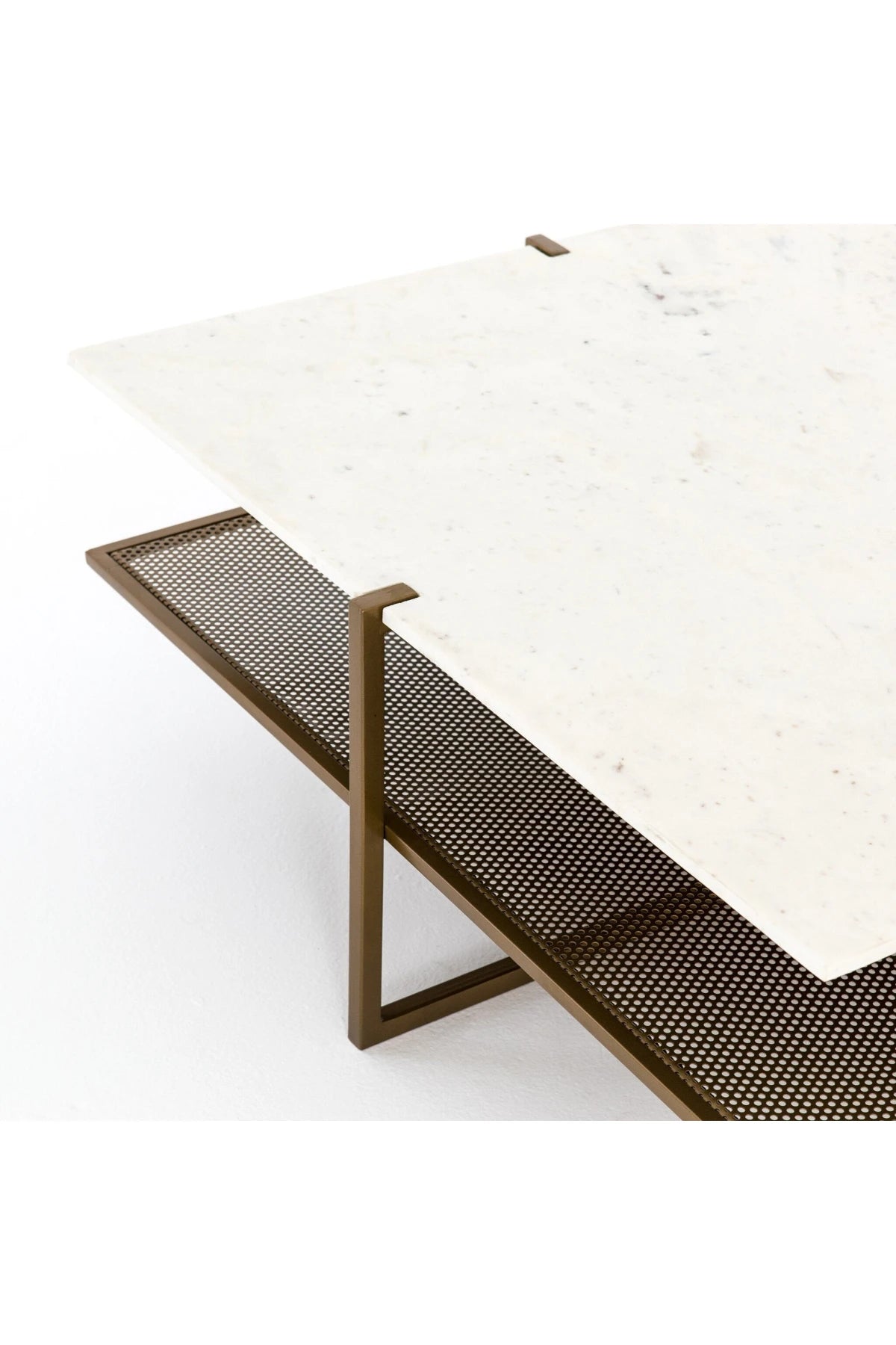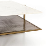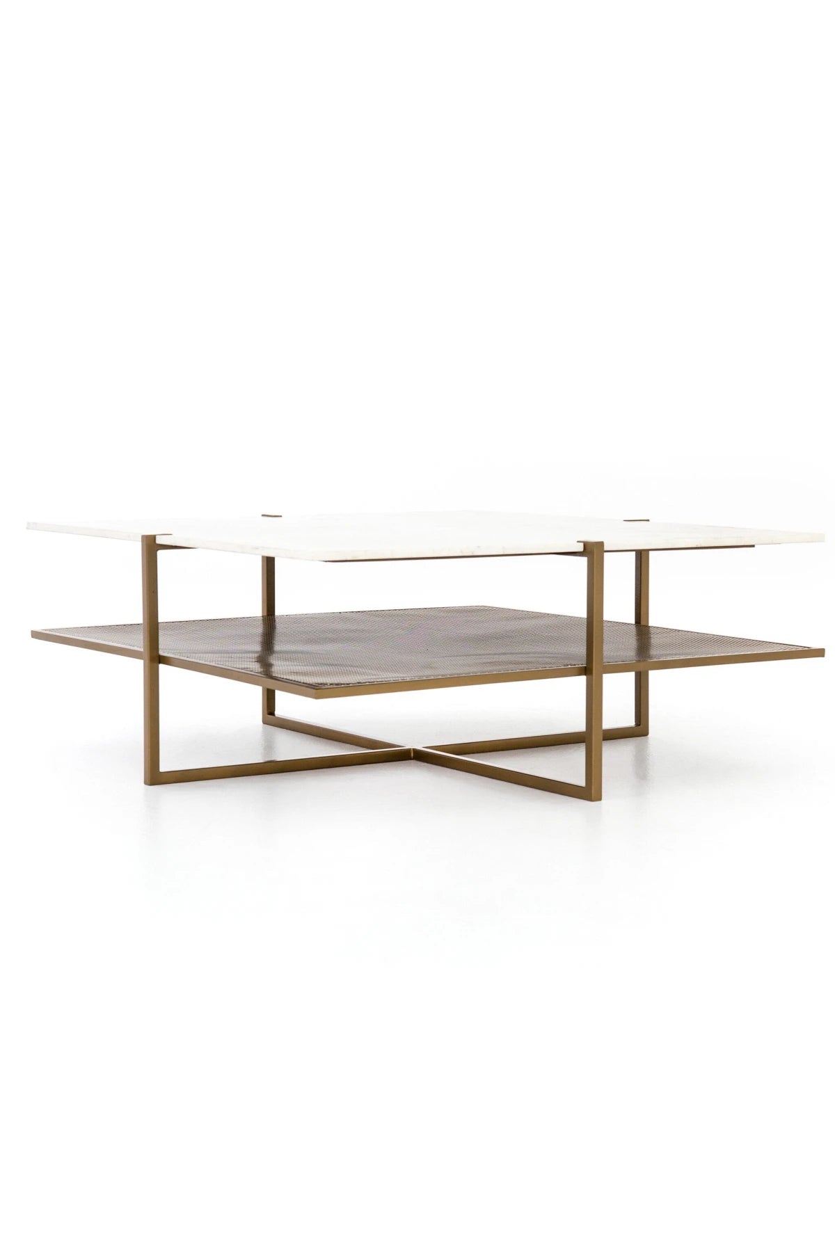 Add a pop of sophistication with a two-tone touch in the Olivia Square Coffee Table. Slim, antique brass-finished iron forms an X to support tiers of perforated metal and polished white marble, bringing a look of simple grace to the modern coffee table.