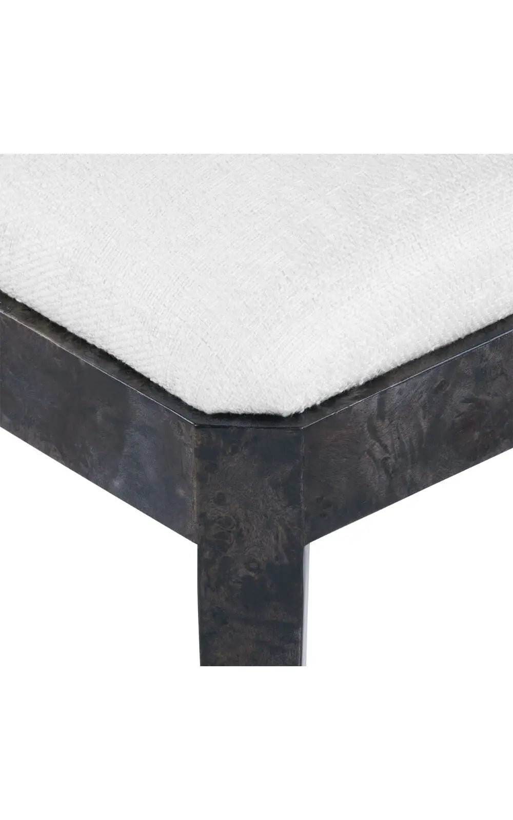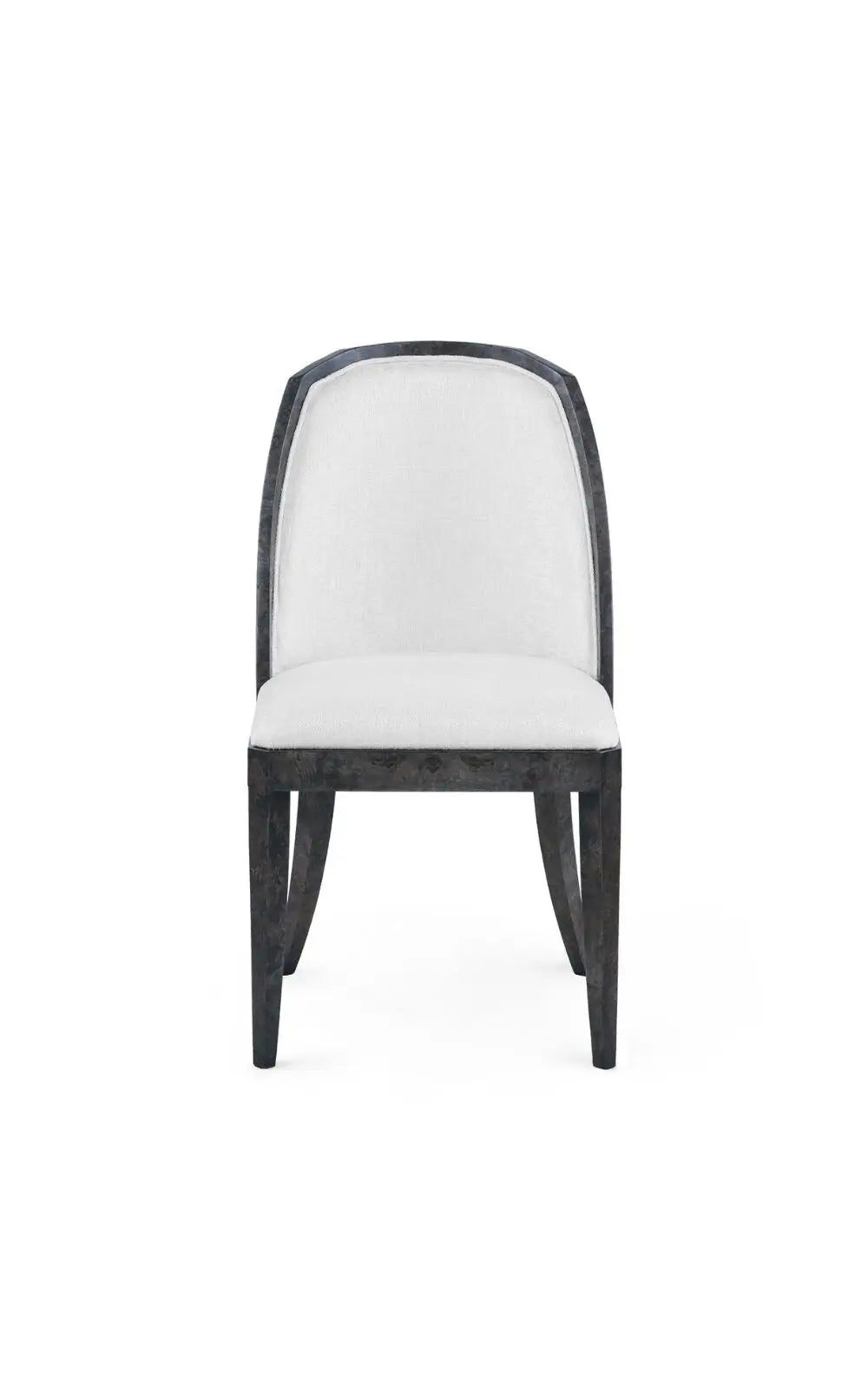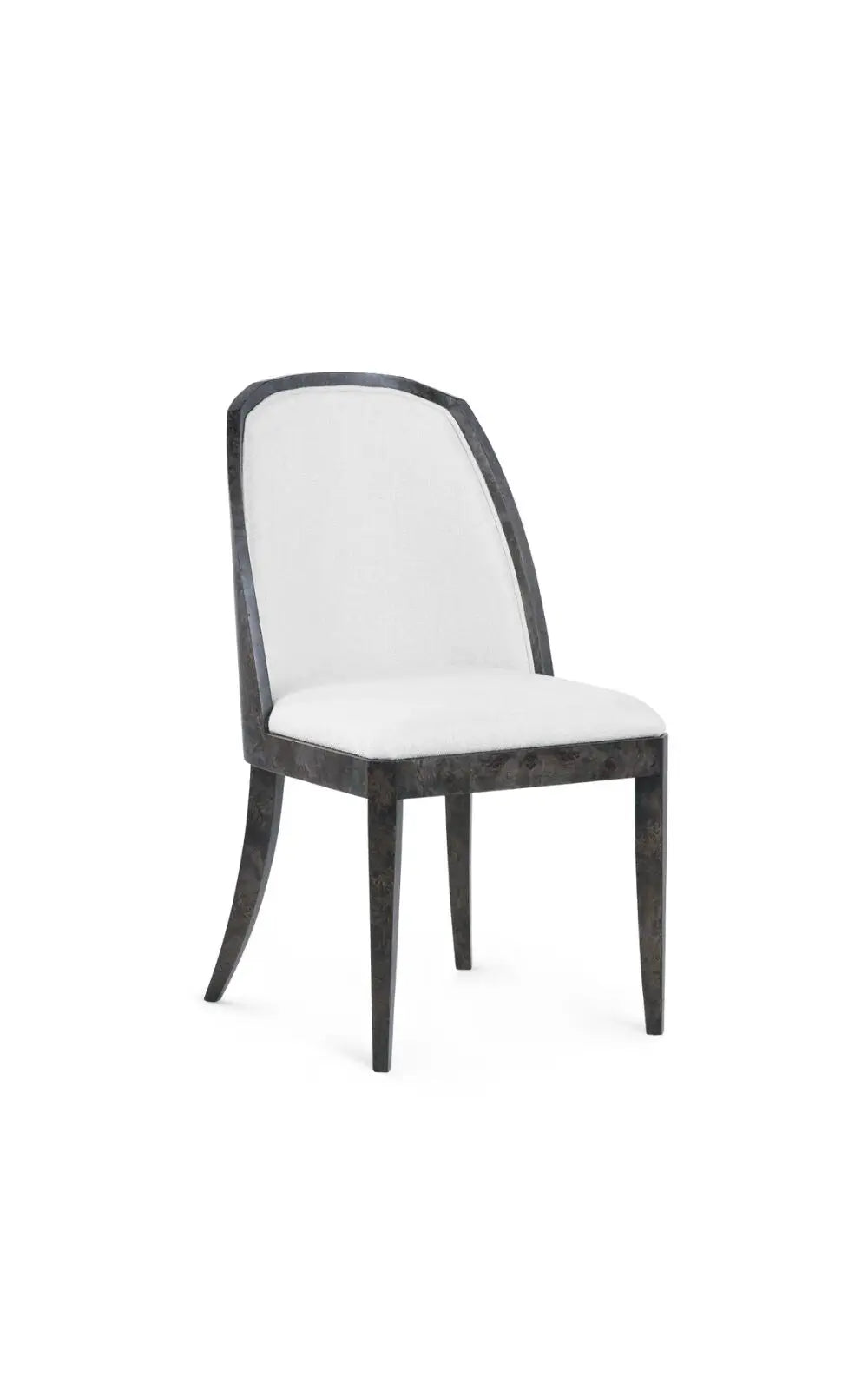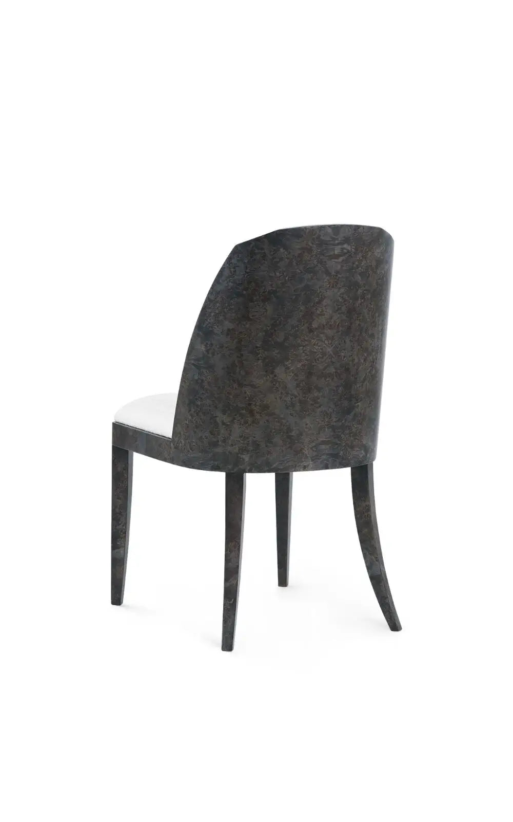 The Ophelia Side Chair is a striking piece crafted from luxurious burl, offering both beauty and substance. Larger in scale than many of our side chairs, it features a generous seat that ensures comfort without compromising on elegance. The backrest is fully veneered with a graceful curve, complemented by a subtle angularity at the top for added character. Upholstered in a flatwoven fabric reminiscent of shaved chenille, the chair exudes a refined softness.