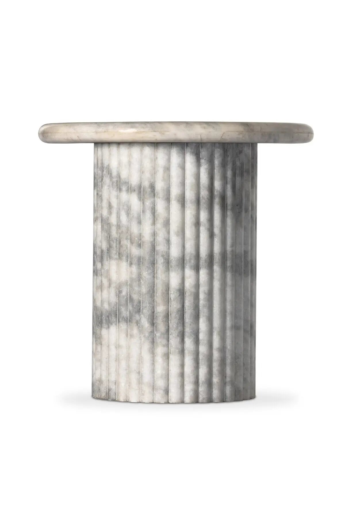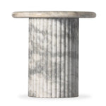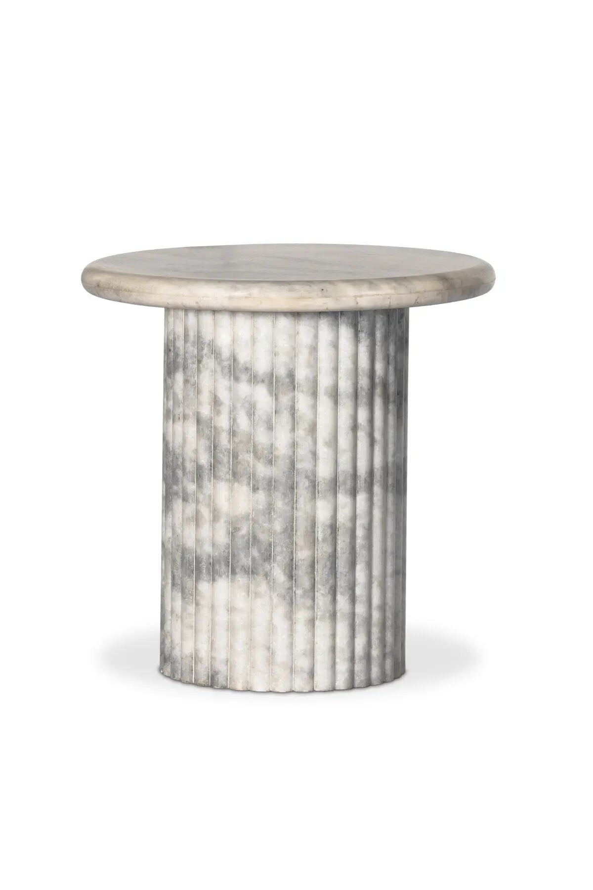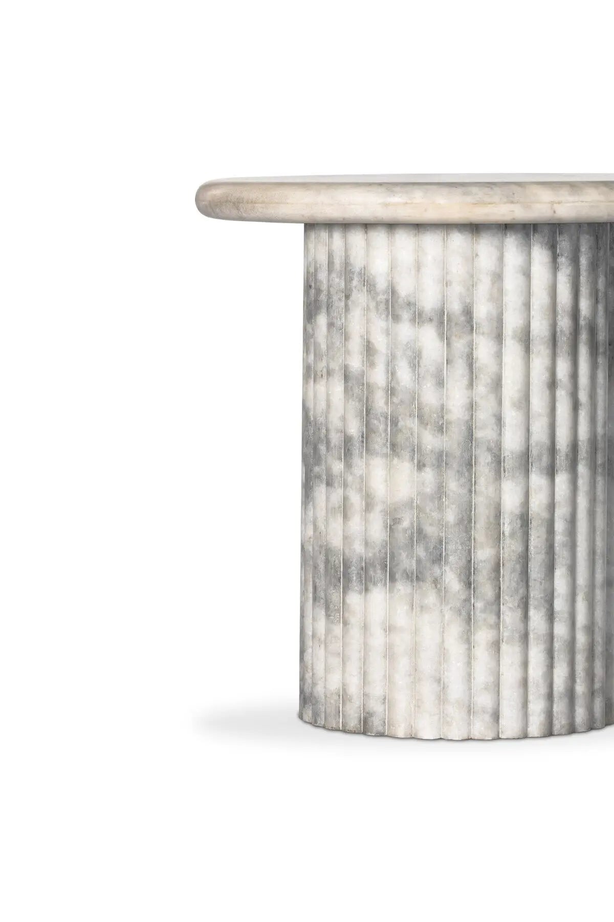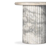 Meet the Oranda End Table. This end table is inspired by Italian design, a swirling marble base is scalloped for a linear look with heavy texture. Topped with polished white marble.