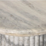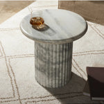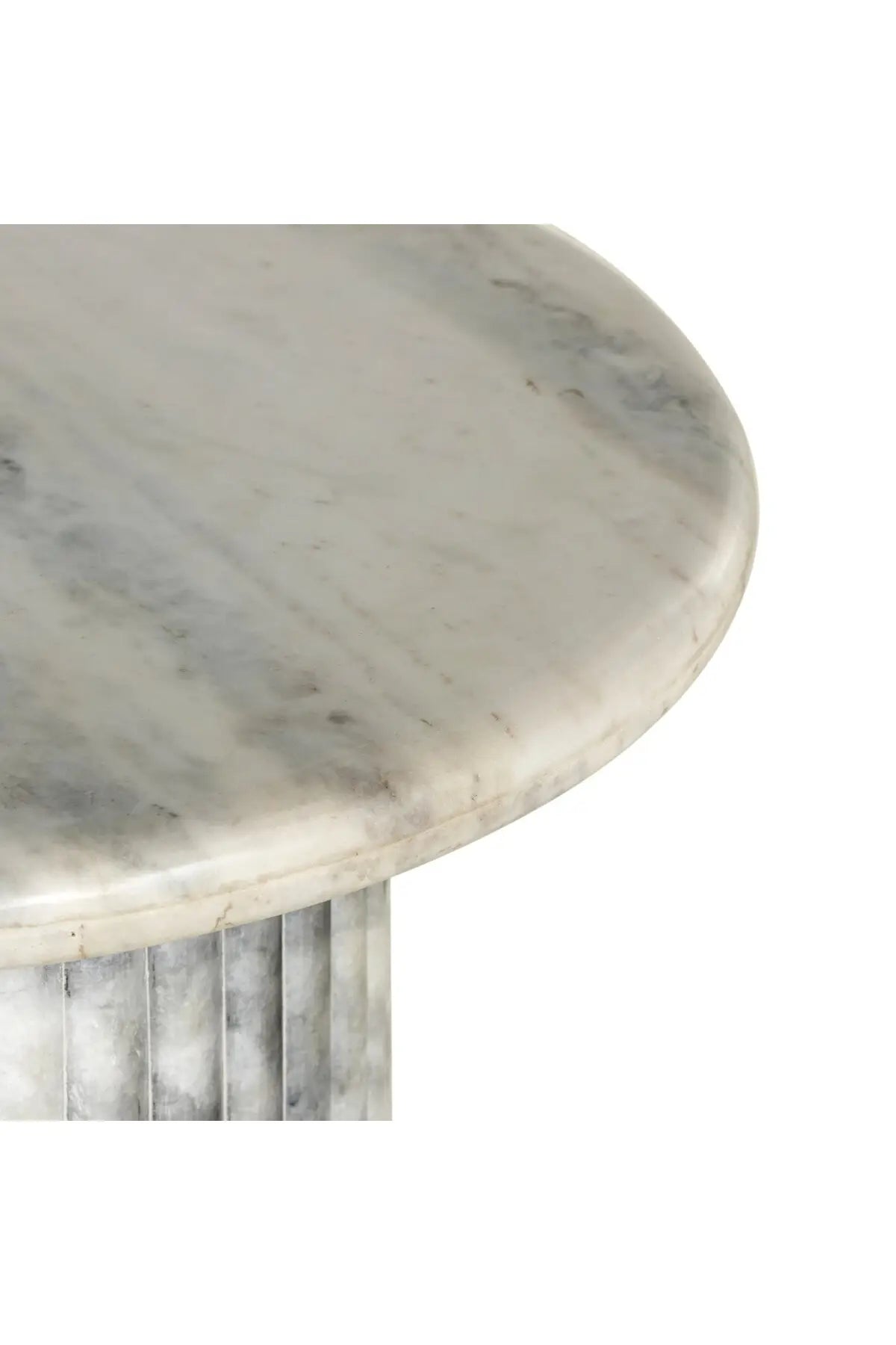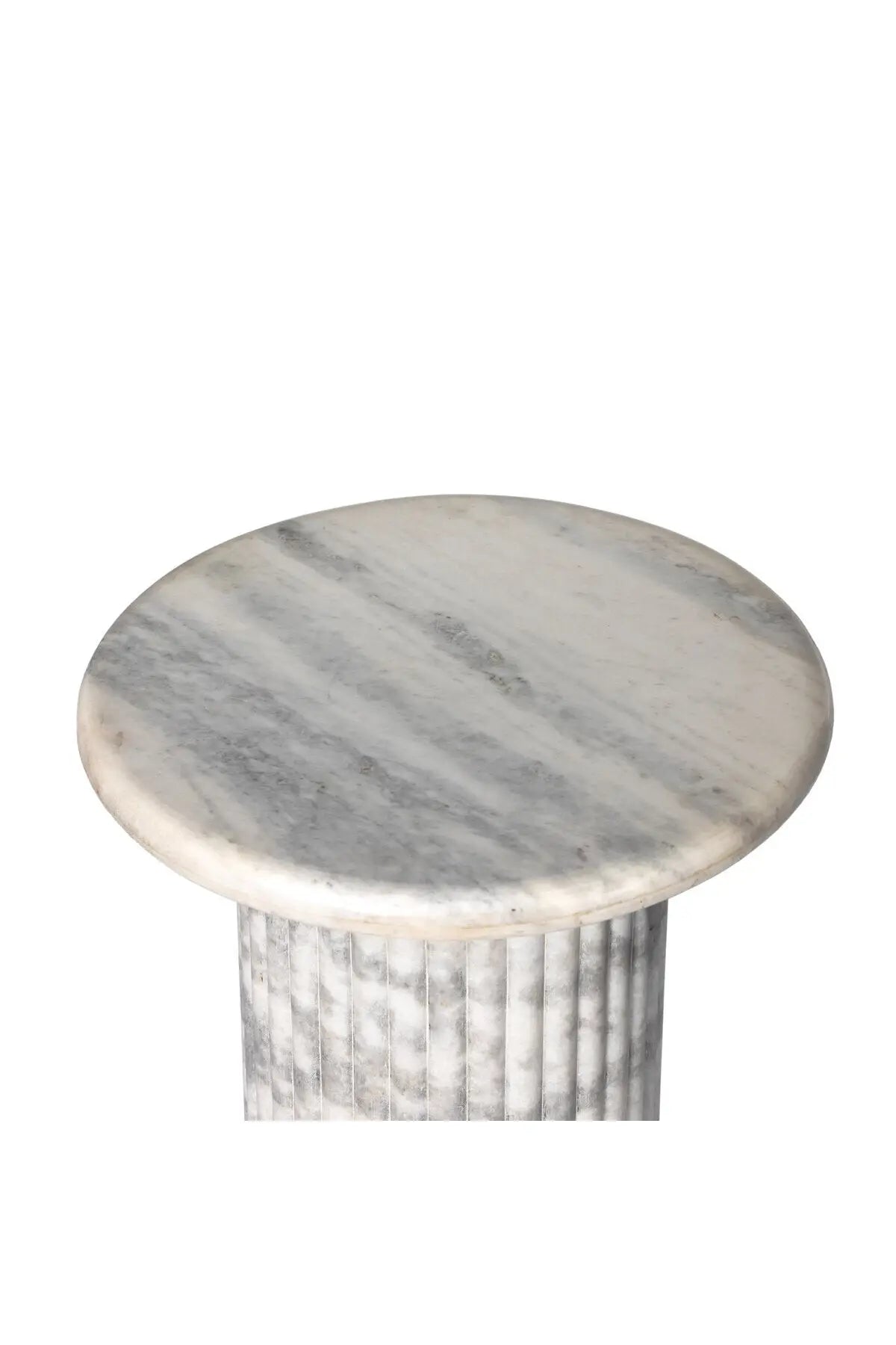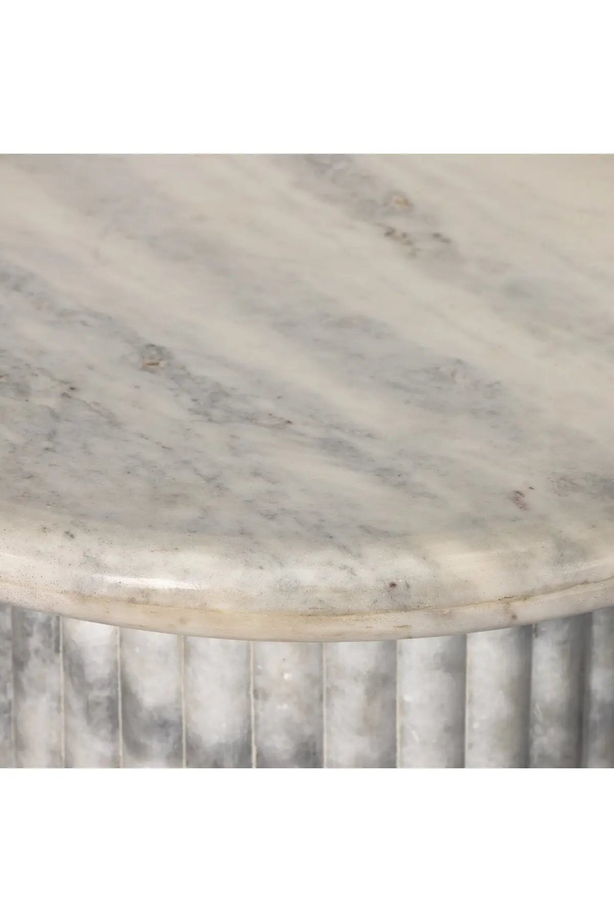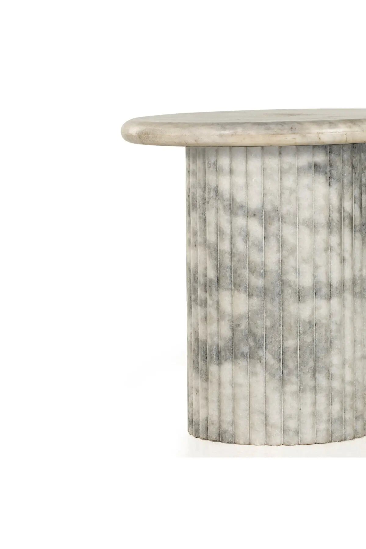 Meet the Oranda End Table. This end table is inspired by Italian design, a swirling marble base is scalloped for a linear look with heavy texture. Topped with polished white marble.