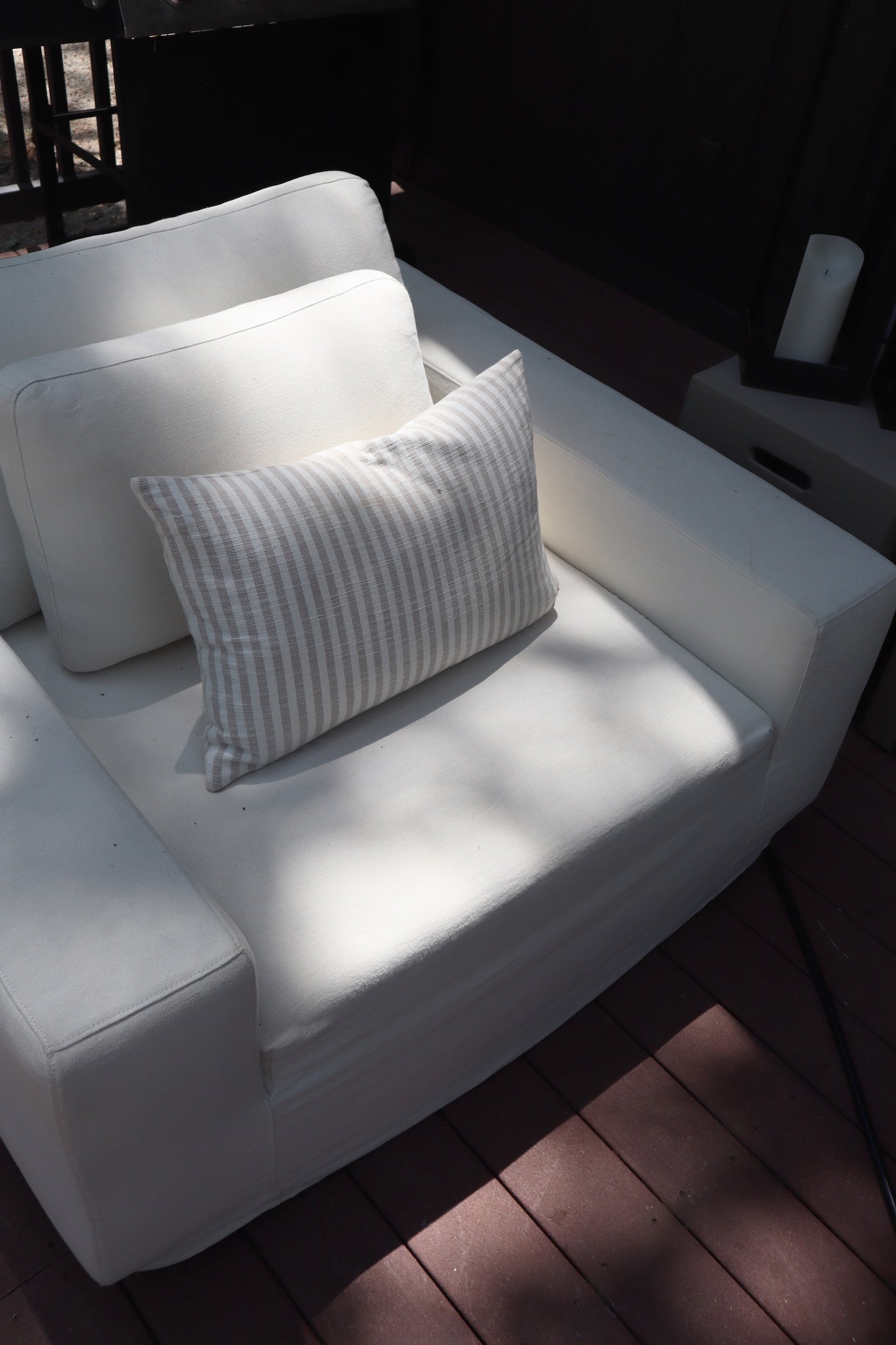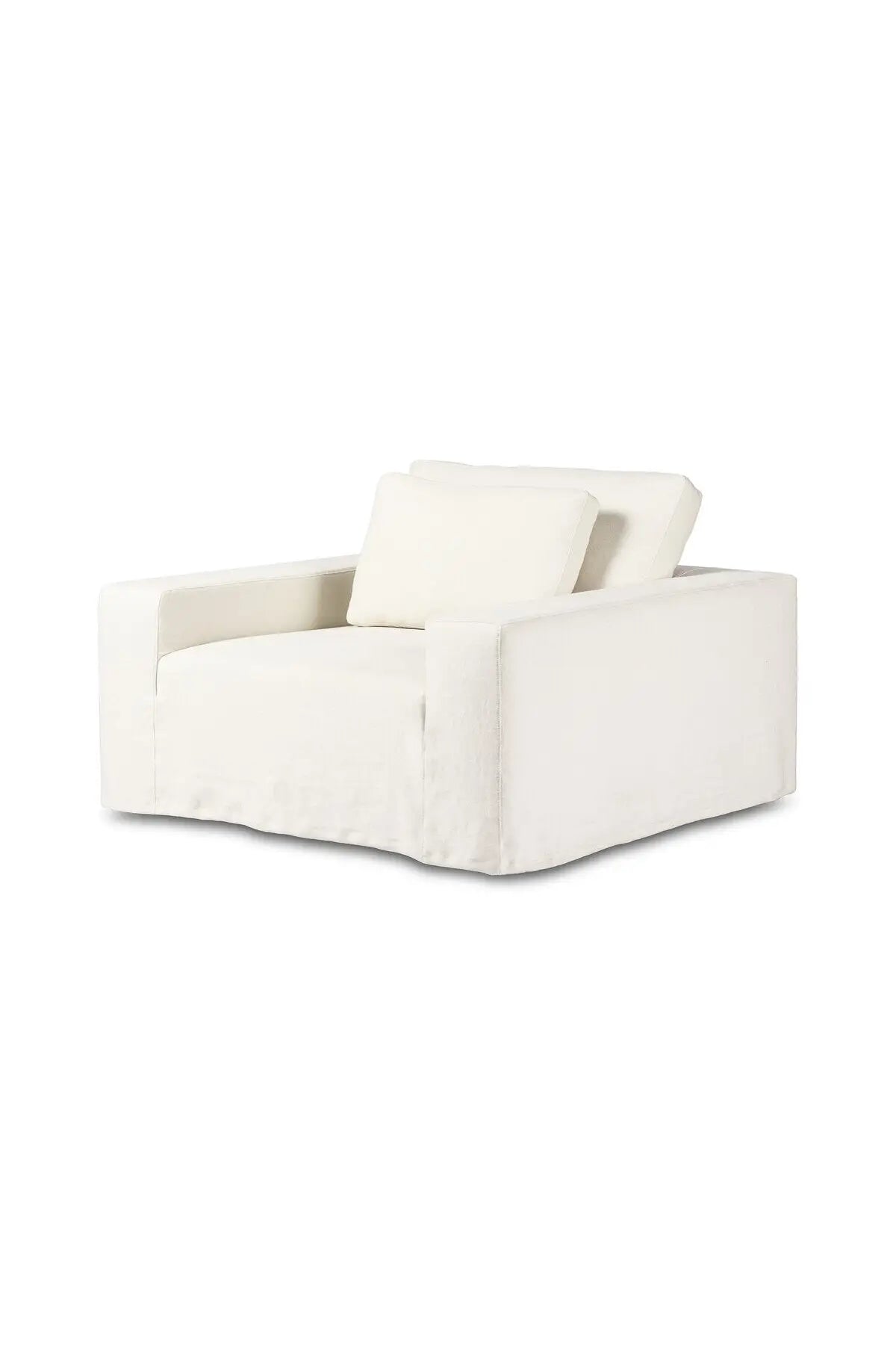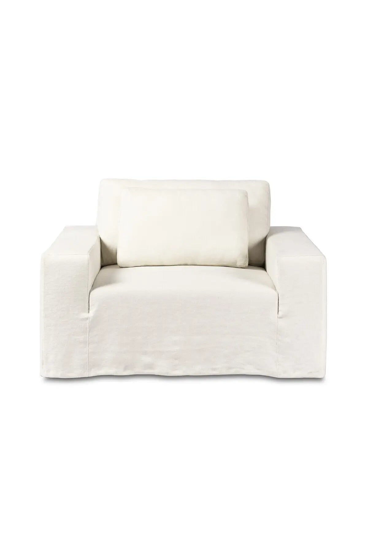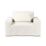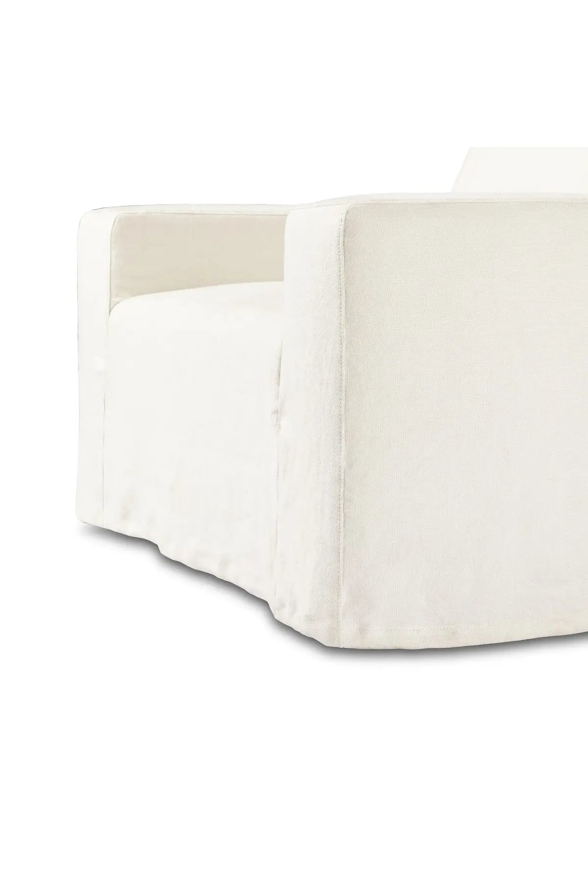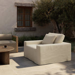 Meet the Ostend Outdoor Slipcover Chair. Slipcover style, updated. An outdoor chair with double box cushions and chunky scale, styled in washable and natural hemp upholstery that has a linen look and indoor-like slipcover drape. Cover or store inside during inclement weather and when not in use.