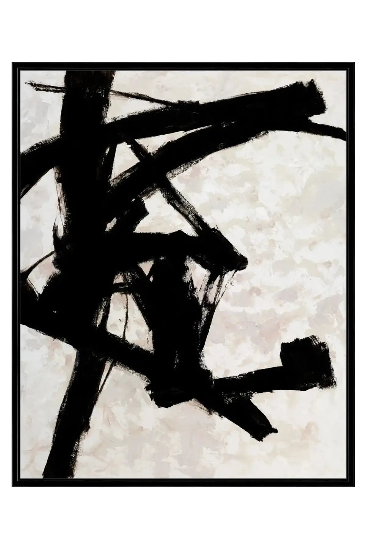 Meet the Overture Wall Art. This artwork showcases bold, dynamic black brushstrokes layered over a textured beige background, creating a sense of raw energy and abstract expression. Printed as a fine art giclée on premium artist-grade canvas, ensuring exceptional color accuracy and detail for a gallery-quality piece. A gel finish is a hand-applied with brushstrokes that follow the contours of the original image, adding a subtle and authentic texture. Crafted from sustainable polystyrene, the floater frame creates a striking effect by suspending the artwork within the frame, adding depth and a touch of modern elegance. Professionally framed and ready to hang.