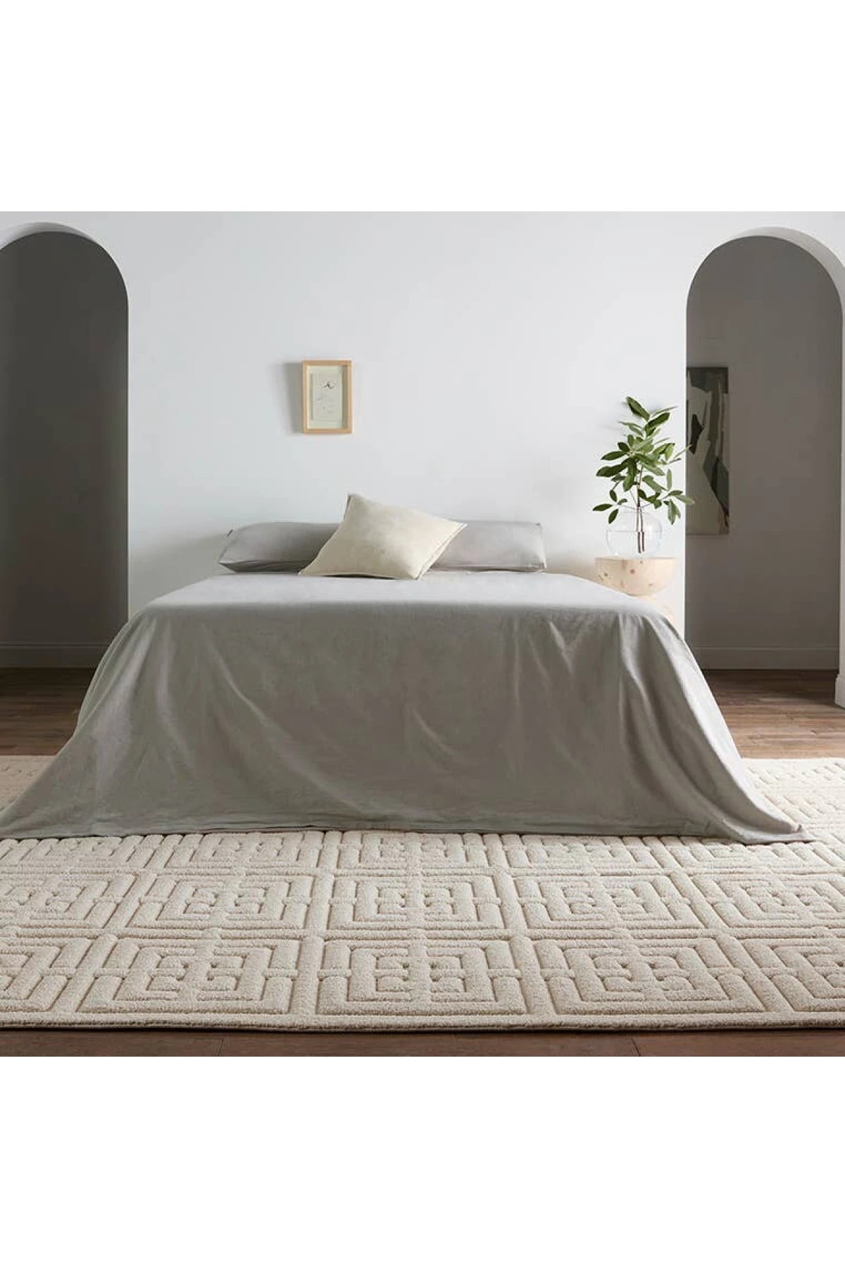 The Petros Rug in Style 1 brings soft, modern patterns and three-dimensional texture to any room. Its shiny chenille yarn in a warm taupe color adds versatile style and depth. Samples are modeled at our North Scottsdale/Phoenix location.
