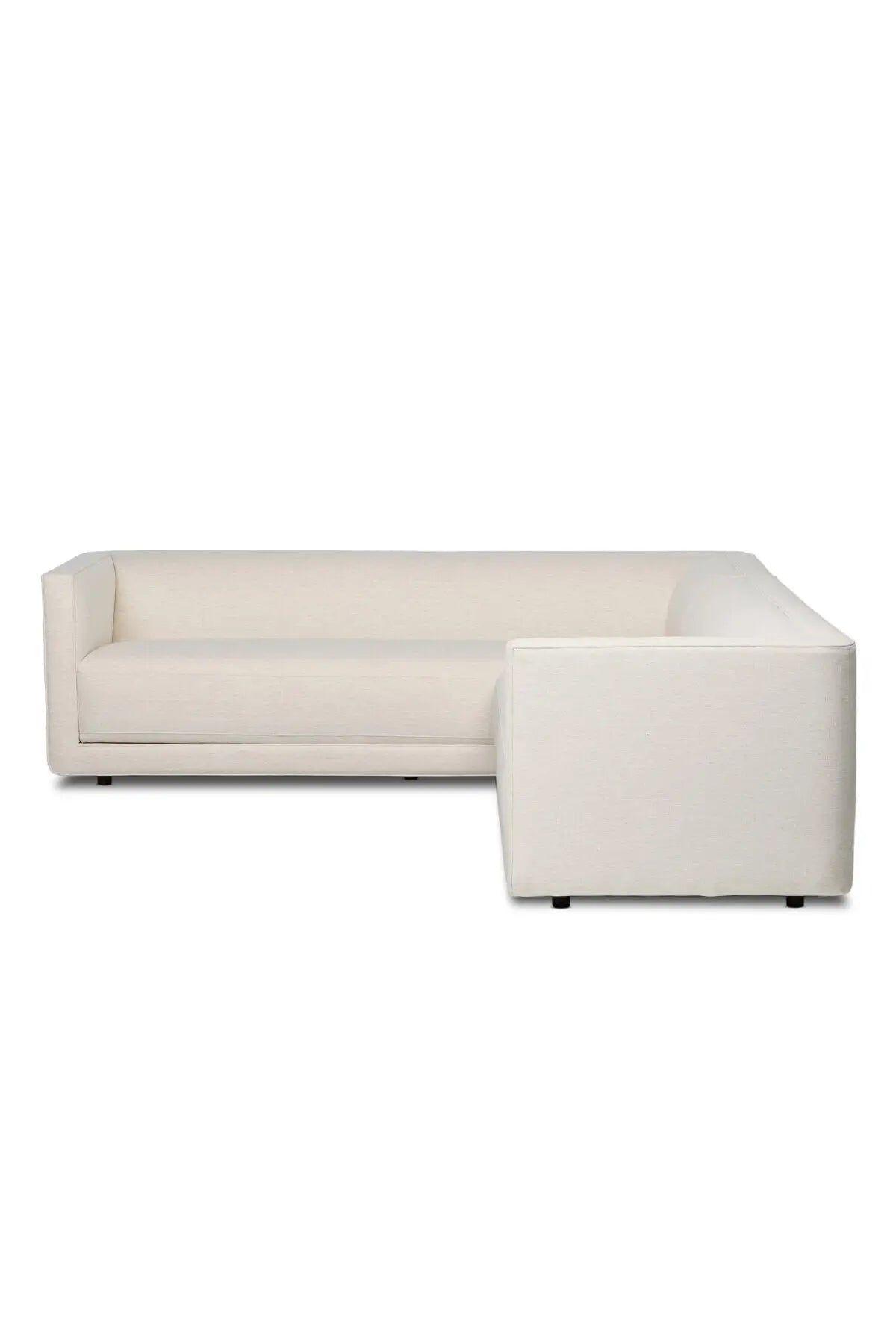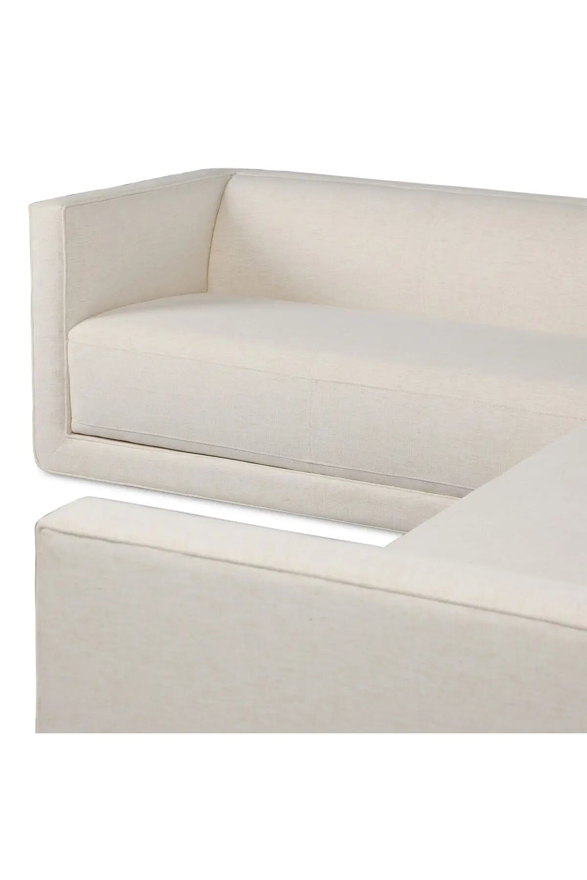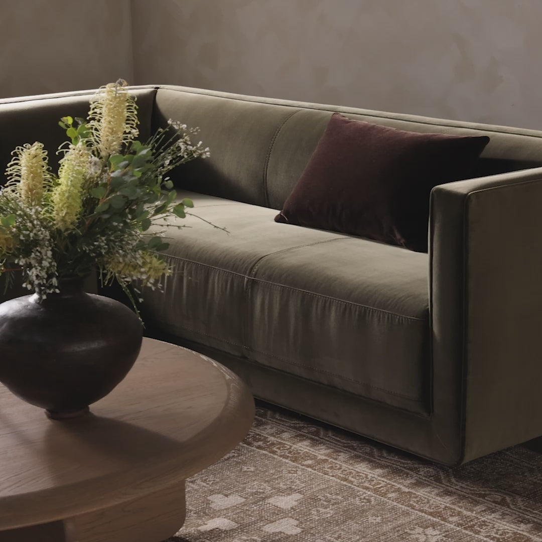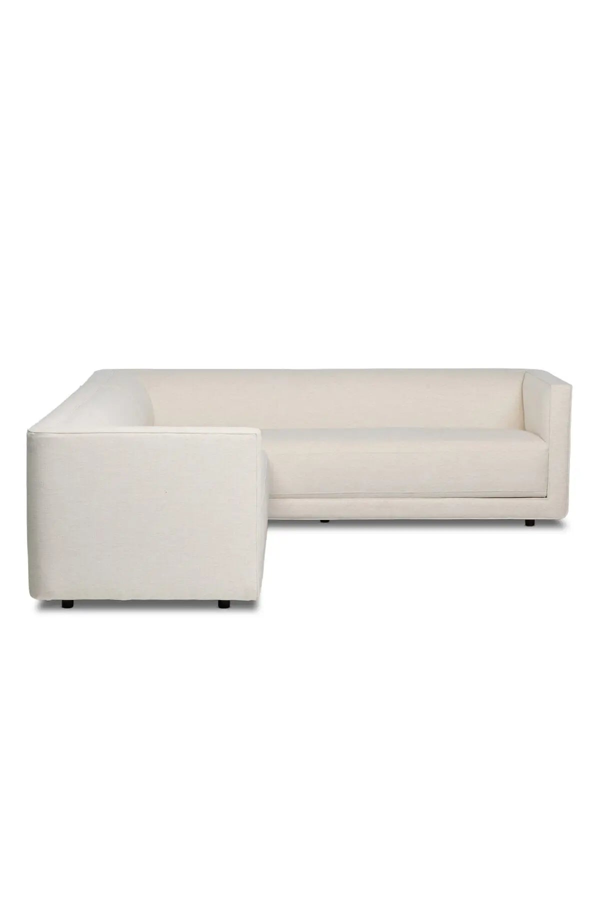 Meet the Phillip 2-Piece Sectional. A clean, angular sectional in an eye-catching color. Upholstered in an olive cotton blend, with blind stitching along the seat and back cushions. The slight pronounced seat cushion creates an illusion of being loose, but is actually a fixed cushion with expert tailoring. A piping channel detail gives the arm a finished look.