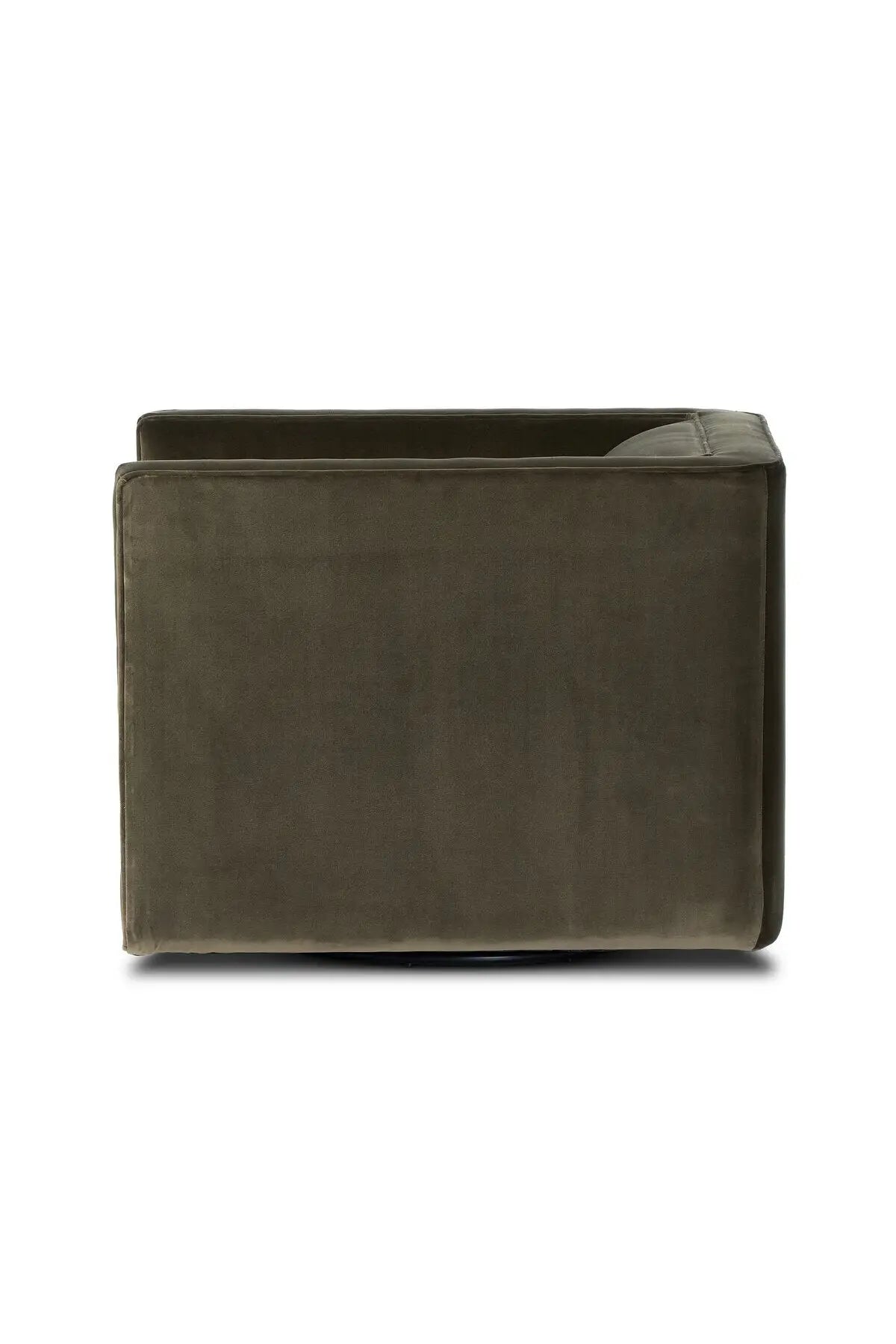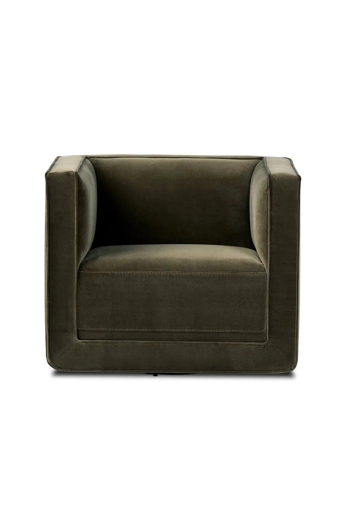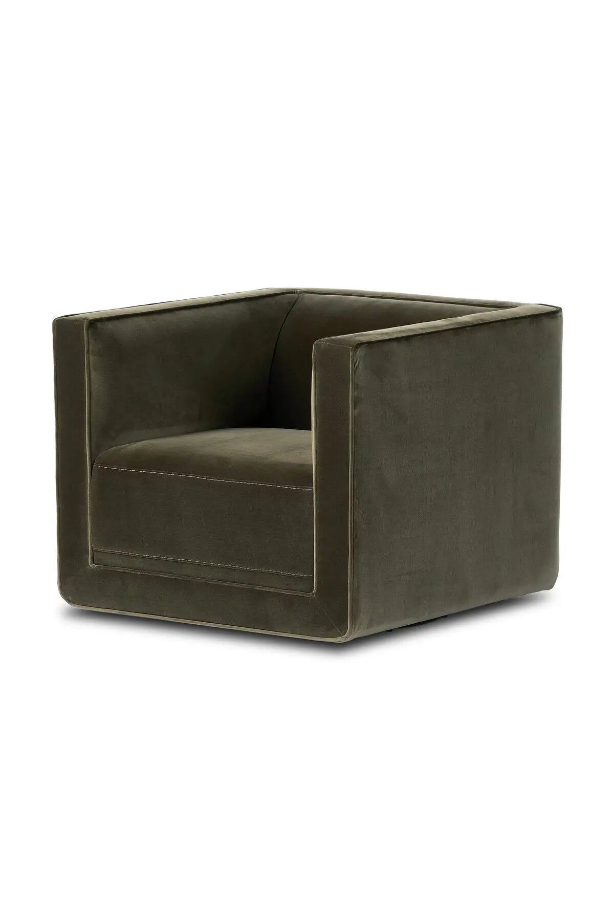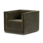 Meet the Phillip Swivel Chair. Style meets substance in this olive cotton-blend swivel chair. Blind stitching along the seat and back cushions create a polished complement to the heritage frame. The slight pronounced seat cushion creates an illusion of being loose, but is actually a fixed cushion with expert tailoring. A piping channel detail gives the arm a finished look.