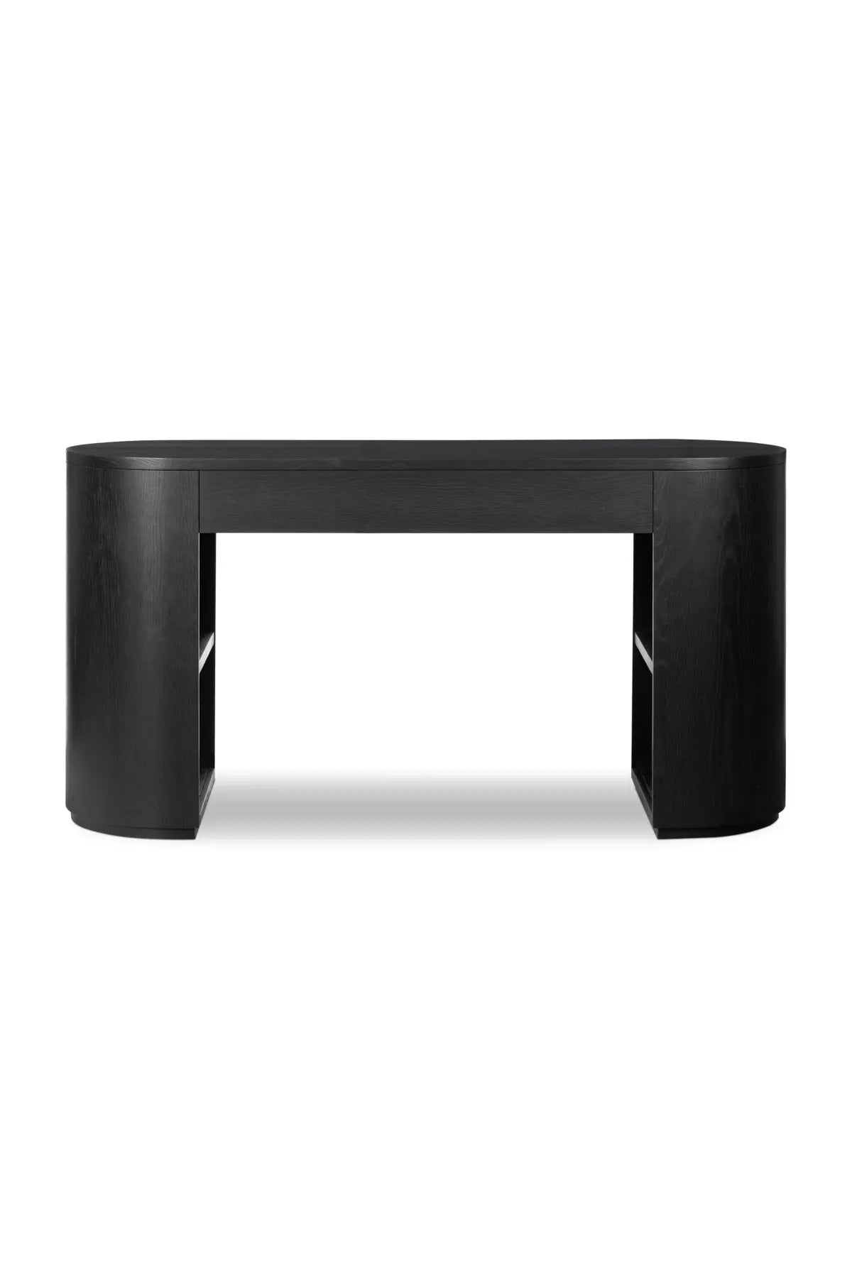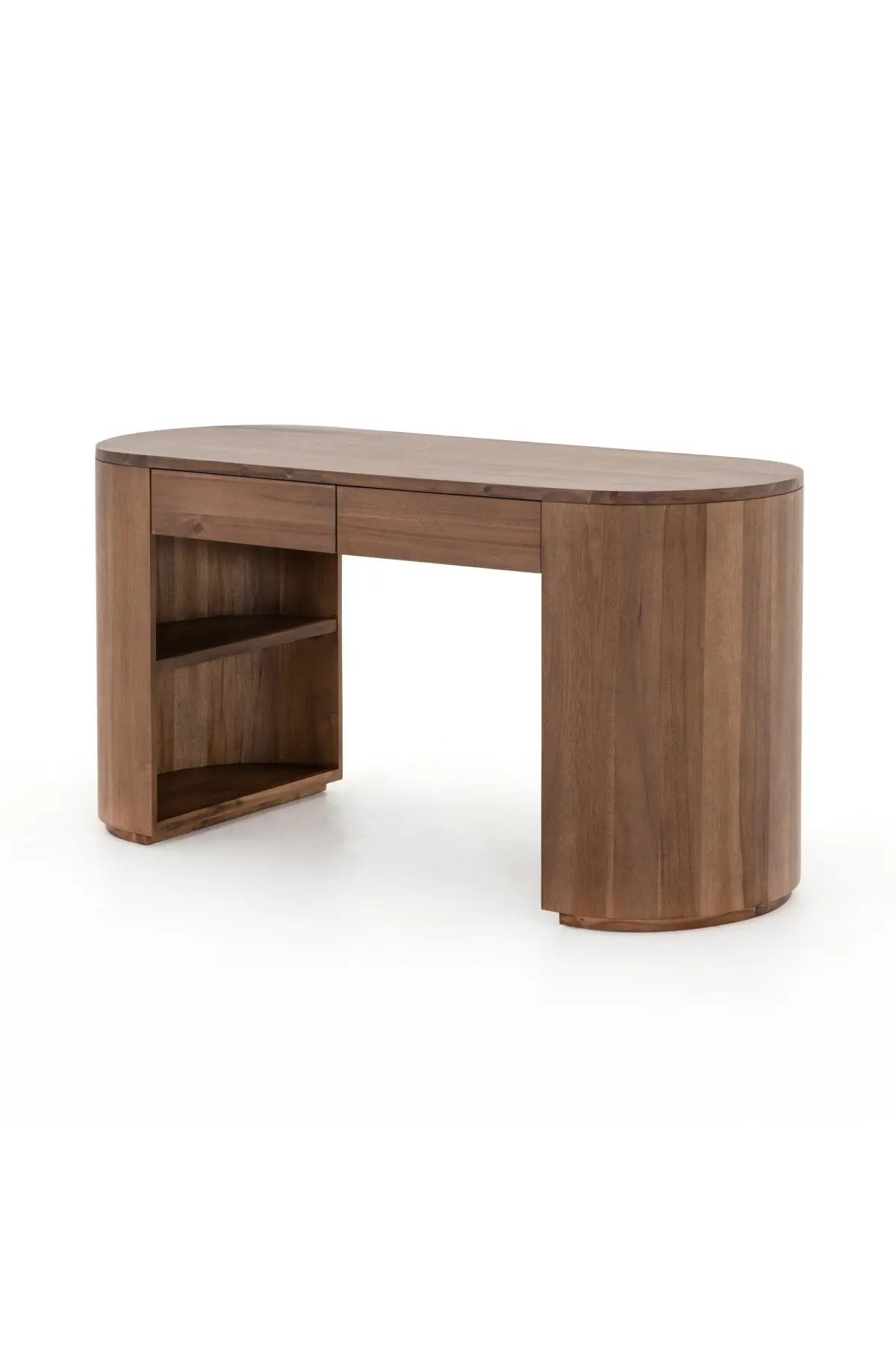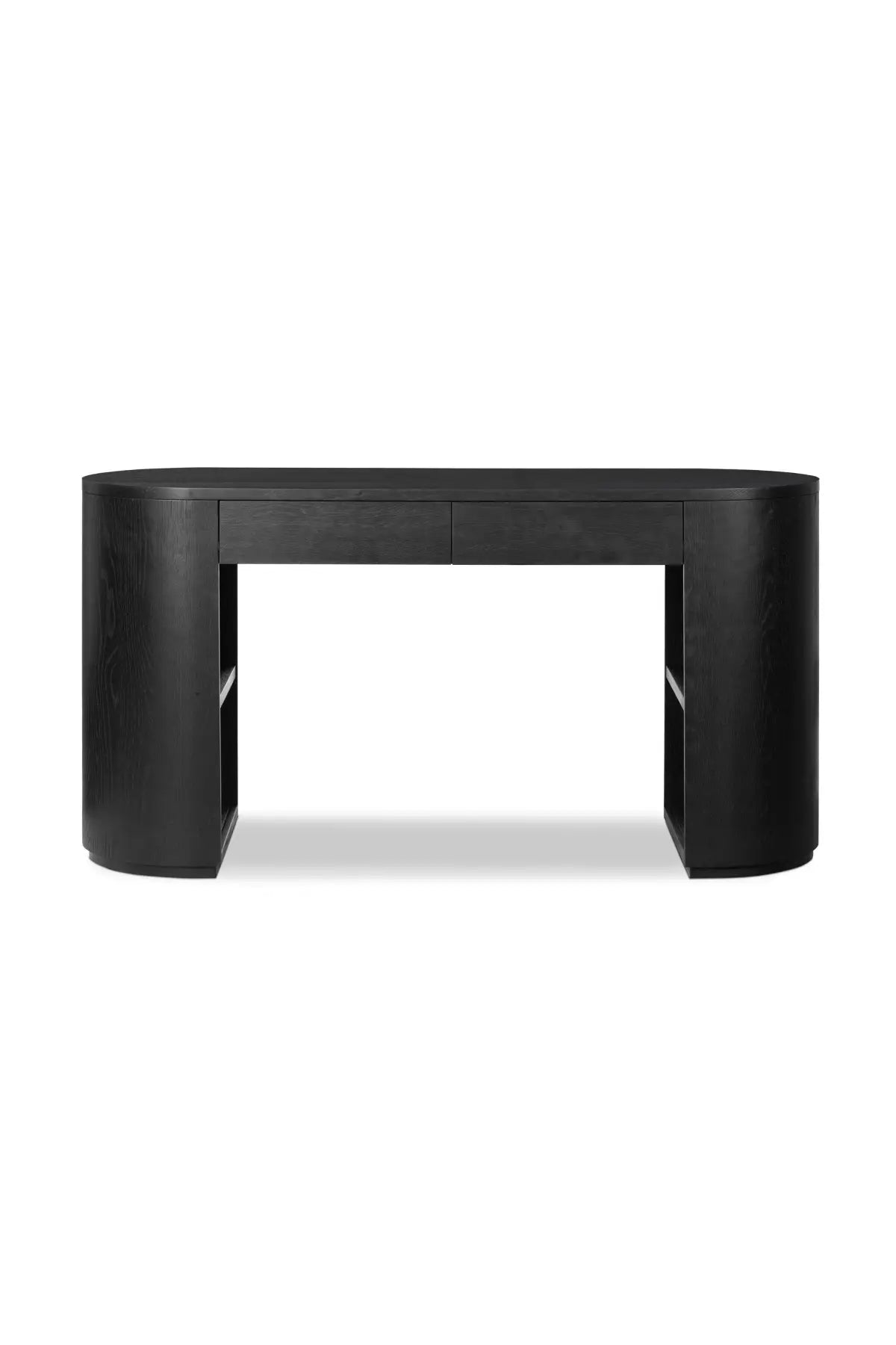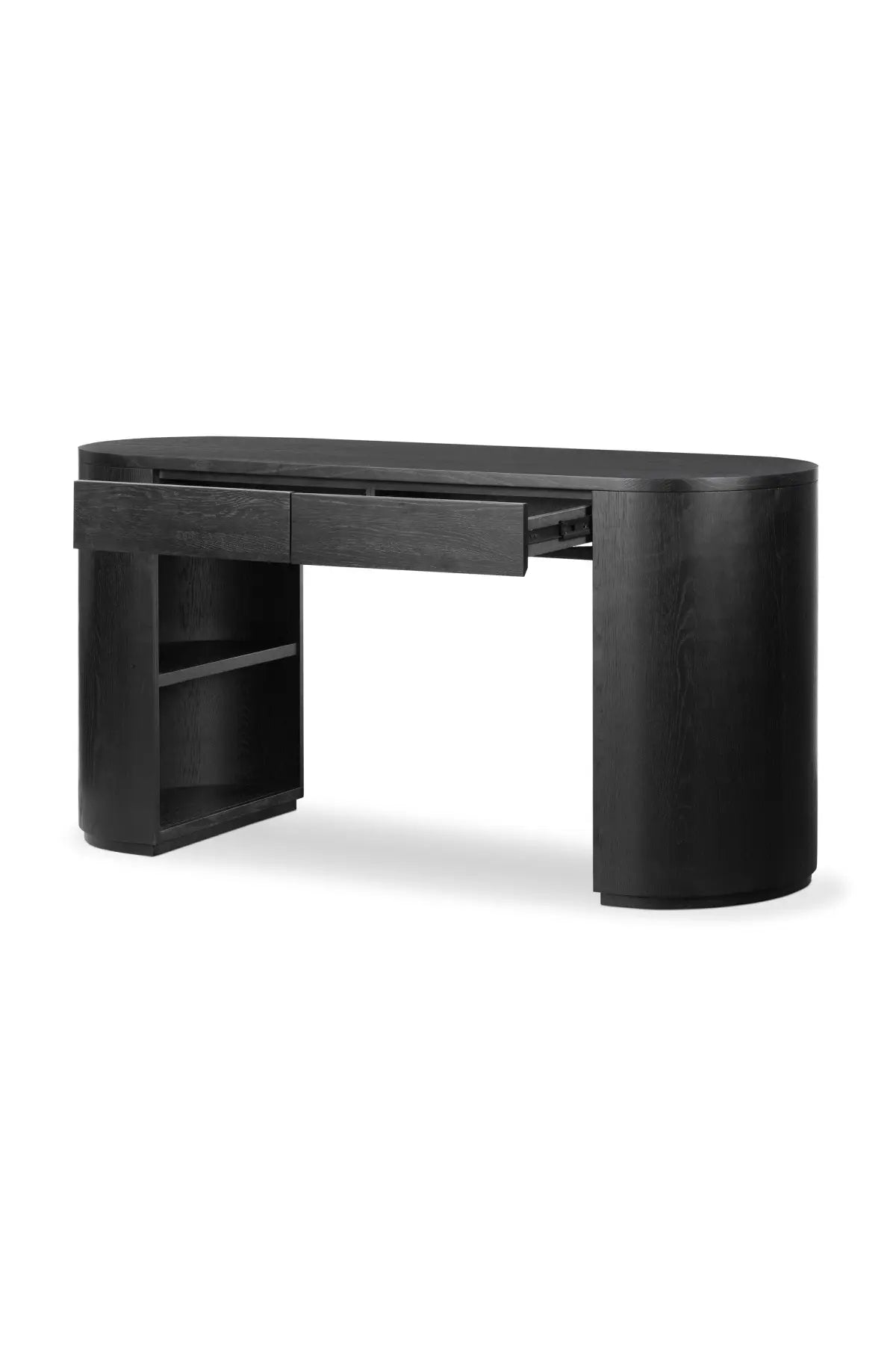 Meet the Pilar Desk. Finished in a rich caramel brown and brushed ebony forms a pill-inspired shape to nod Eighties-era design. Half-cylinder bases feature open interior shelving, with two top pencil drawers to keep supplies handy.