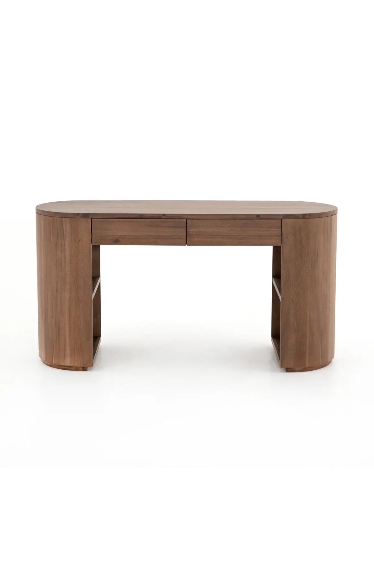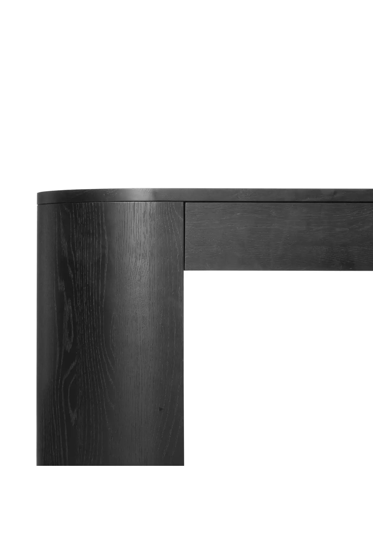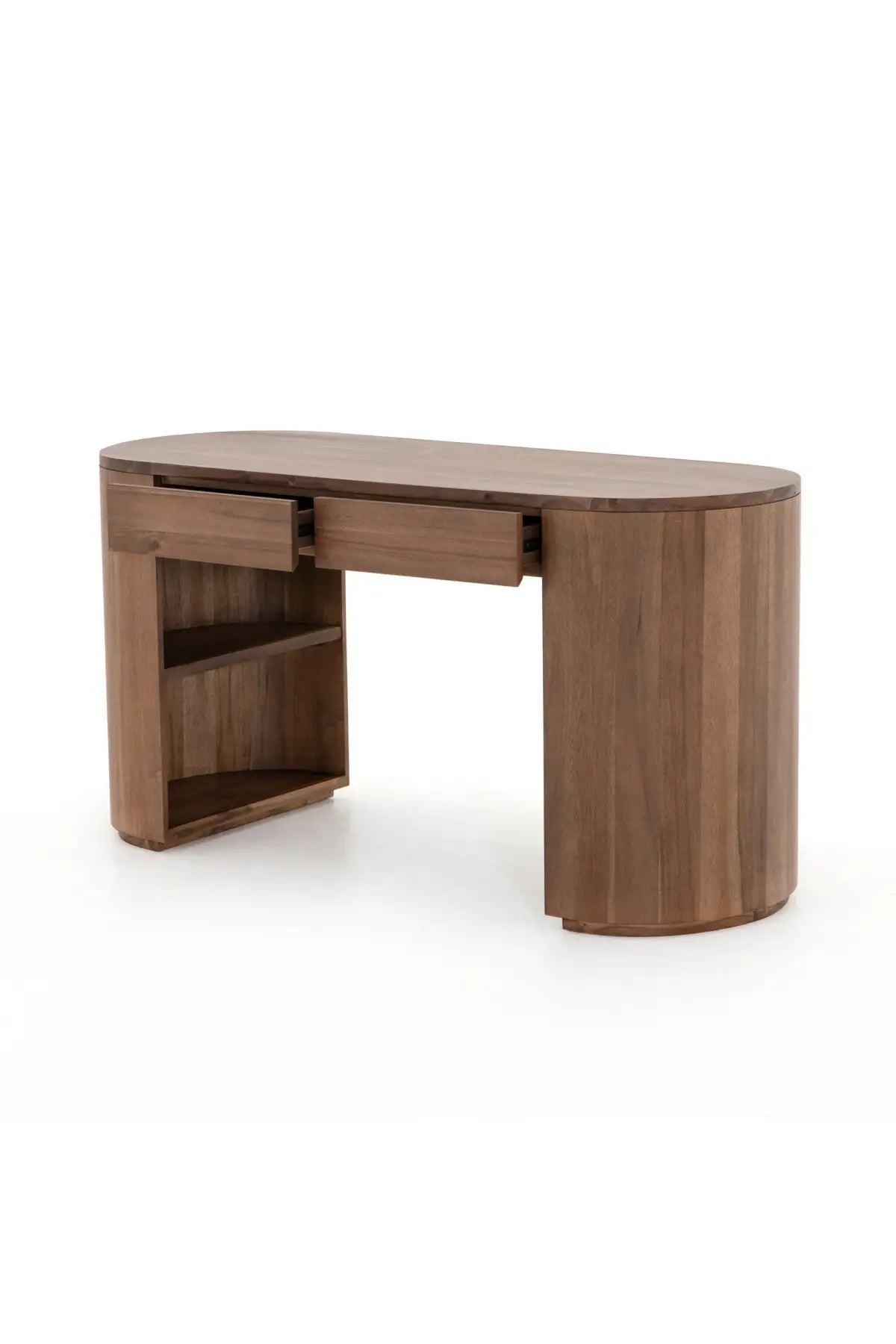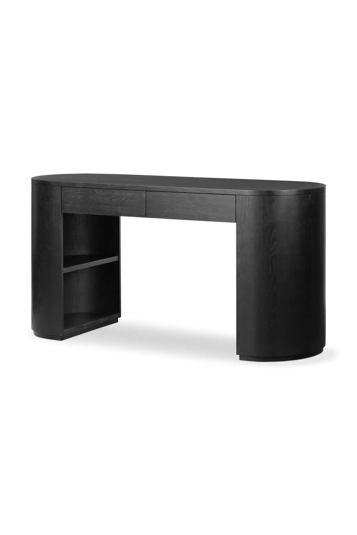 Meet the Pilar Desk. Finished in a rich caramel brown and brushed ebony forms a pill-inspired shape to nod Eighties-era design. Half-cylinder bases feature open interior shelving, with two top pencil drawers to keep supplies handy.