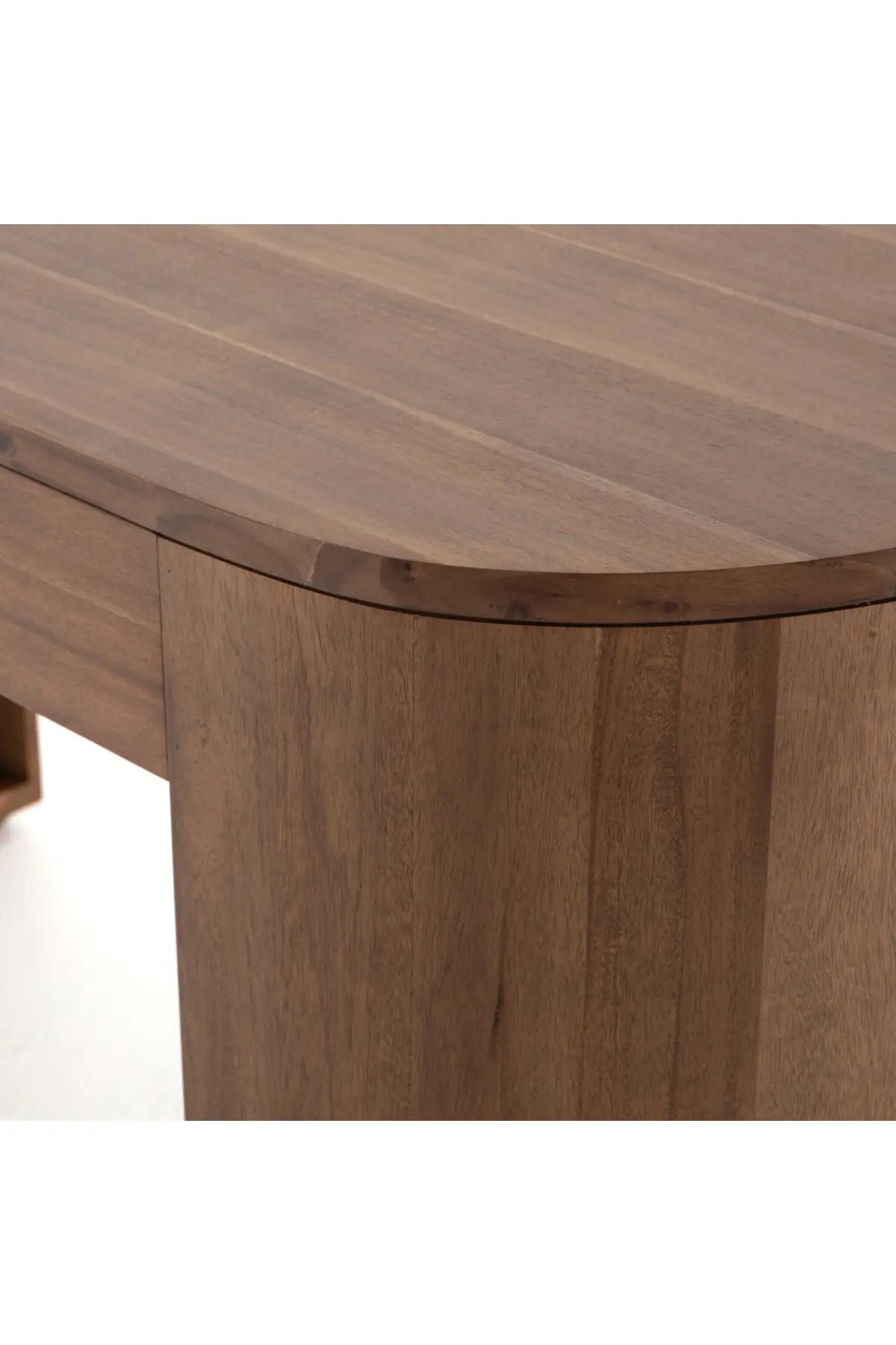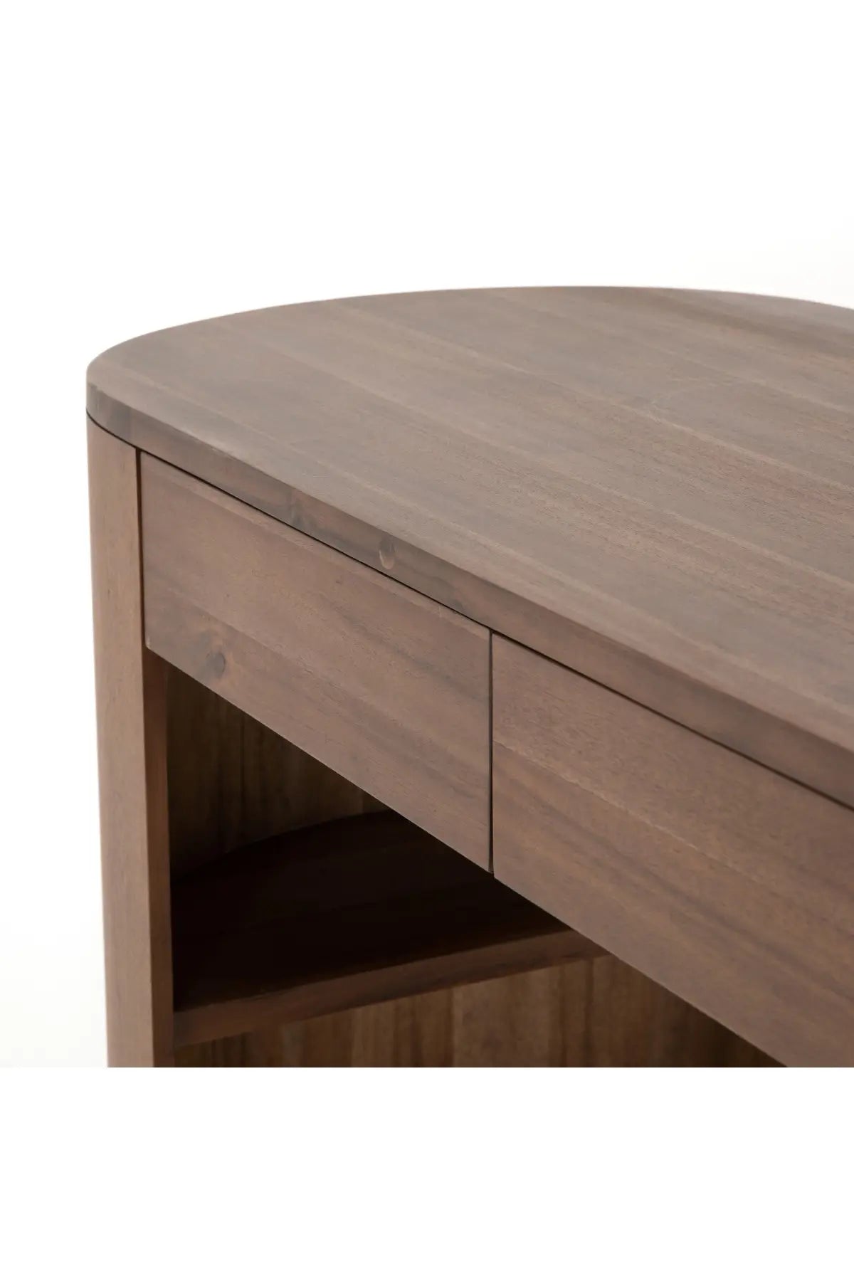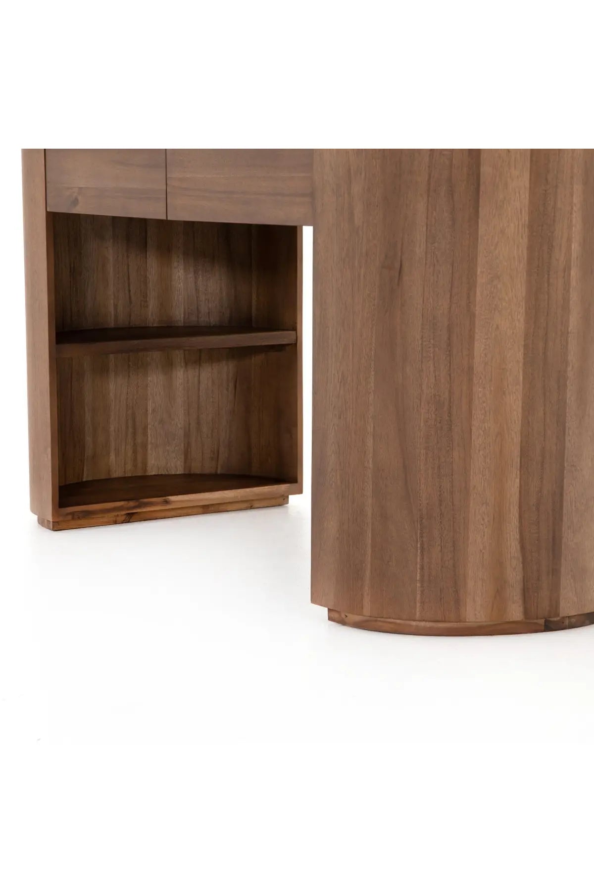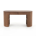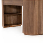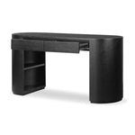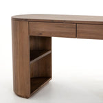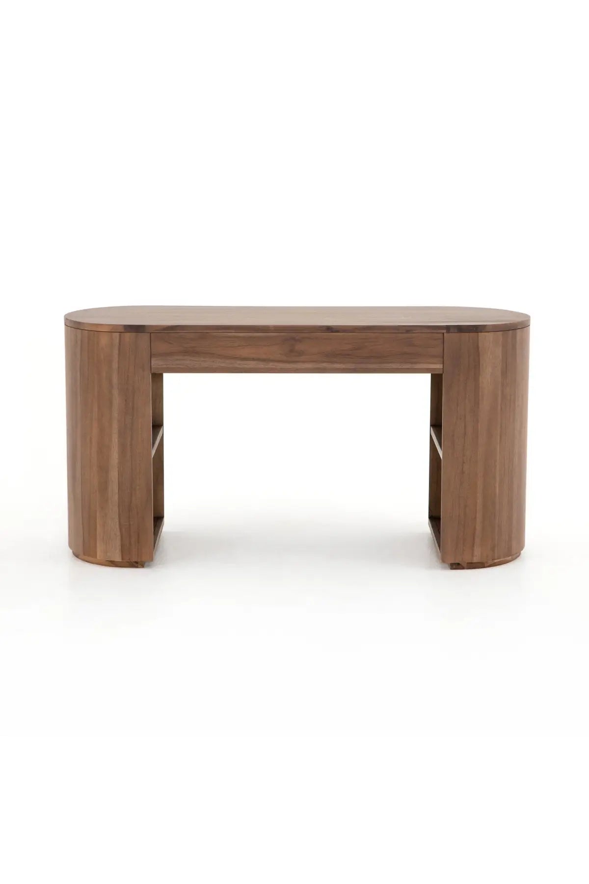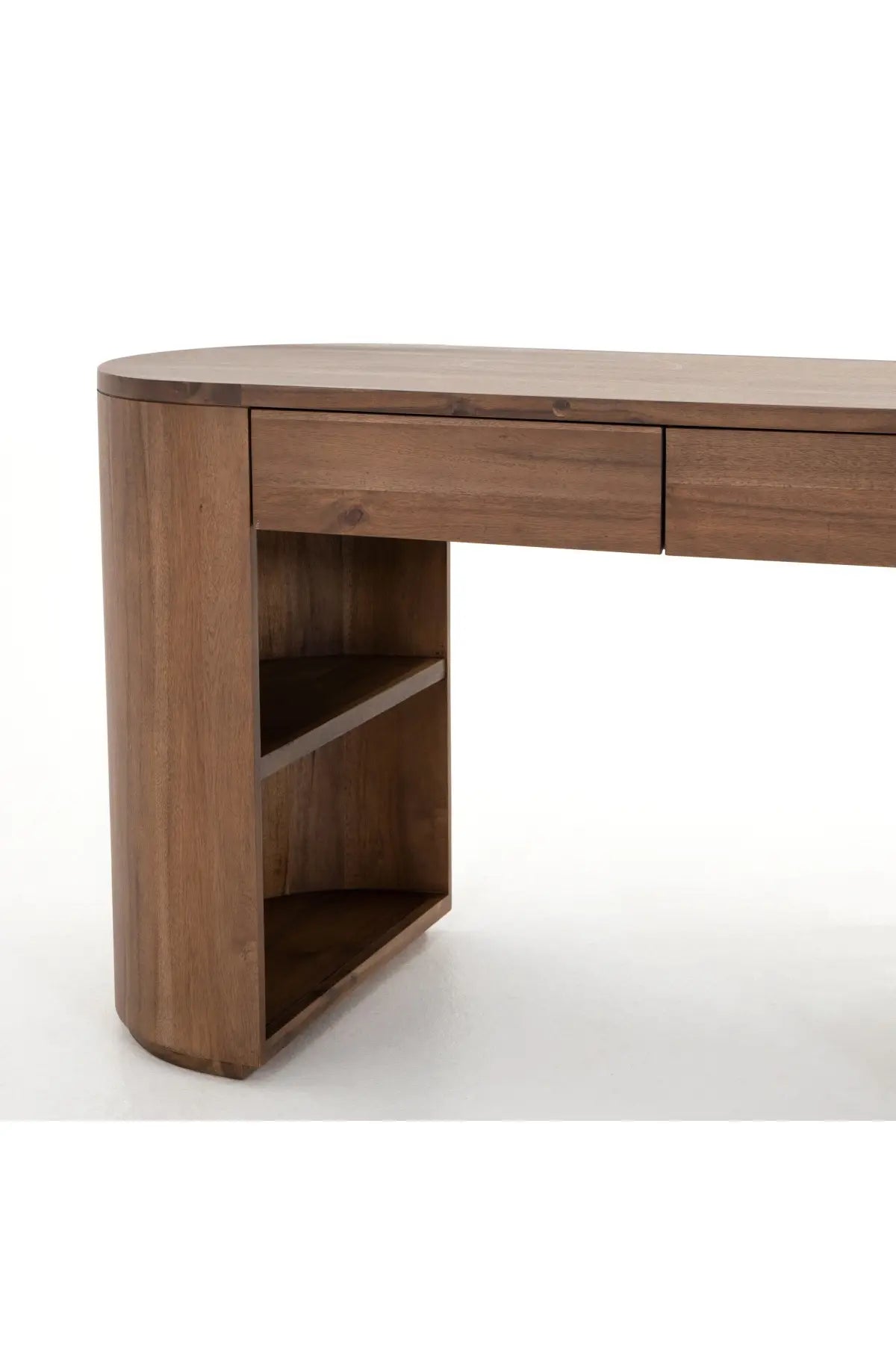 Meet the Pilar Desk. Finished in a rich caramel brown and brushed ebony forms a pill-inspired shape to nod Eighties-era design. Half-cylinder bases feature open interior shelving, with two top pencil drawers to keep supplies handy.