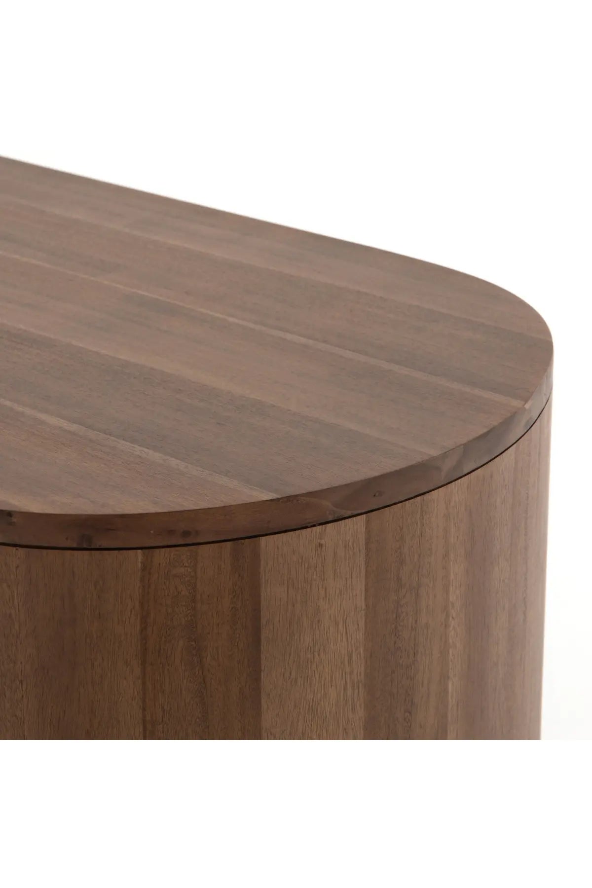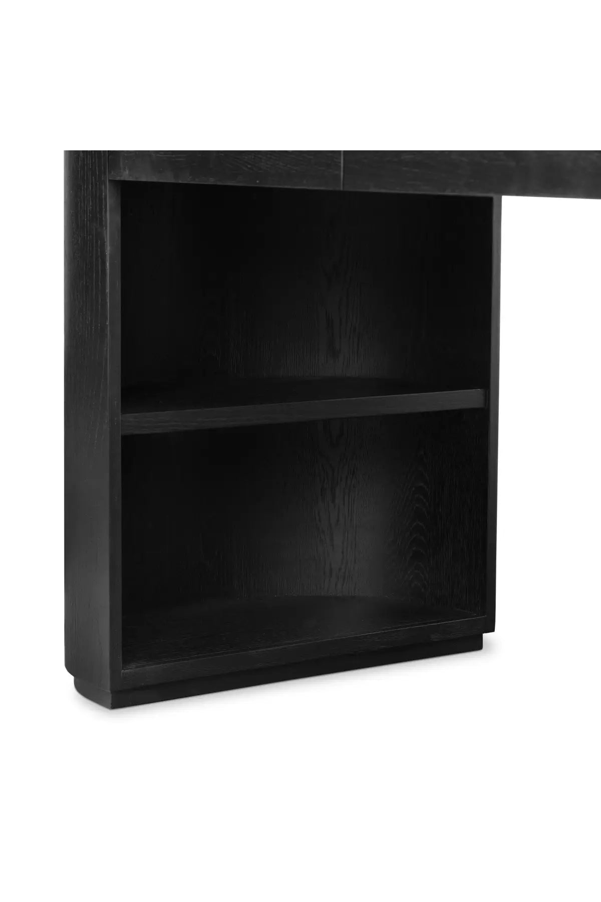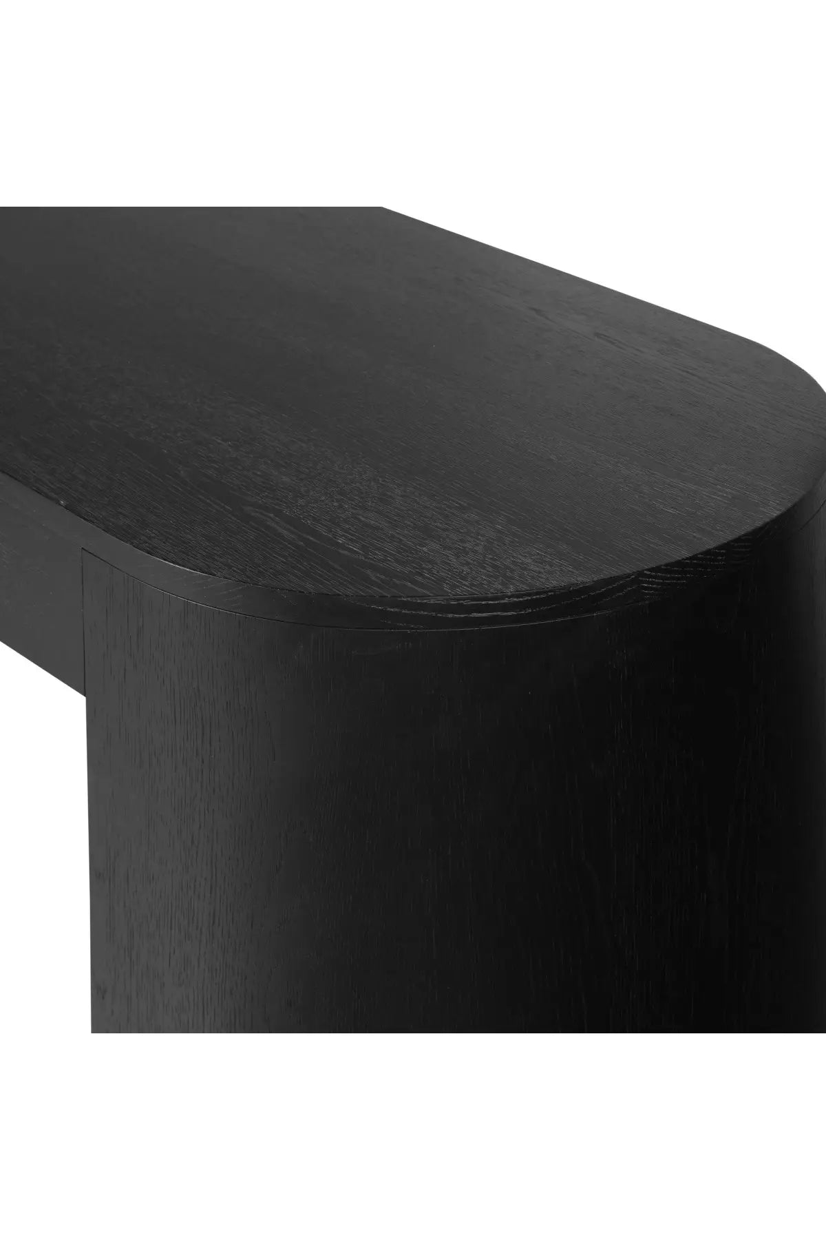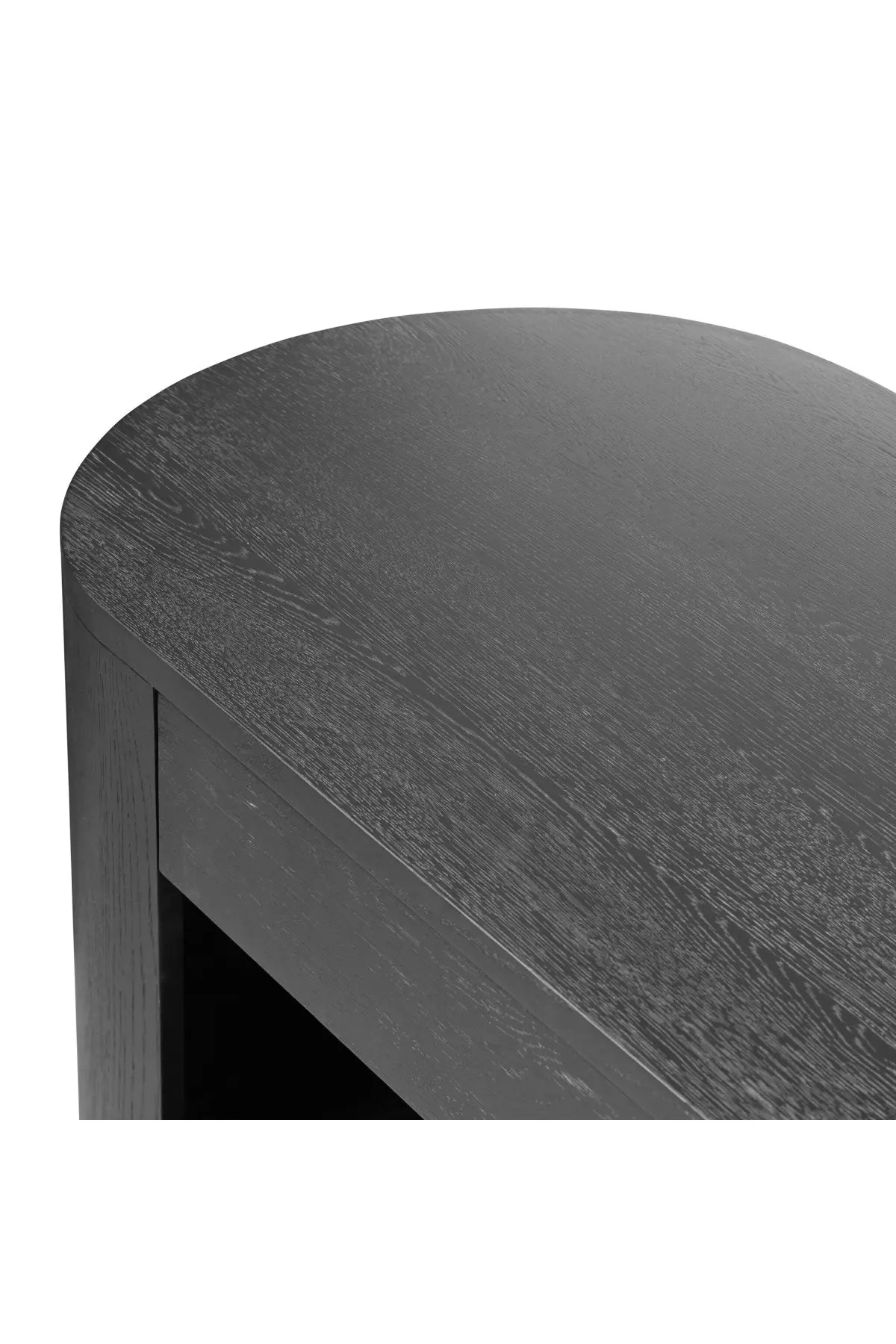 Meet the Pilar Desk. Finished in a rich caramel brown and brushed ebony forms a pill-inspired shape to nod Eighties-era design. Half-cylinder bases feature open interior shelving, with two top pencil drawers to keep supplies handy.