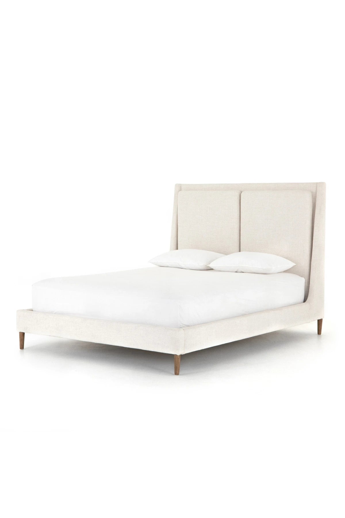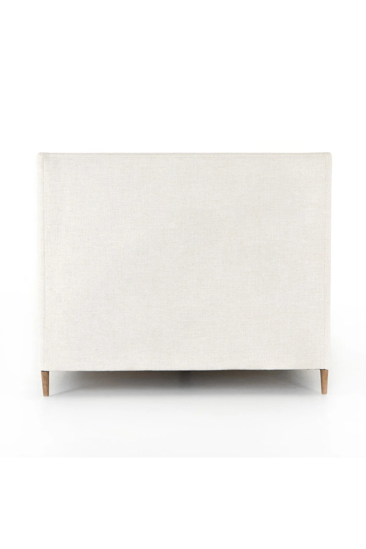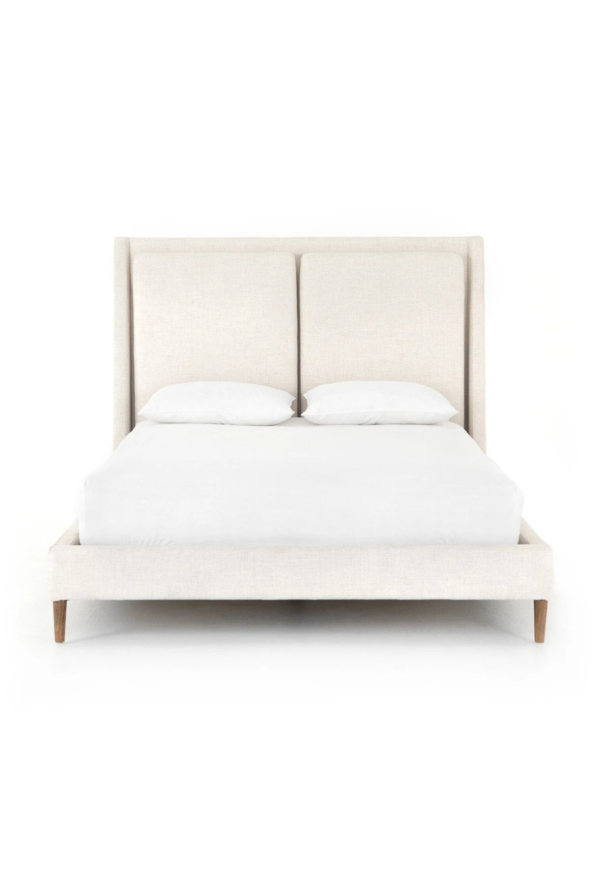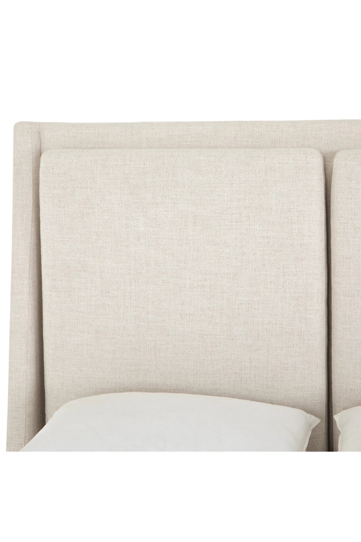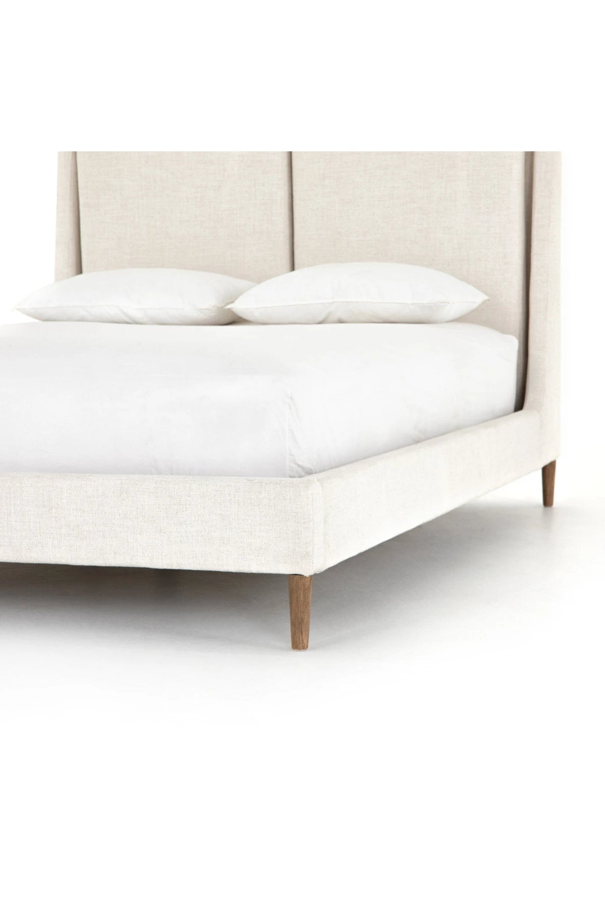 The Potter Bed is light, livable luxury. Upholstered in a cream linen-blend, a tapered headboard features fixed overscale pillows, for a calming look with great depth. Wire-brushed parawood legs lend a warm, natural finishing touch.