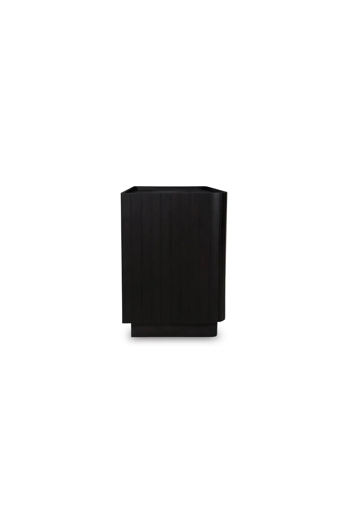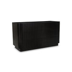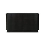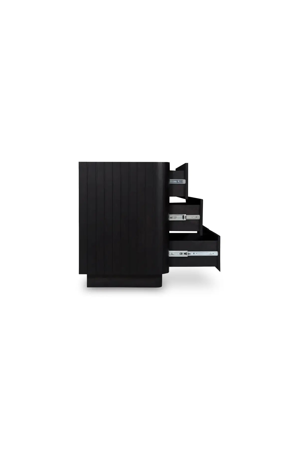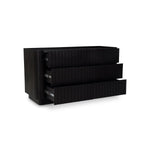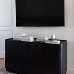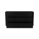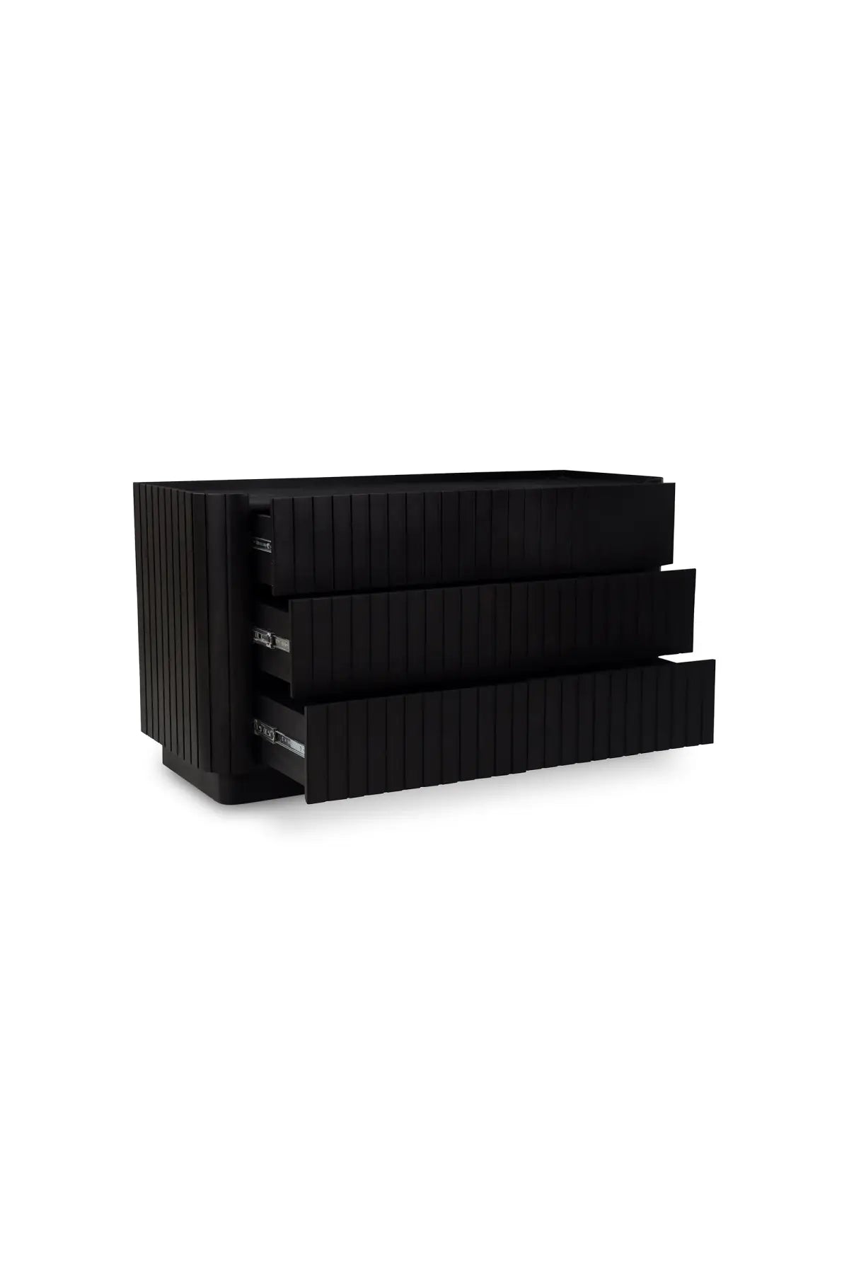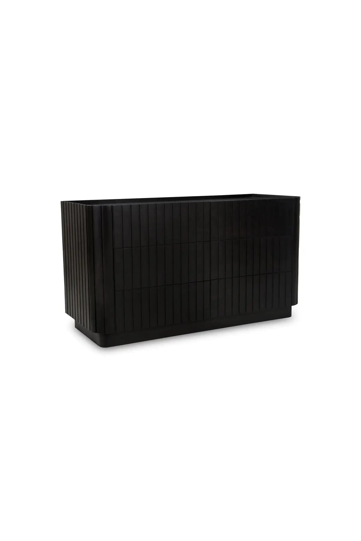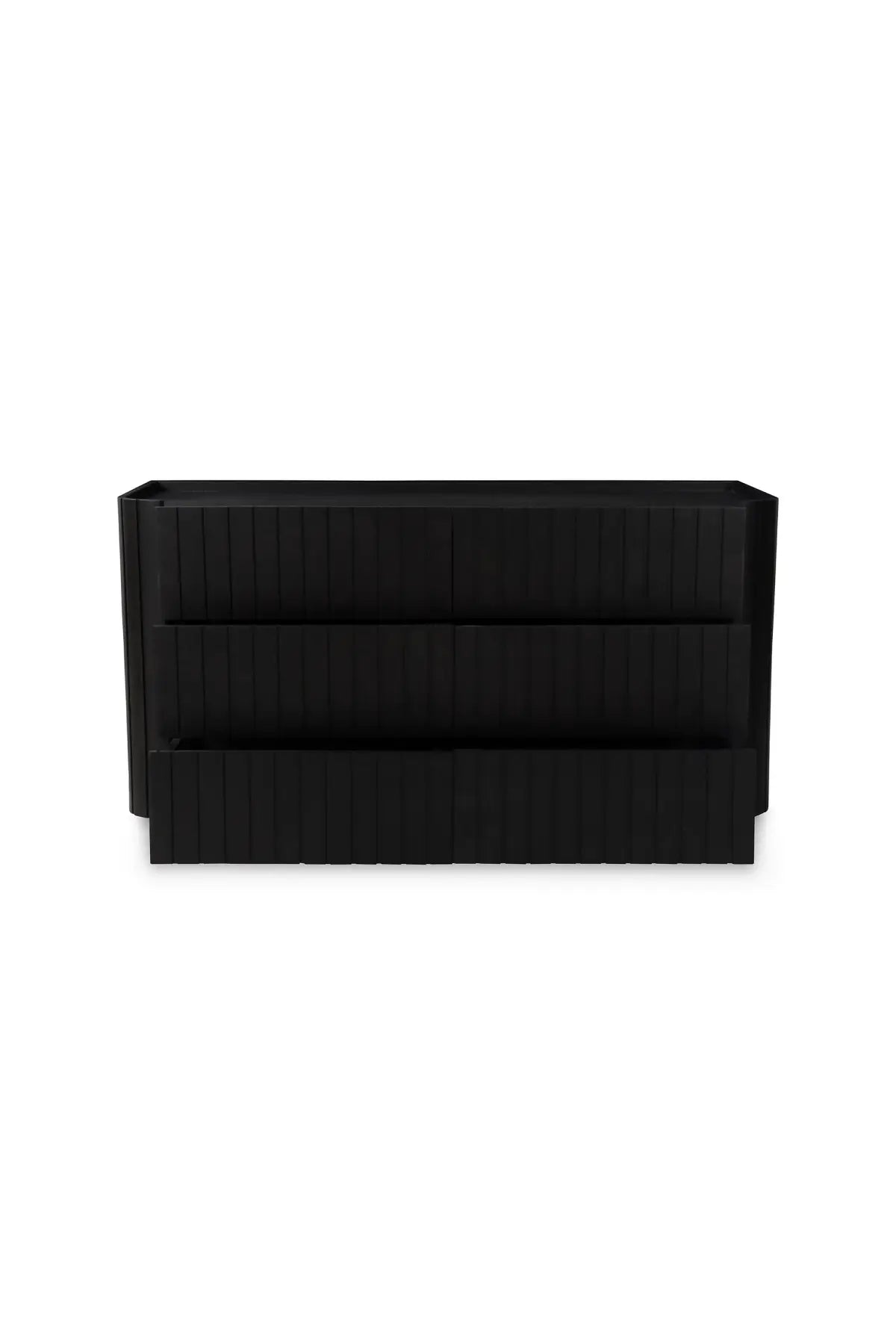 The Povera Dresser balances detail and form offering bold statement appeal and ample storage. This piece anchors the bedroom with its black Acacia facade's gentle ribbing reminiscent of ripples and waves, adding texture and warmth.