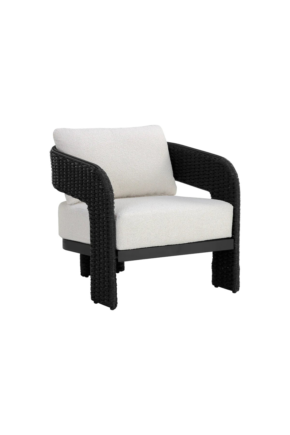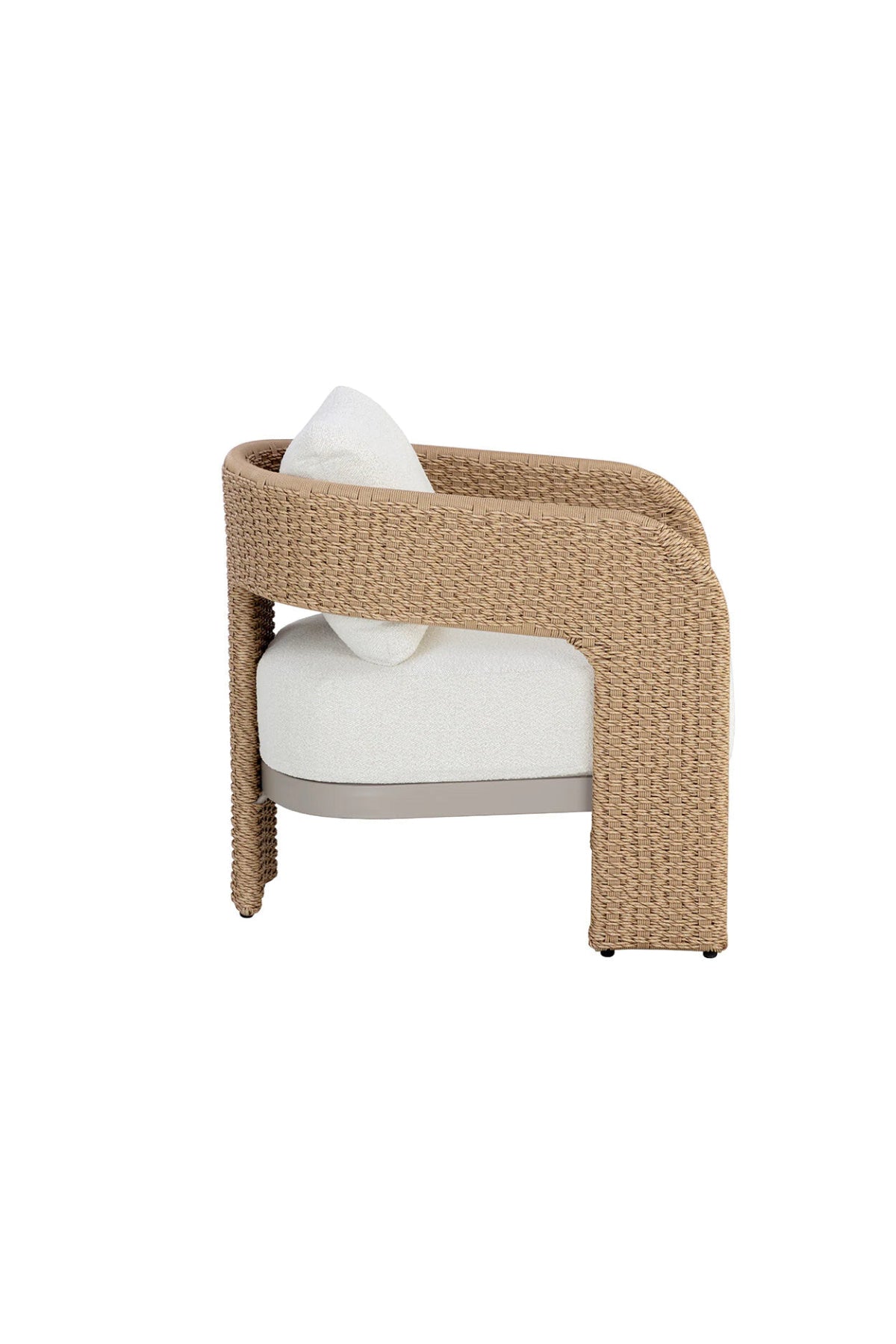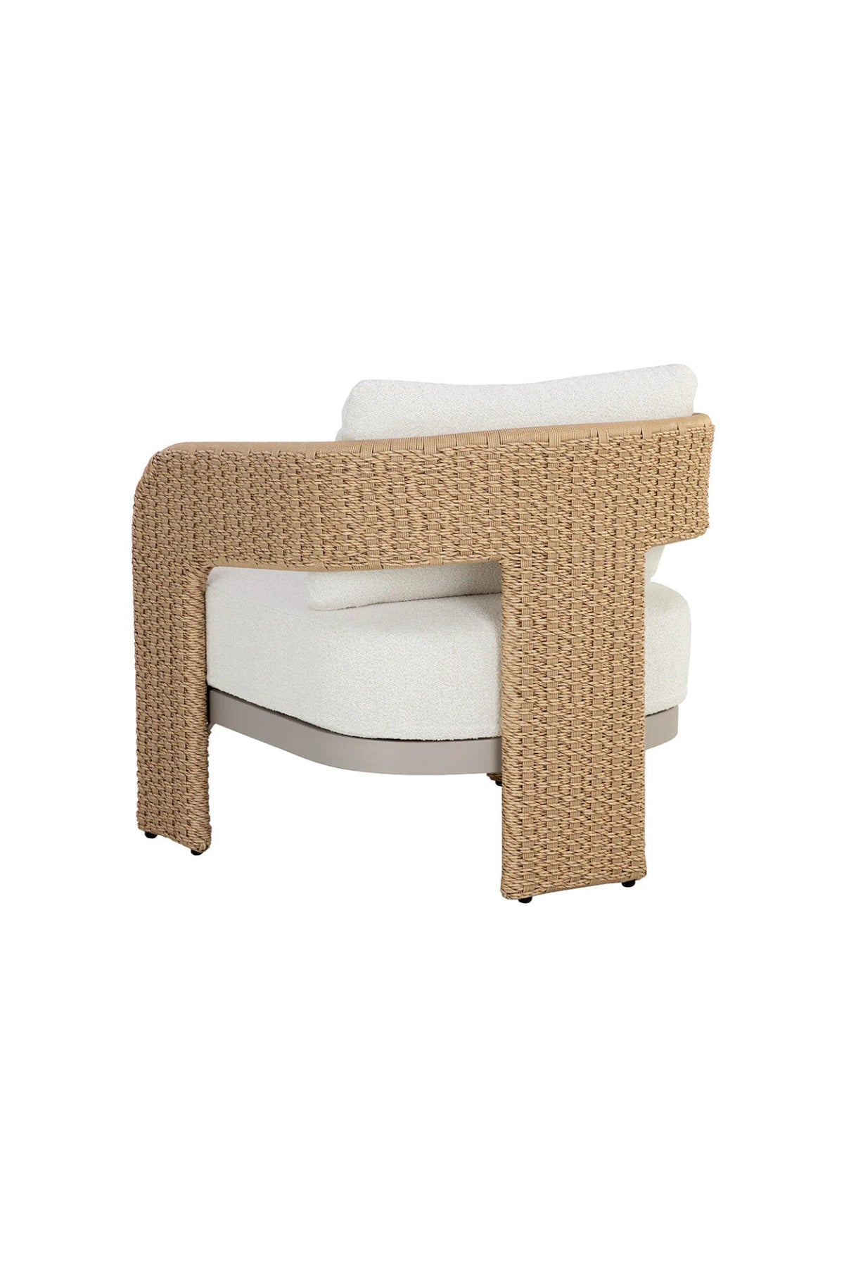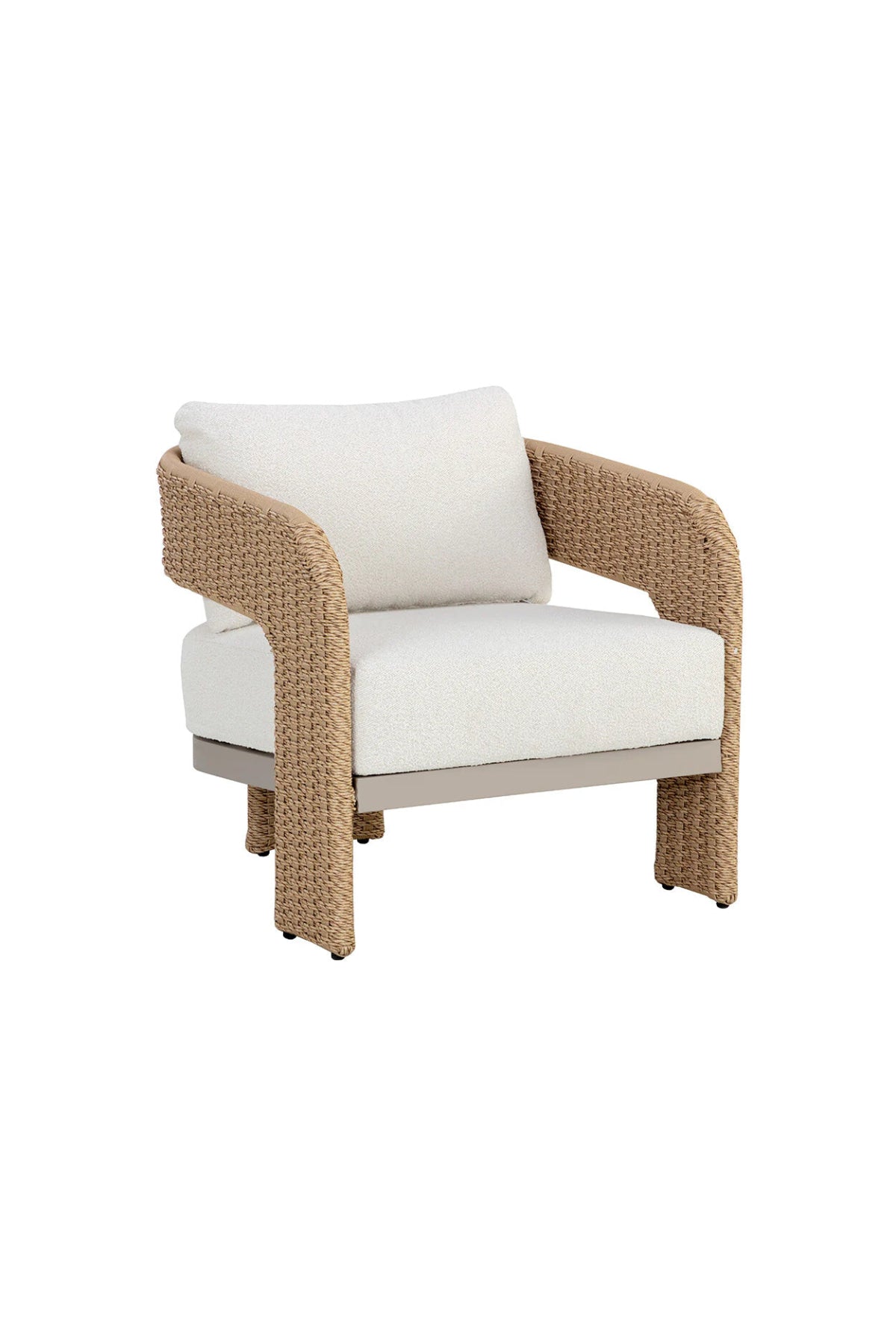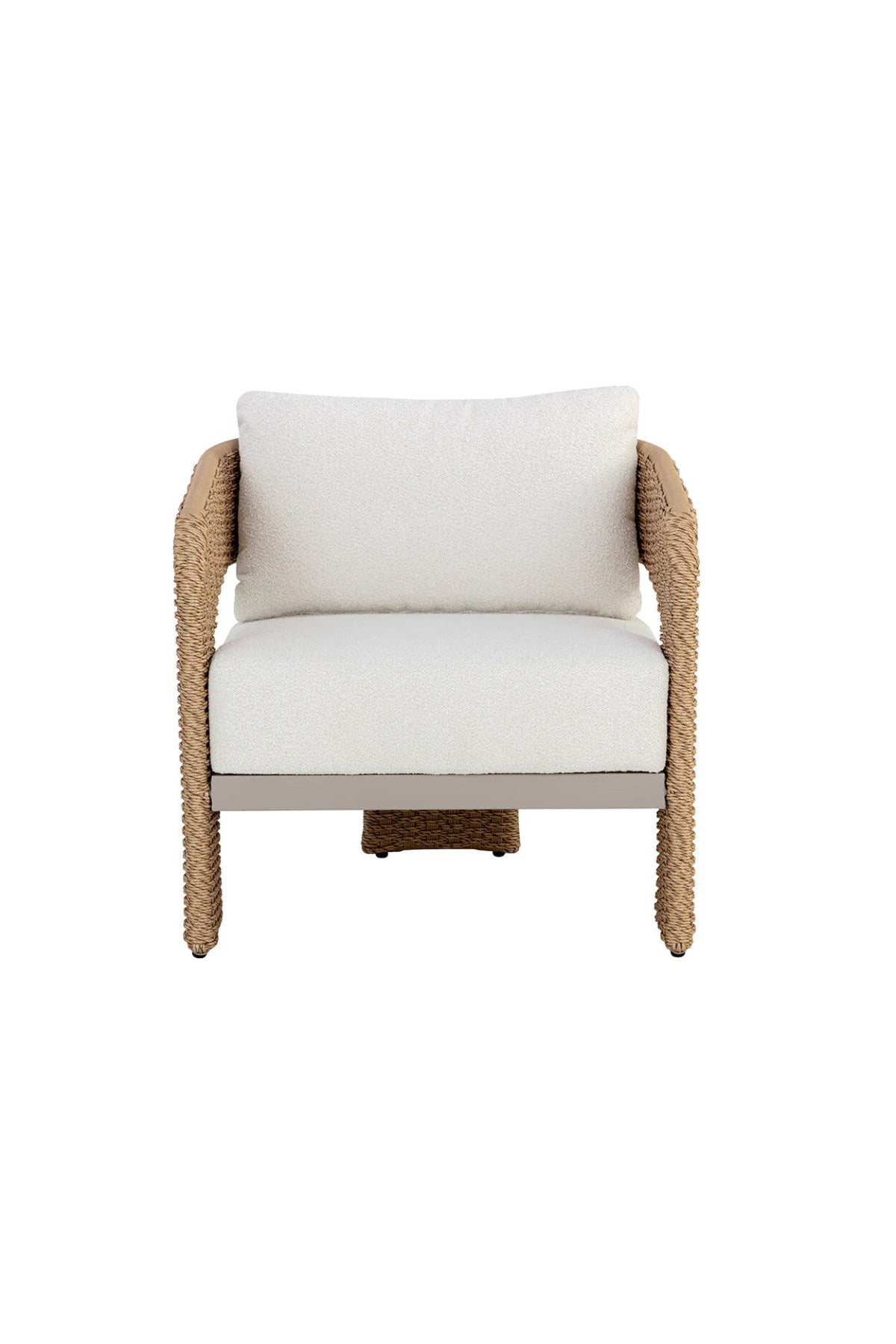The geometric curves of the Pylos Lounge Chair will effortlessly stand out in any outdoor area. Twisted wicker wraps around an aluminum frame for a defined, textured look. Soft cushioning in our louis cream outdoor boucle performance fabric ties the look together. Performance fabric is moisture repellent, durable and easy to clean. Suitable for indoor and covered outdoor spaces.