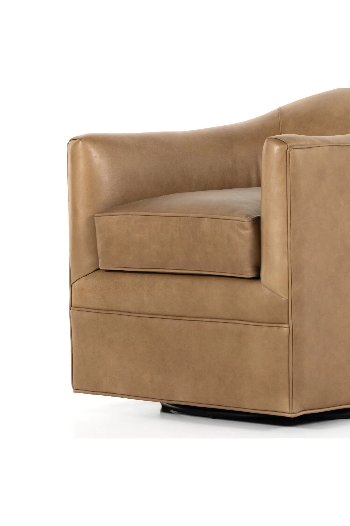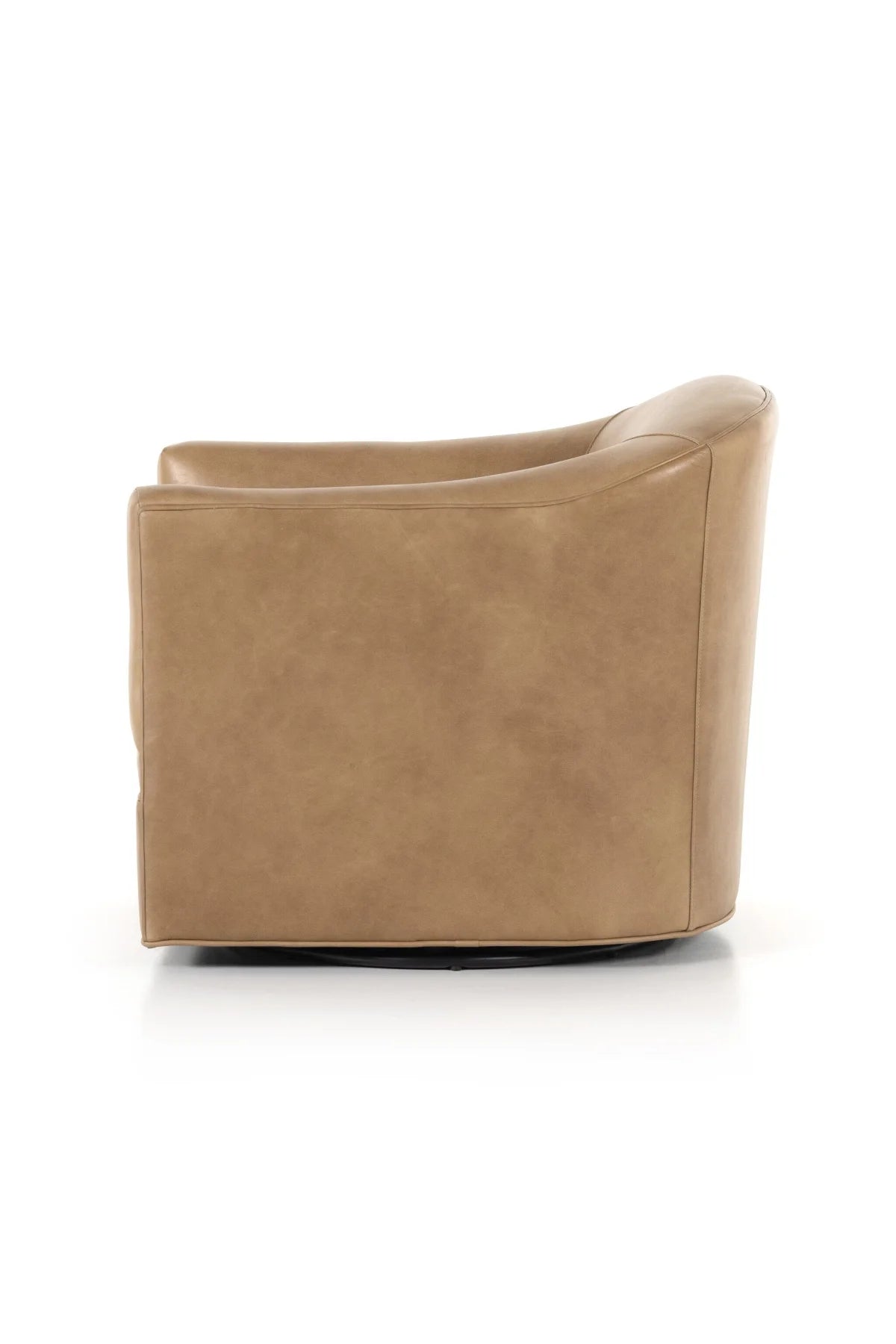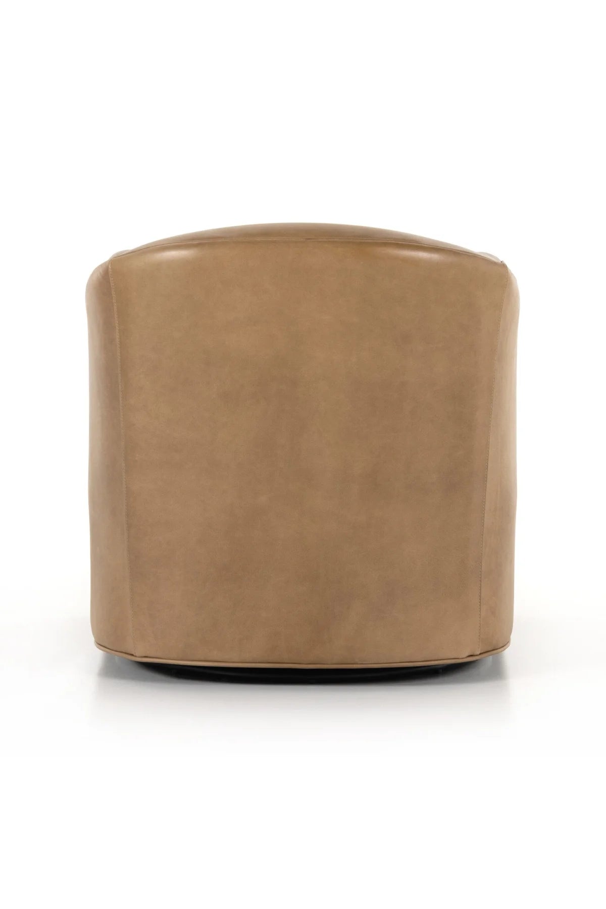 Meet the Quinton Swivel Chair. Taupe top-grain leather covers transitional barrel-shaped seating with a 360-degree swivel. Leather is intentionally finished for a casual, lived-in look.