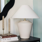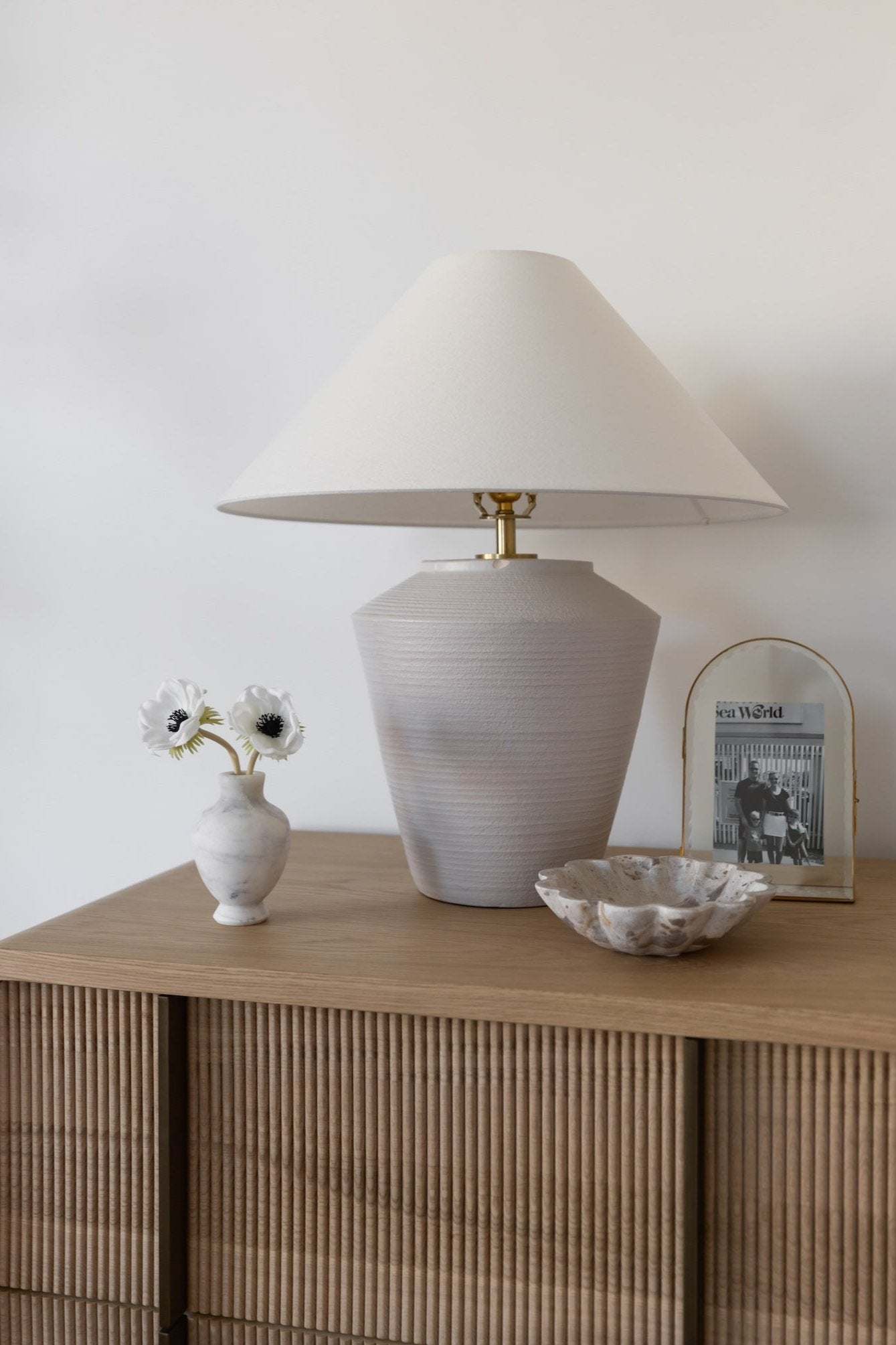 Meet the Rachie Table Lamp. Inspired by hand troweled plaster and a traditional empire shaped shade, Rachie is a staple table lamp that lends itself to any space! It was designed to add texture where it may not always be possible! Bulb(s) not included.