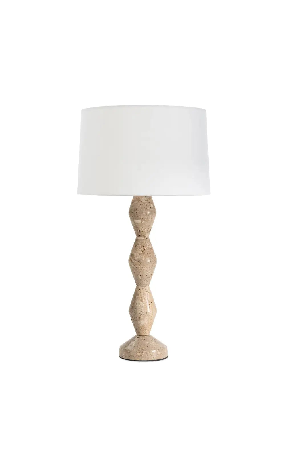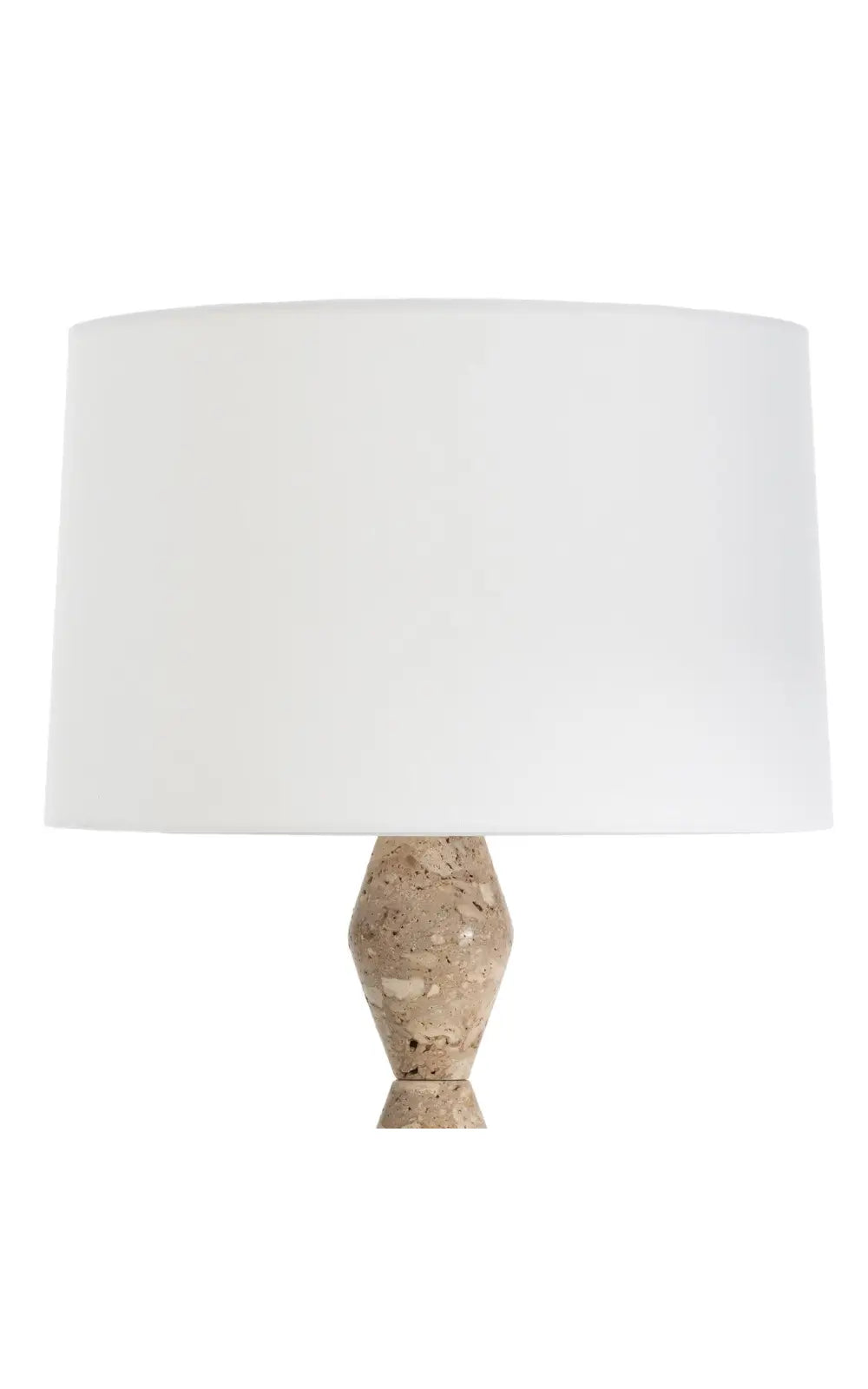 Meet the Regina Andrew Crew Travertine Buffet Lamp. The Crew Travertine Buffet Lamp has a striking geometric travertine base set in neutral tones that evokes hand turned details. The fixture is crowned with an elegant natural linen shade, making this a stately piece for a wide range of buffet furniture. Crew's overall vibe is distinctly mid-century modern. Bulb(s) not included.