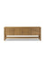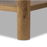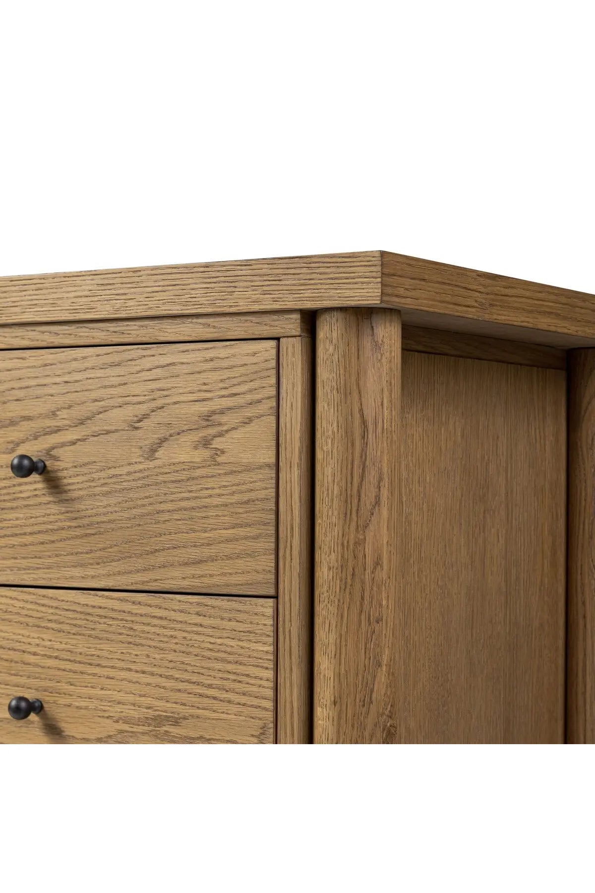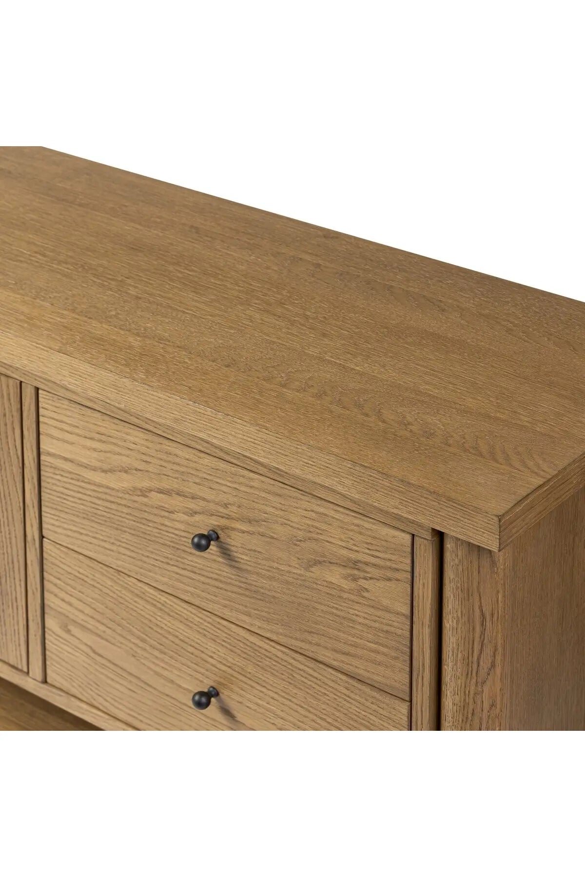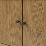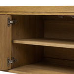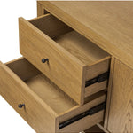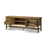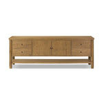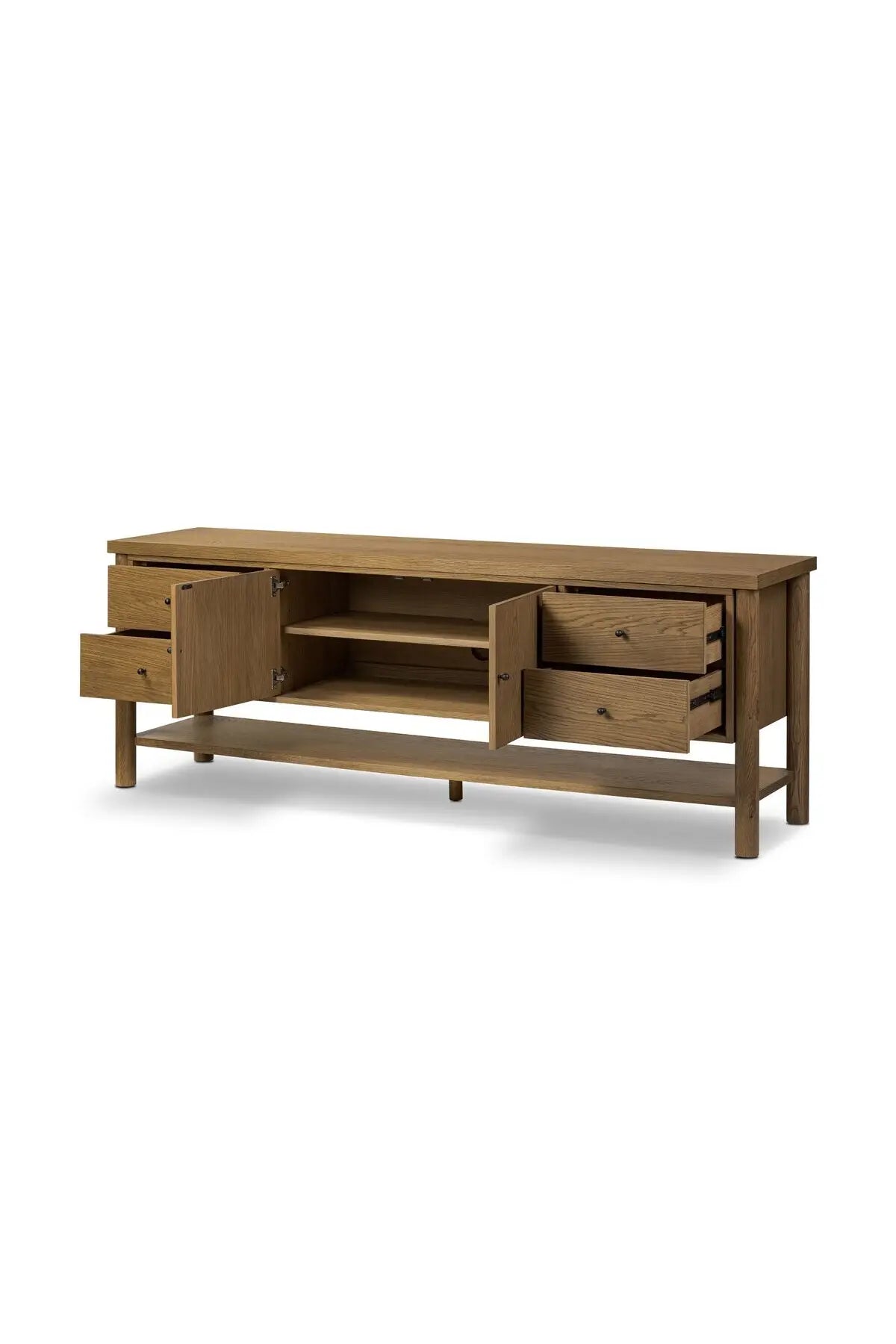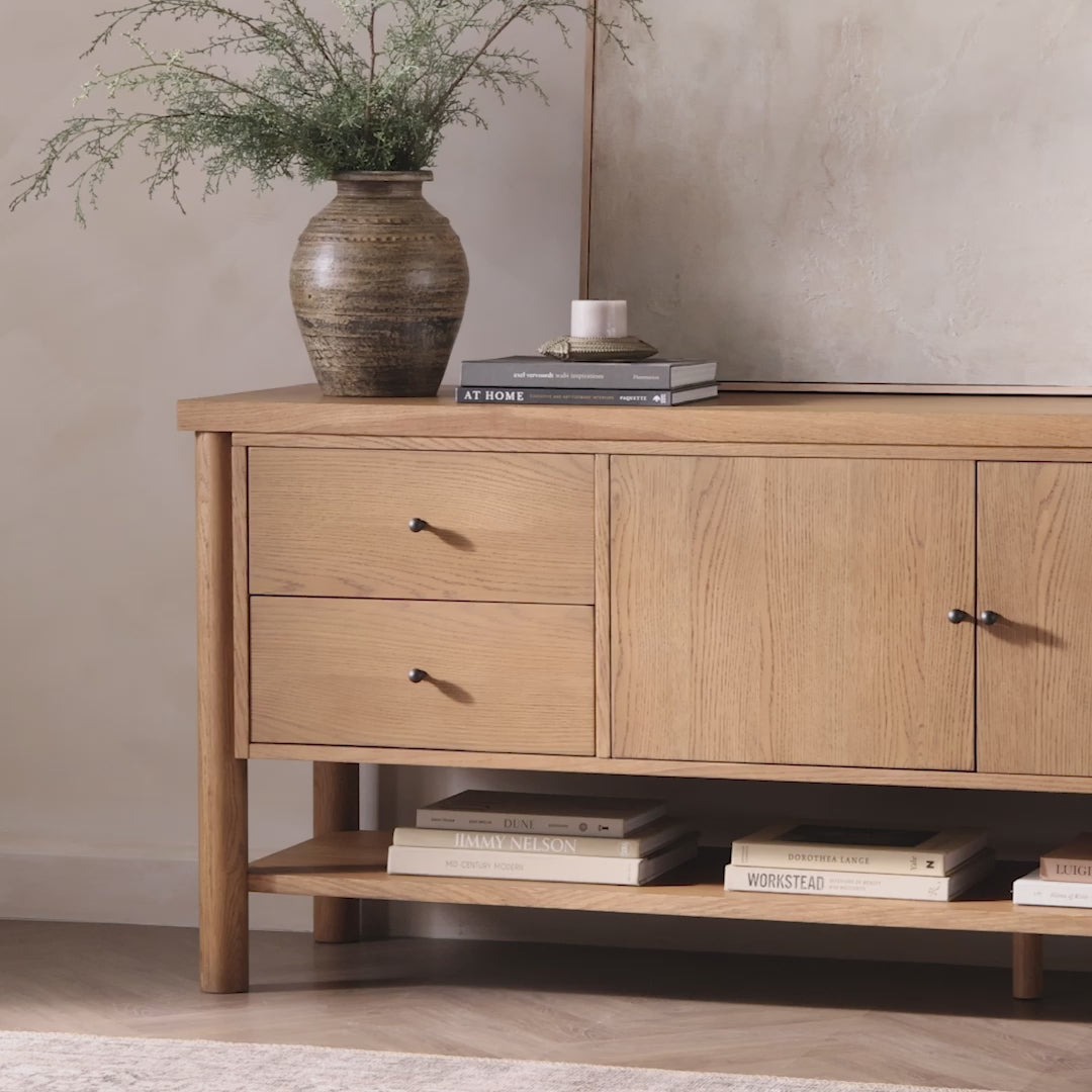 Meet the Roark Media Console. Crafted from oak with a warm amber finish and rounded dowel legs. An overhang top and simple gunmetal-finished hardware complete the look, with drawers and a spacious lower shelf for all your media storage needs.