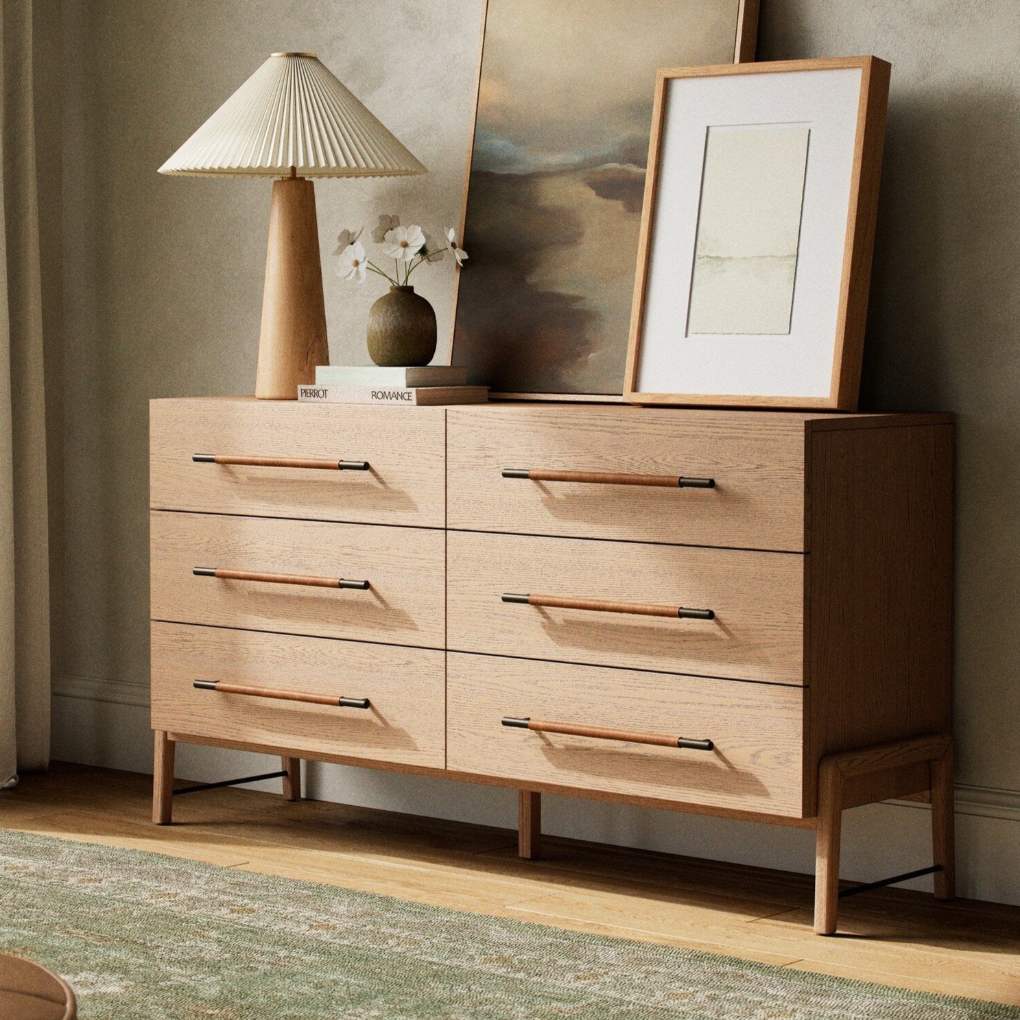 Meet the Rosedale 6 Drawer Dresser. Light-finished or Ebony-finished oak forms a clean silhouette for six spacious drawers with iron hardware wrapped in tan top-grain leather. This item has been modified to comply with the STURDY Act.