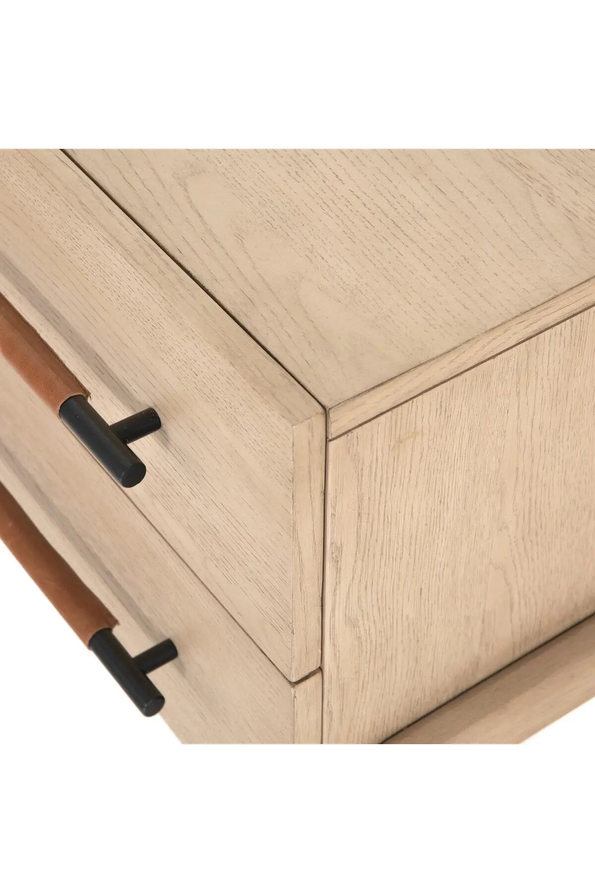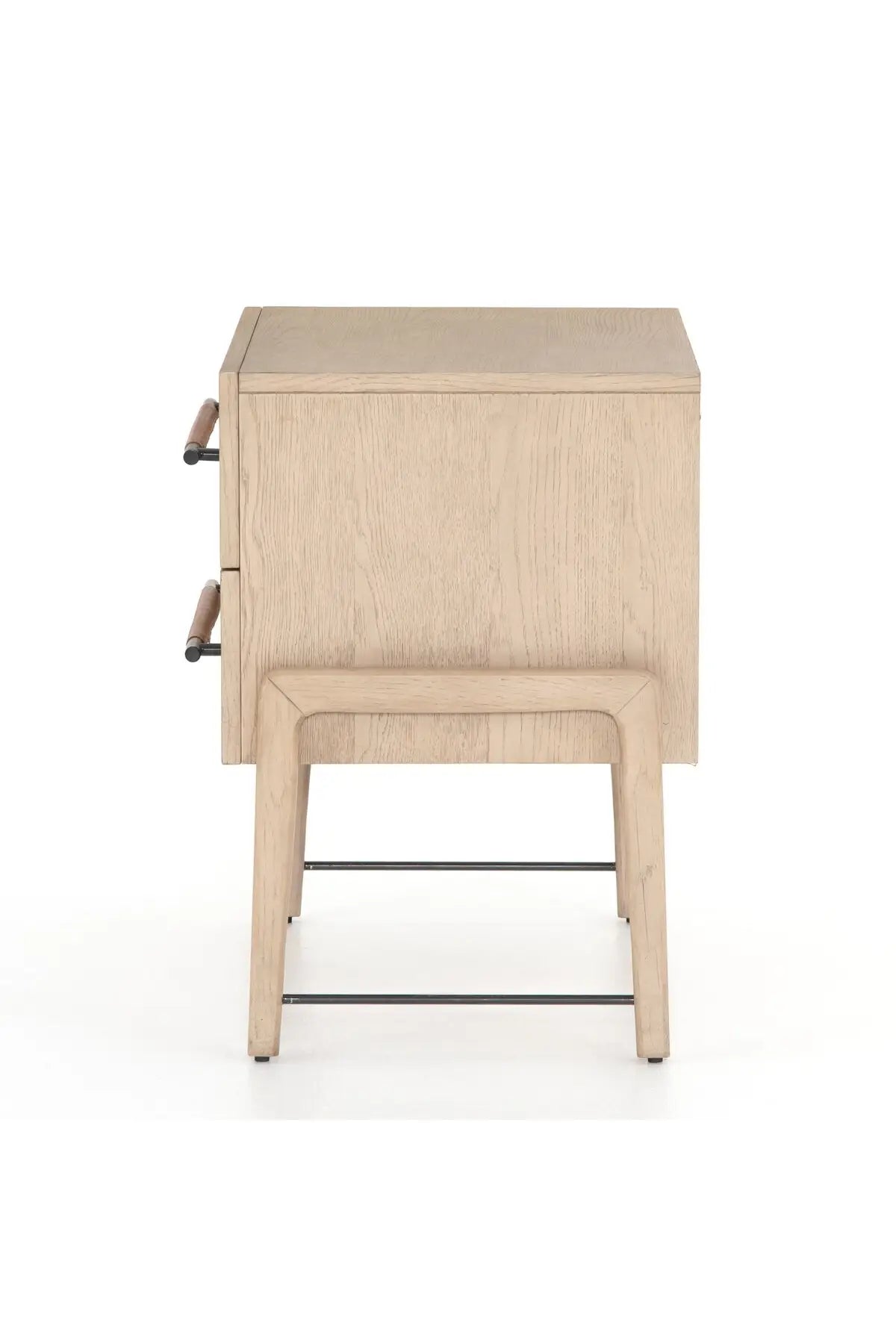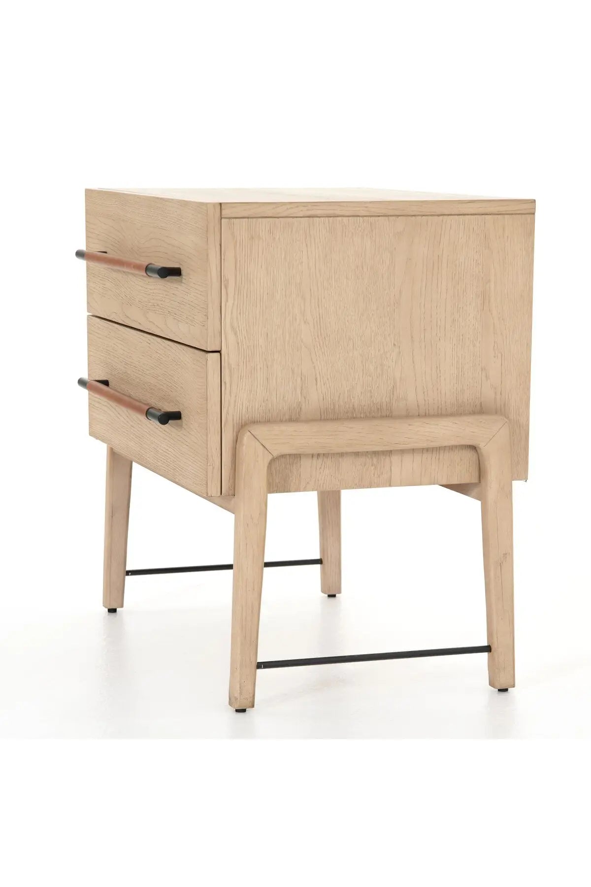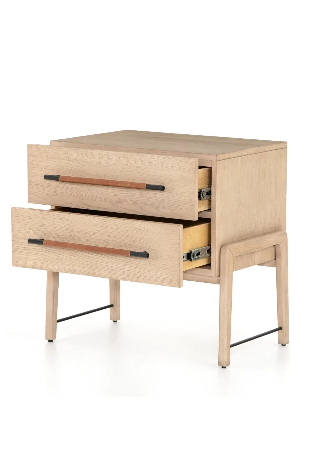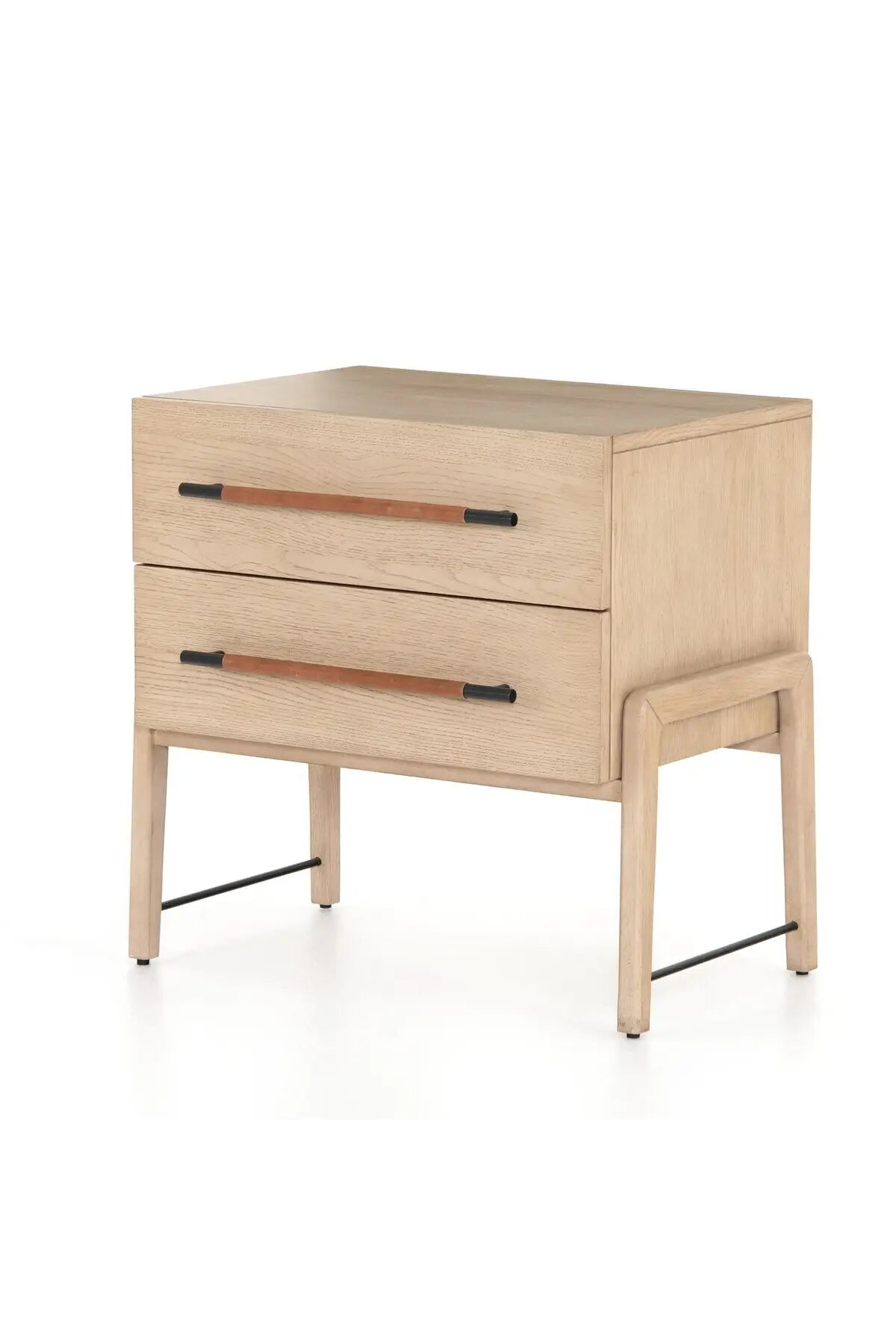 Meet the Rosedale Nightstand. Light-finished oak forms a clean silhouette for dual drawers with iron hardware wrapped in tan top-grain leather.