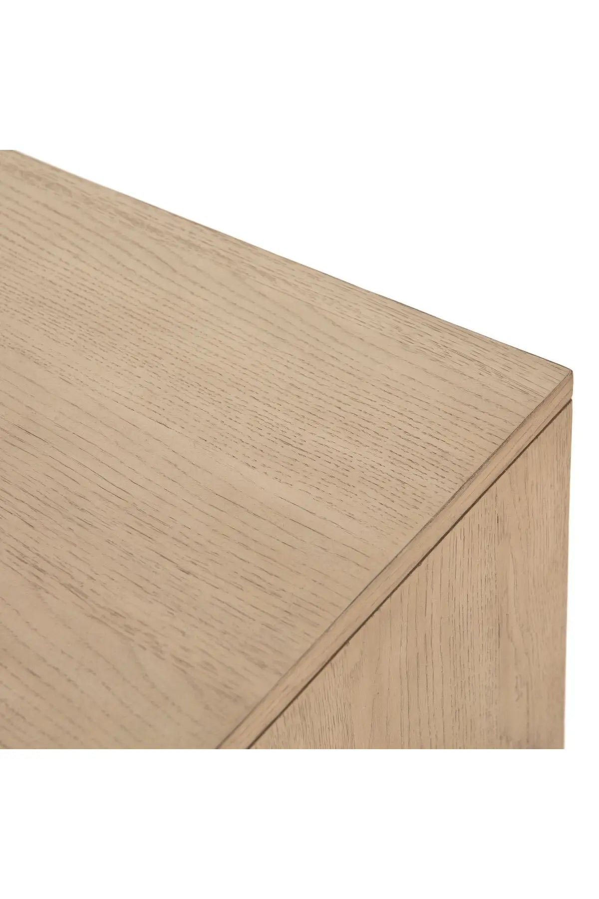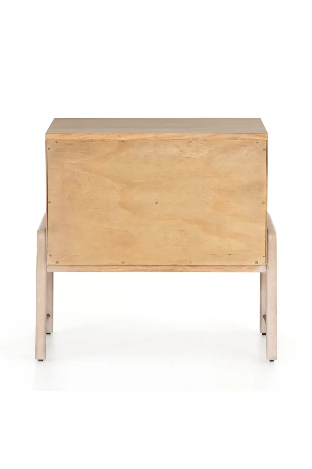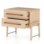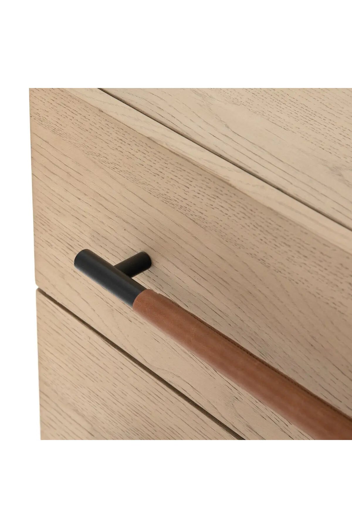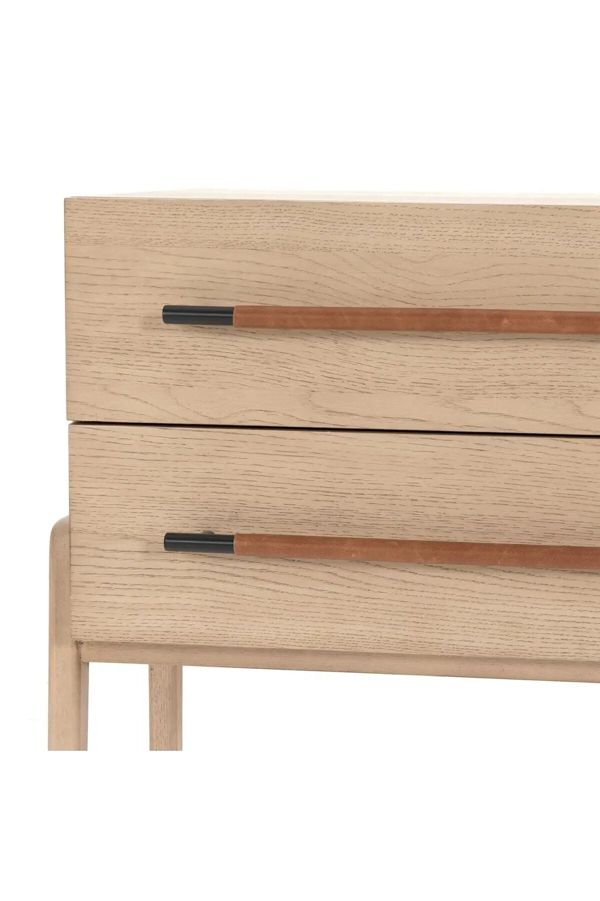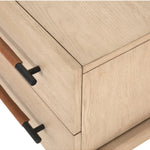 Meet the Rosedale Nightstand. Light-finished oak forms a clean silhouette for dual drawers with iron hardware wrapped in tan top-grain leather.