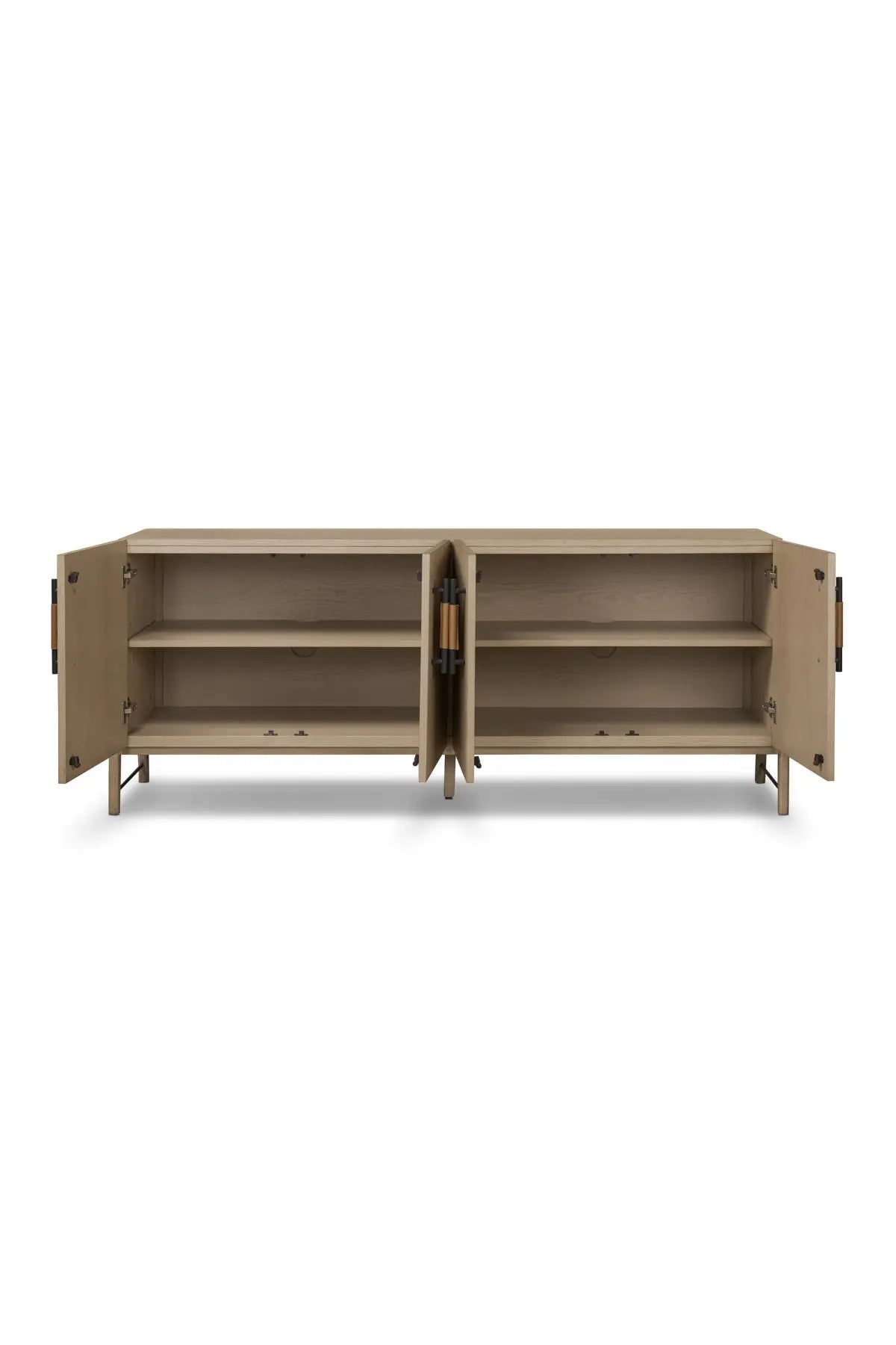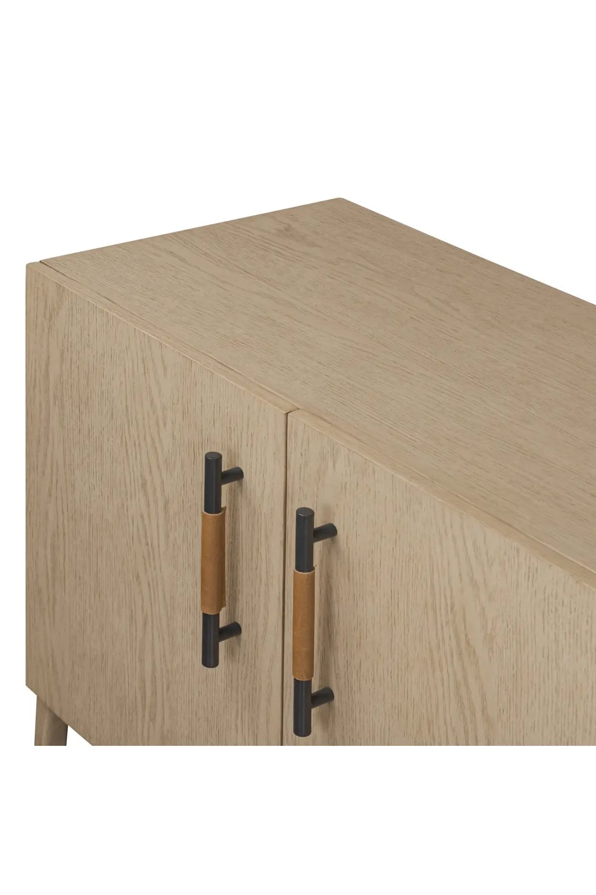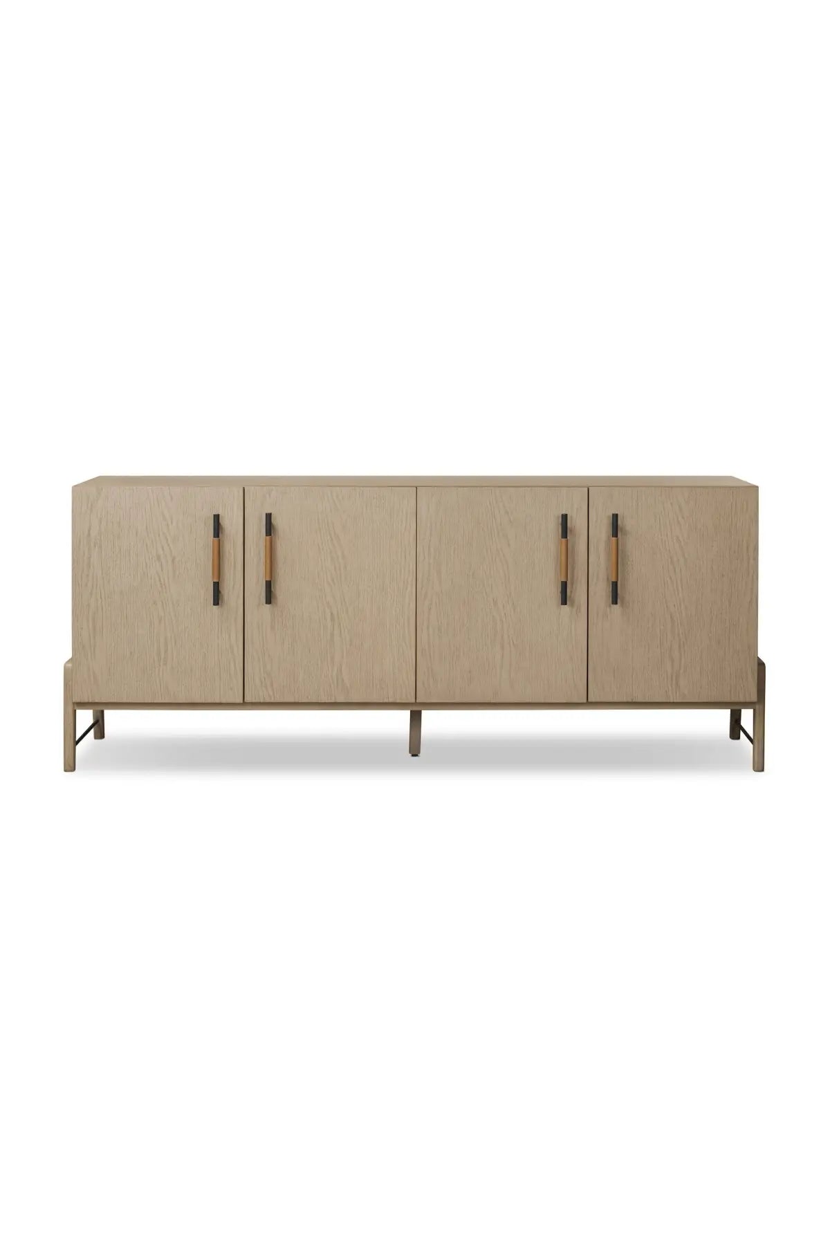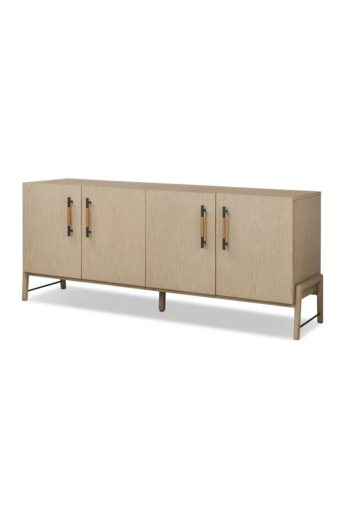 Meet the Rosedale Sideboard. Accented with iron hardware wrapped in top-grain leather, light-finished or black-finished oak veneer forms a clean silhouette with plenty of storage. Outset legs add an element of interest.