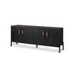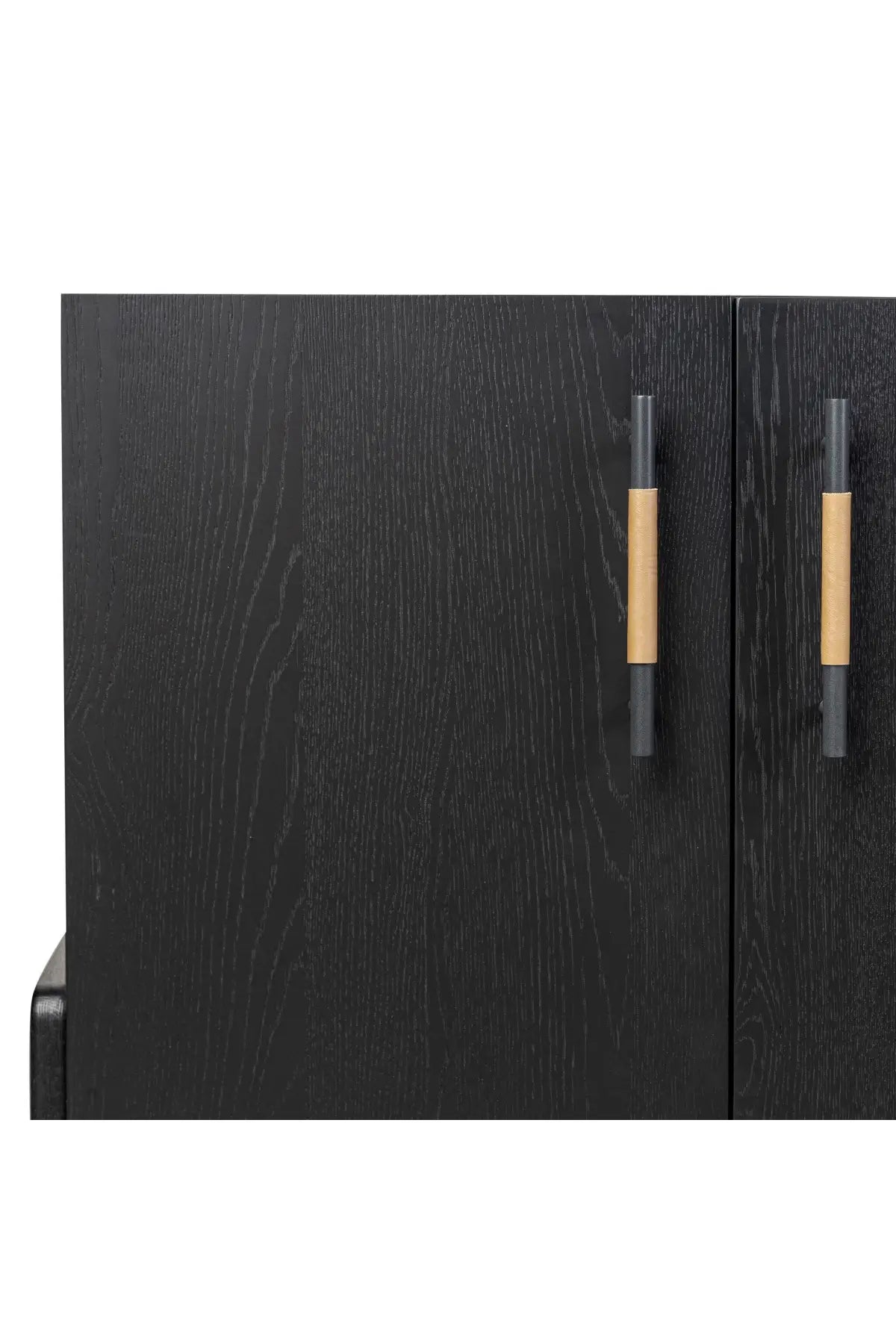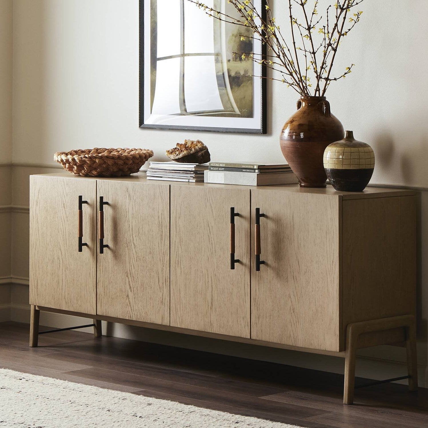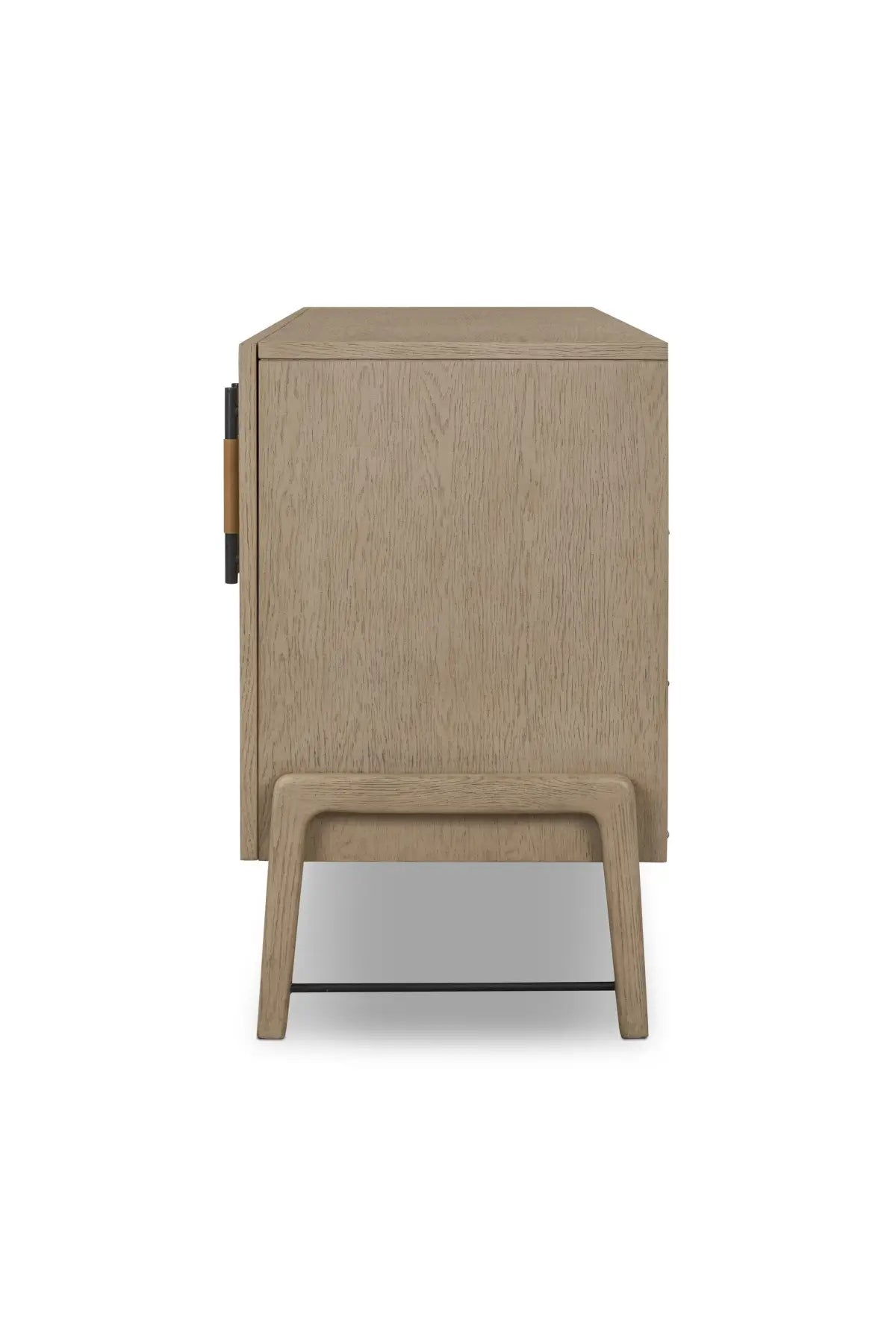 Meet the Rosedale Sideboard. Accented with iron hardware wrapped in top-grain leather, light-finished or black-finished oak veneer forms a clean silhouette with plenty of storage. Outset legs add an element of interest.