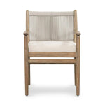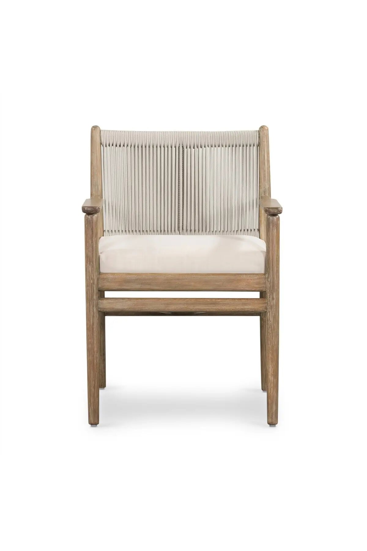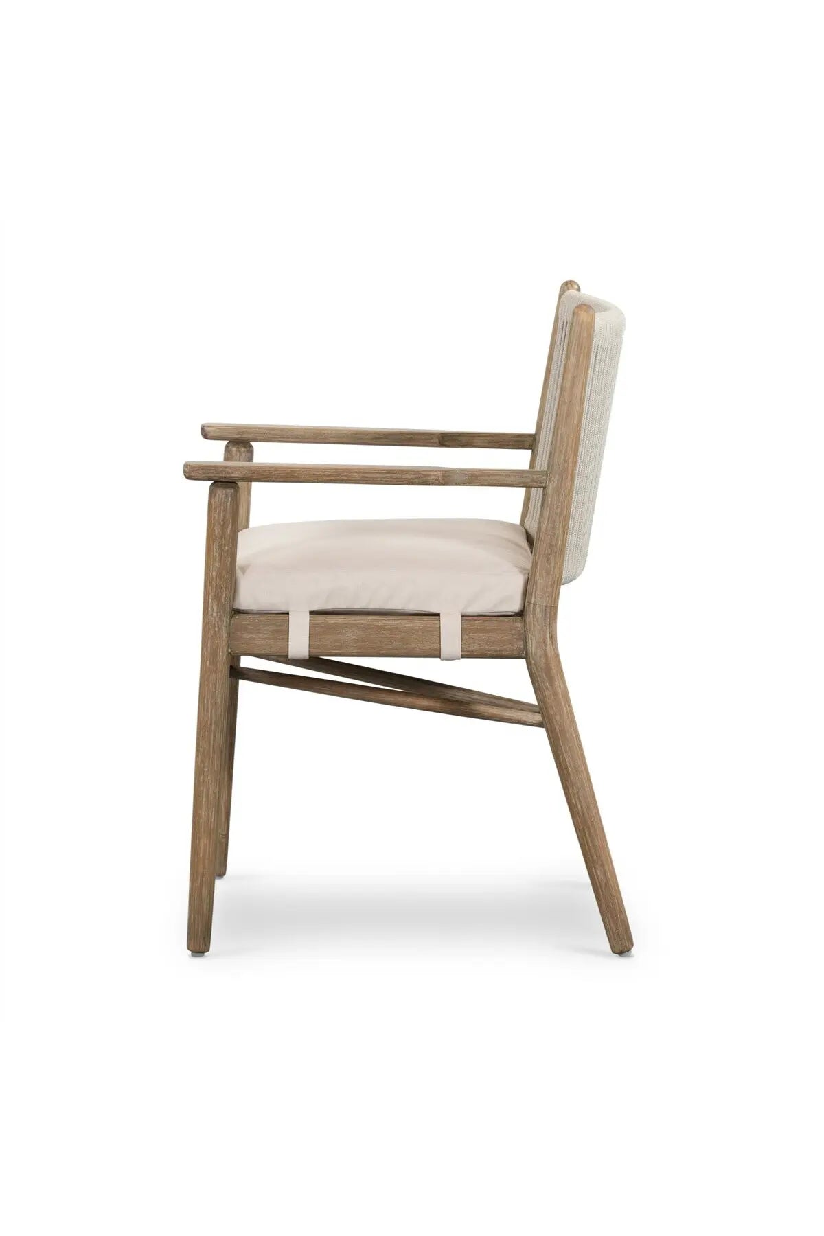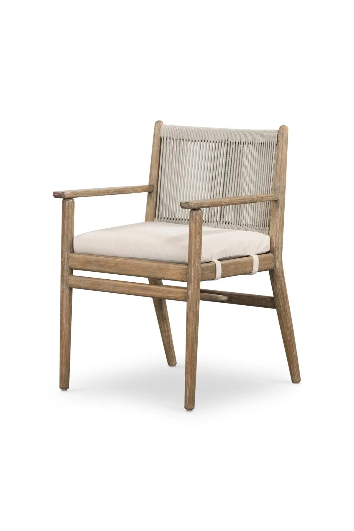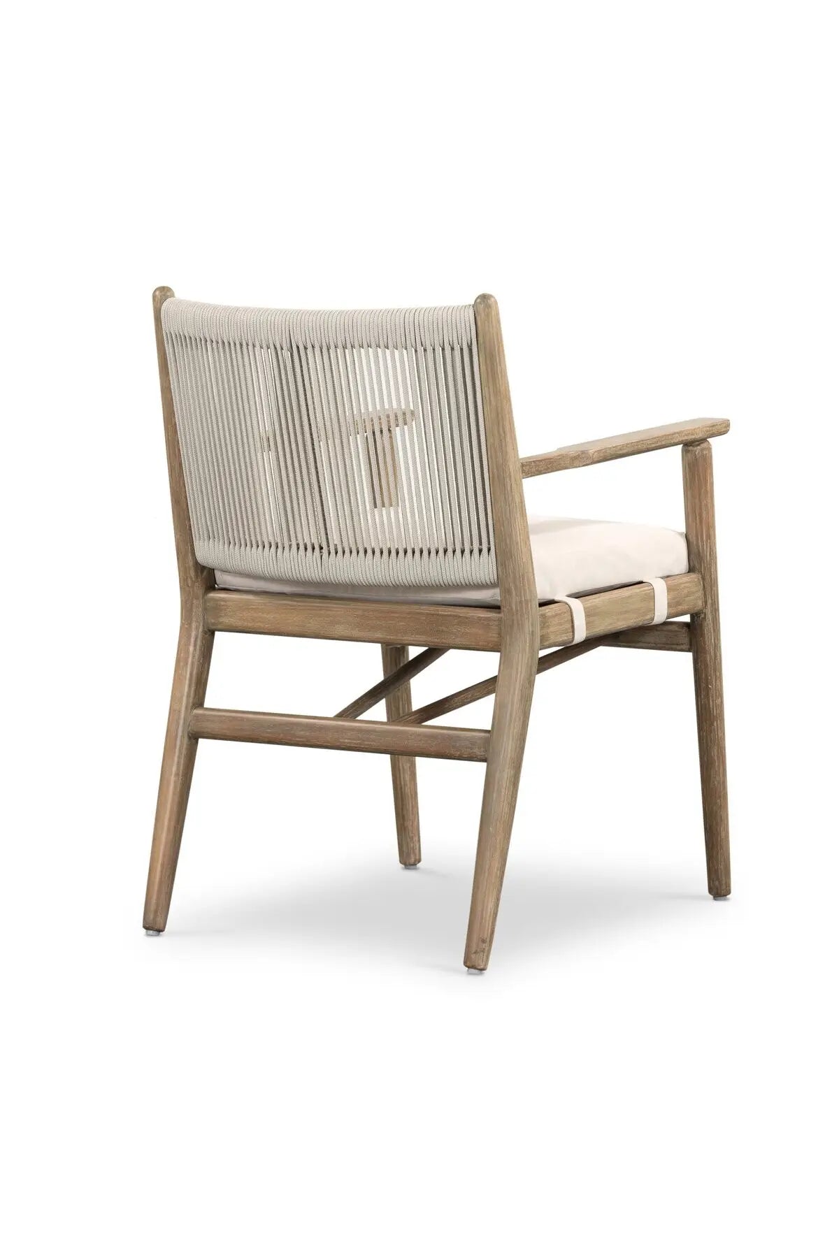 Meet the Rosen Outdoor Dining Armchair. Mixed materials prime for outdoor dining. A shapely frame of FSC-certified eucalyptus features a textural back of woven rope, paddle arms and comfy, Velcro-secured box cushioning in a versatile ivory. Cover or store indoors during inclement weather and when not in use.