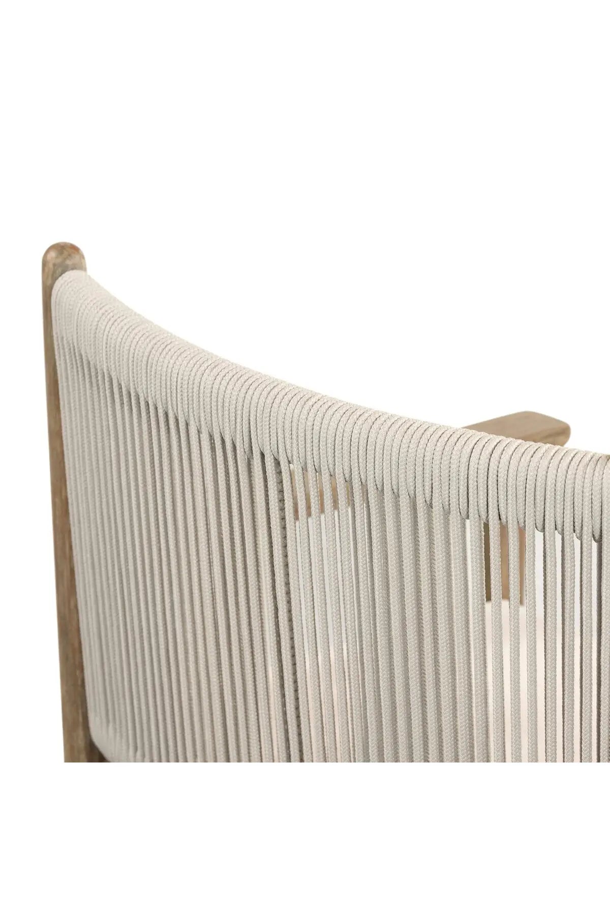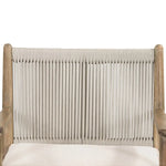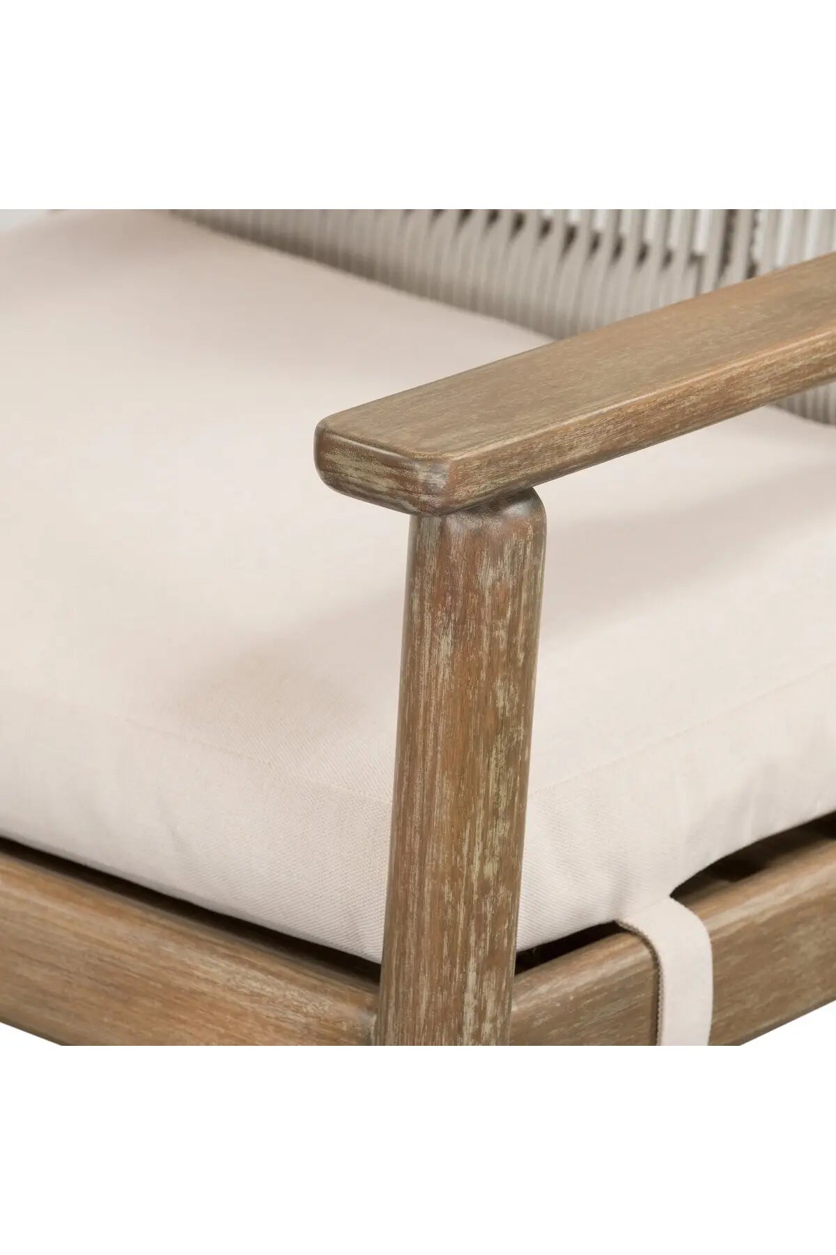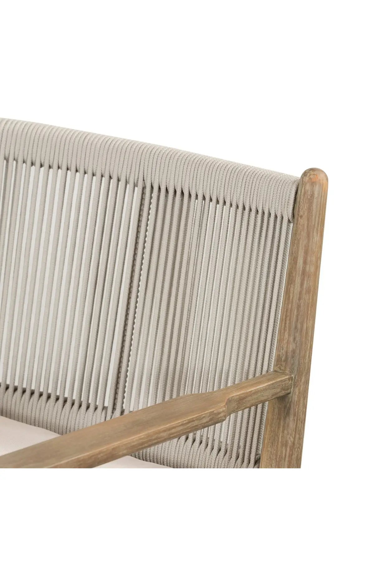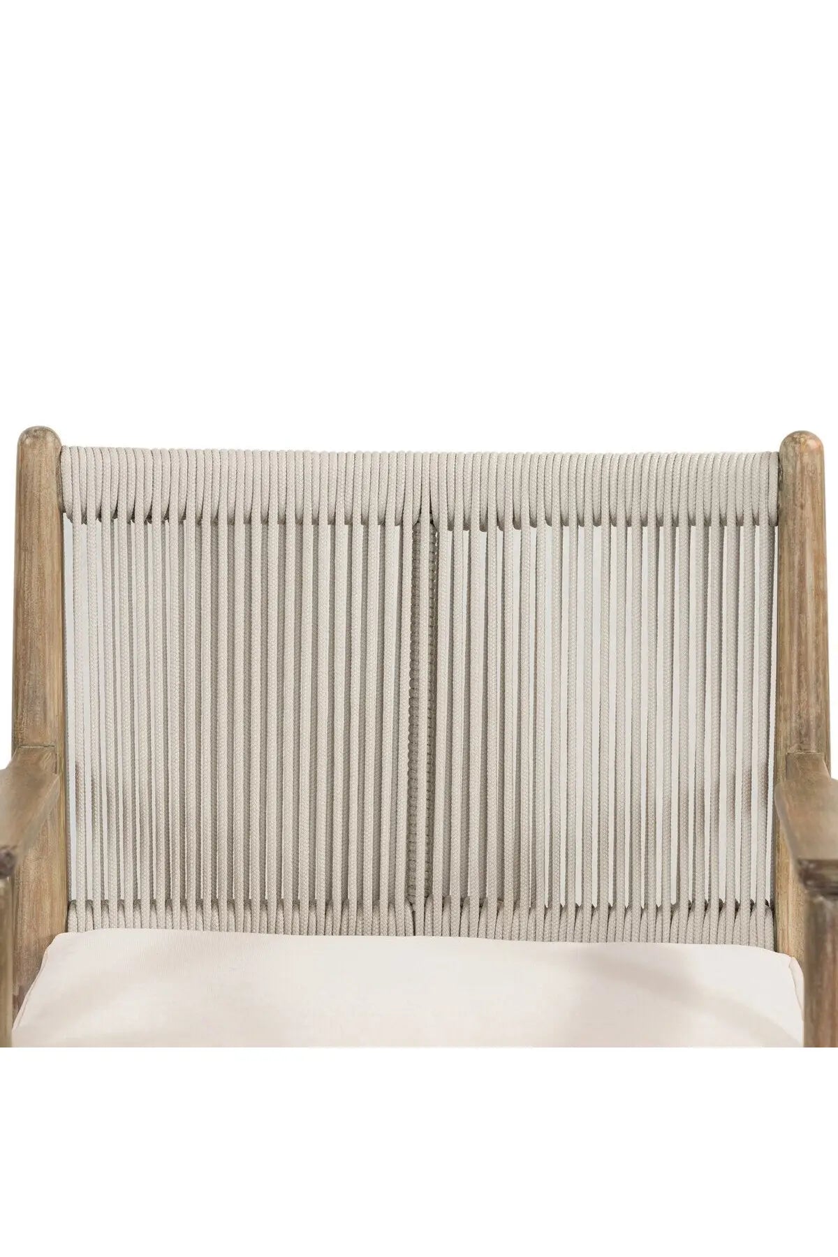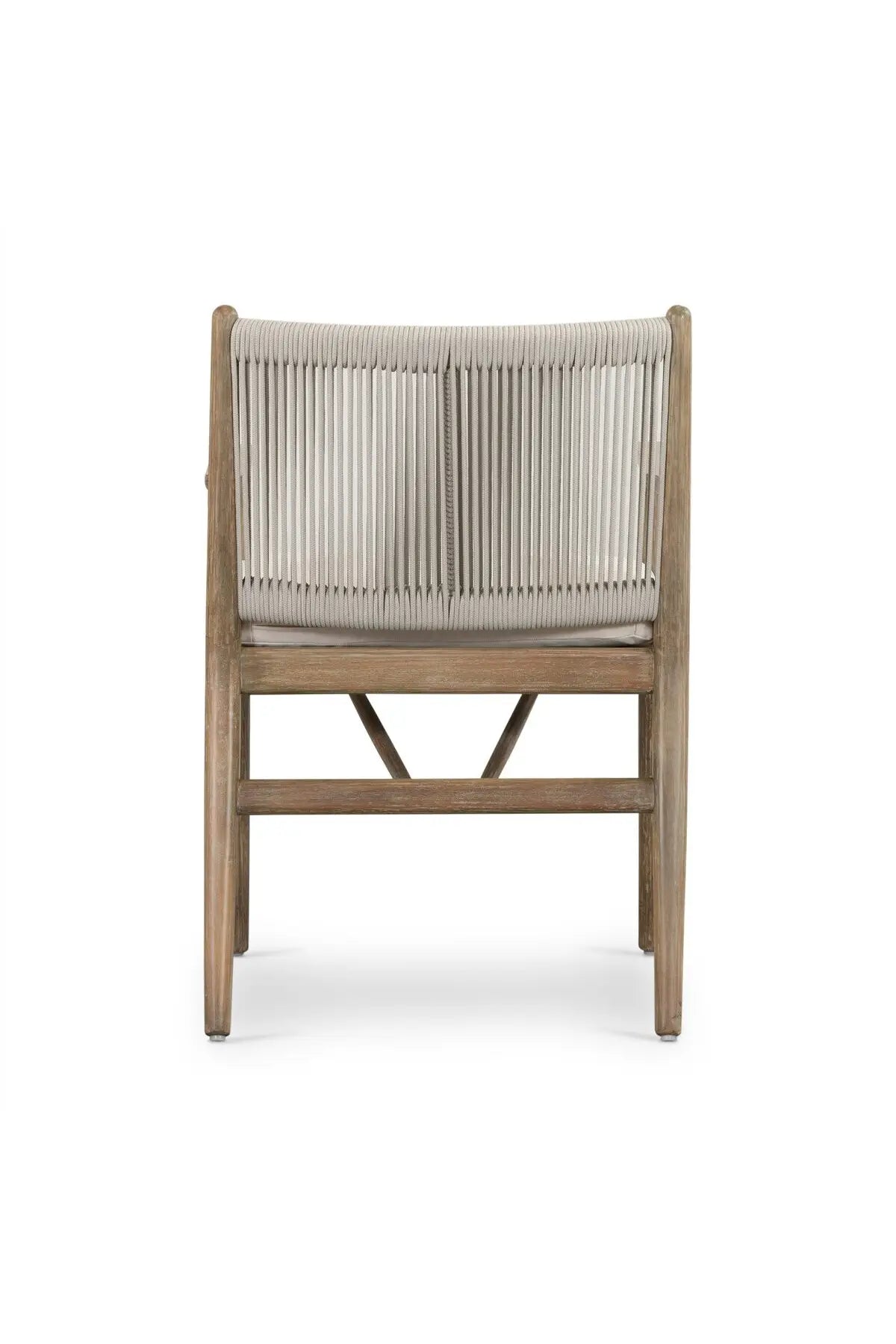 Meet the Rosen Outdoor Dining Armchair. Mixed materials prime for outdoor dining. A shapely frame of FSC-certified eucalyptus features a textural back of woven rope, paddle arms and comfy, Velcro-secured box cushioning in a versatile ivory. Cover or store indoors during inclement weather and when not in use.