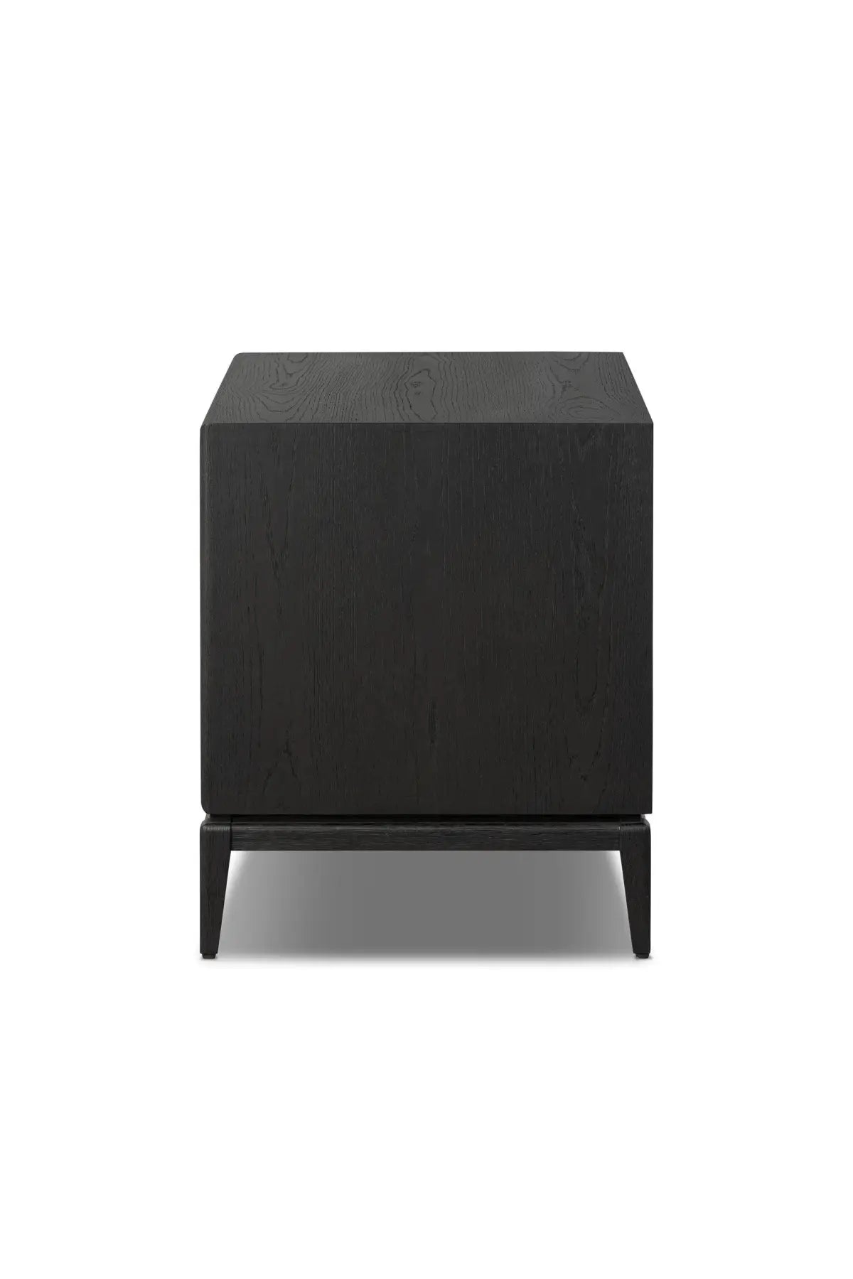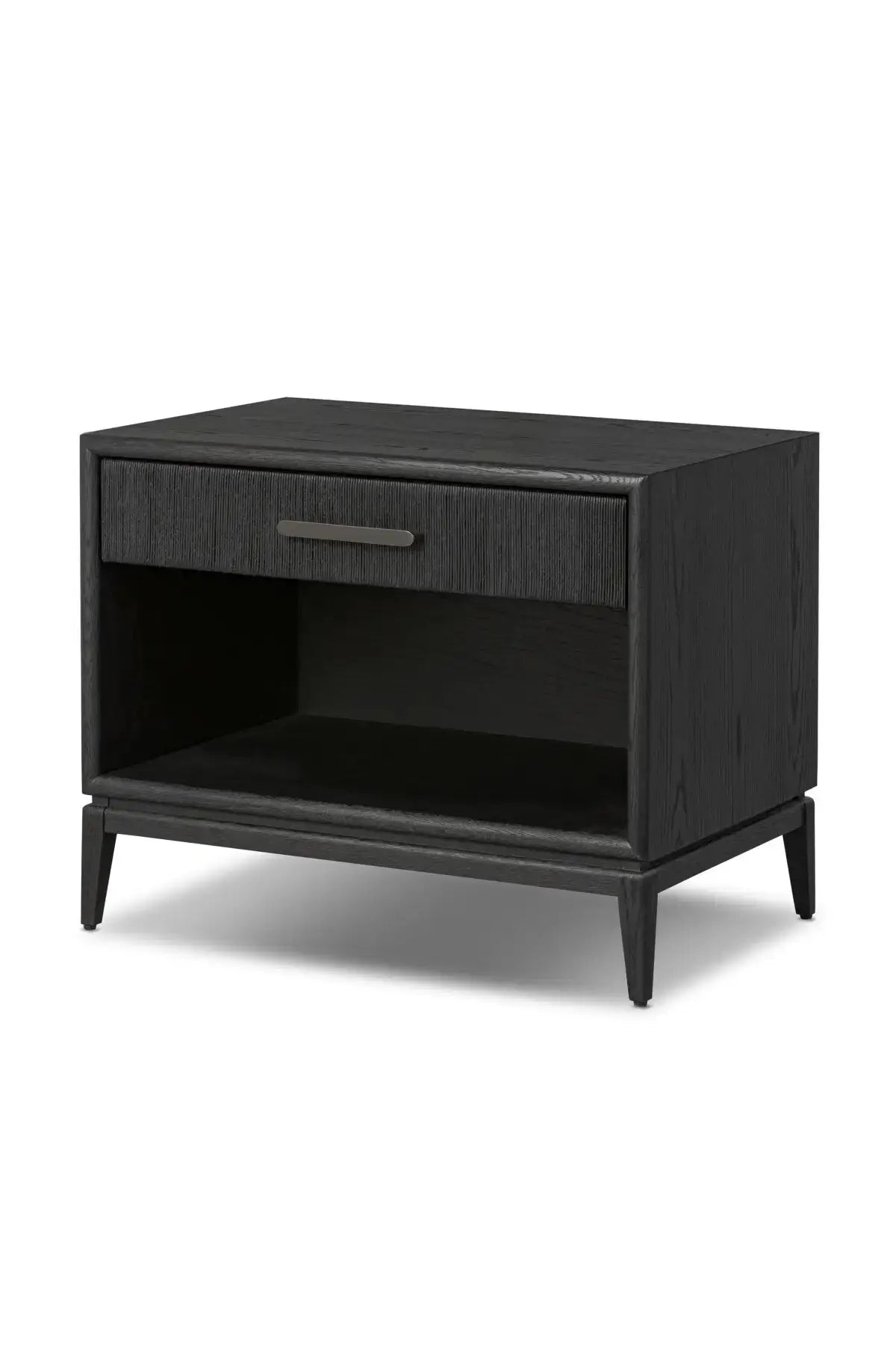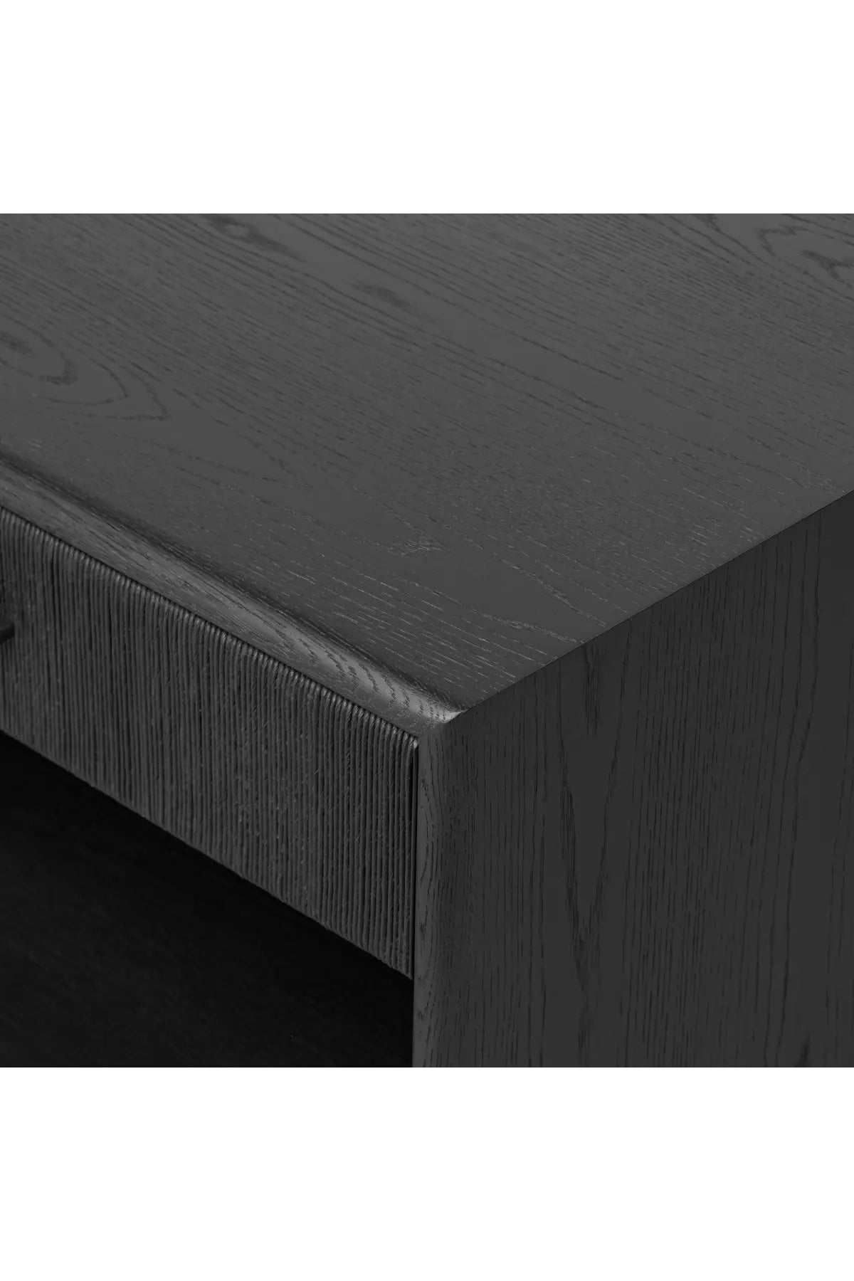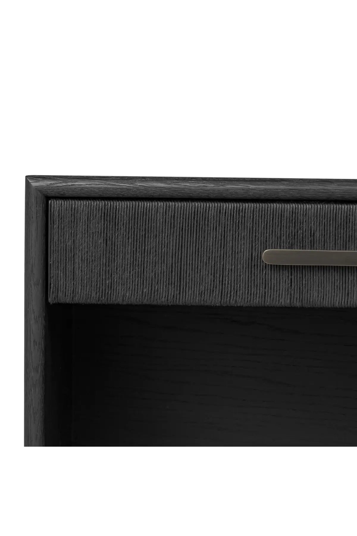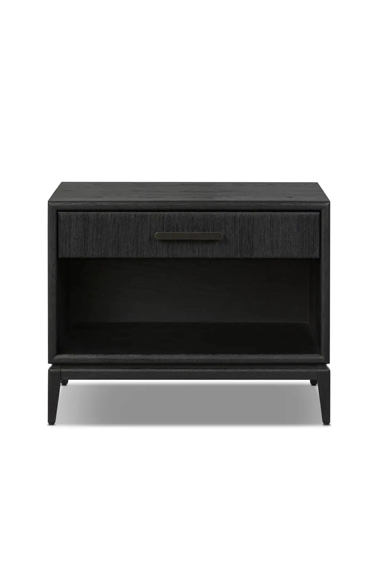 Meet the Rosenell Open Nightstand. Elevate your bedside storage with a nightstand of black-finished oak. A smooth top pairs with a single drawer front of woven paper cord for a dark, rich look that will work into your bedroom collection beautifully.