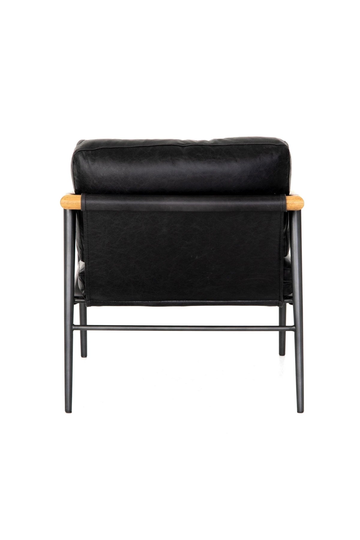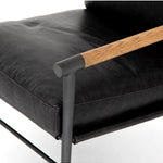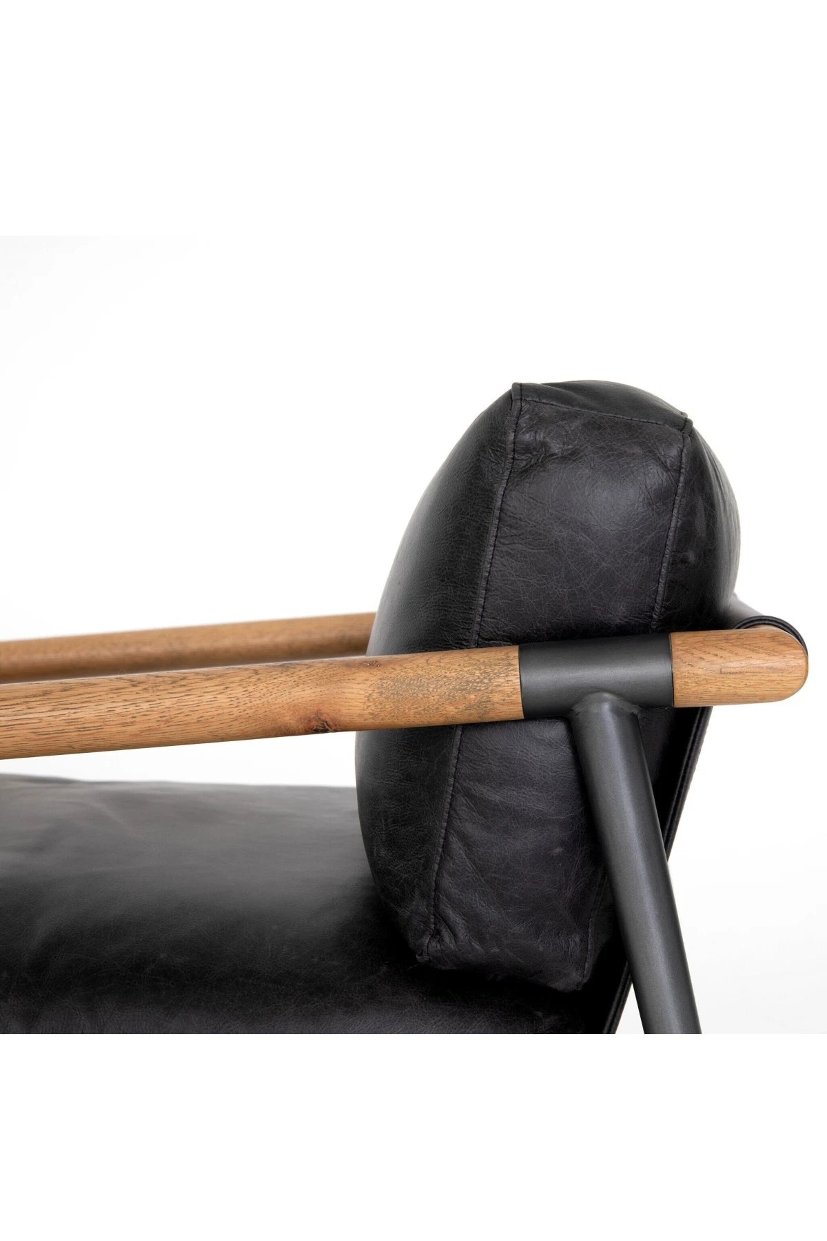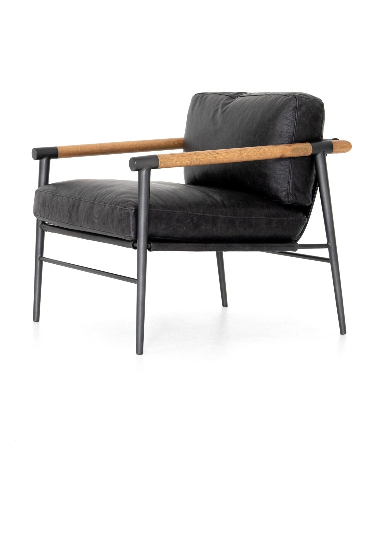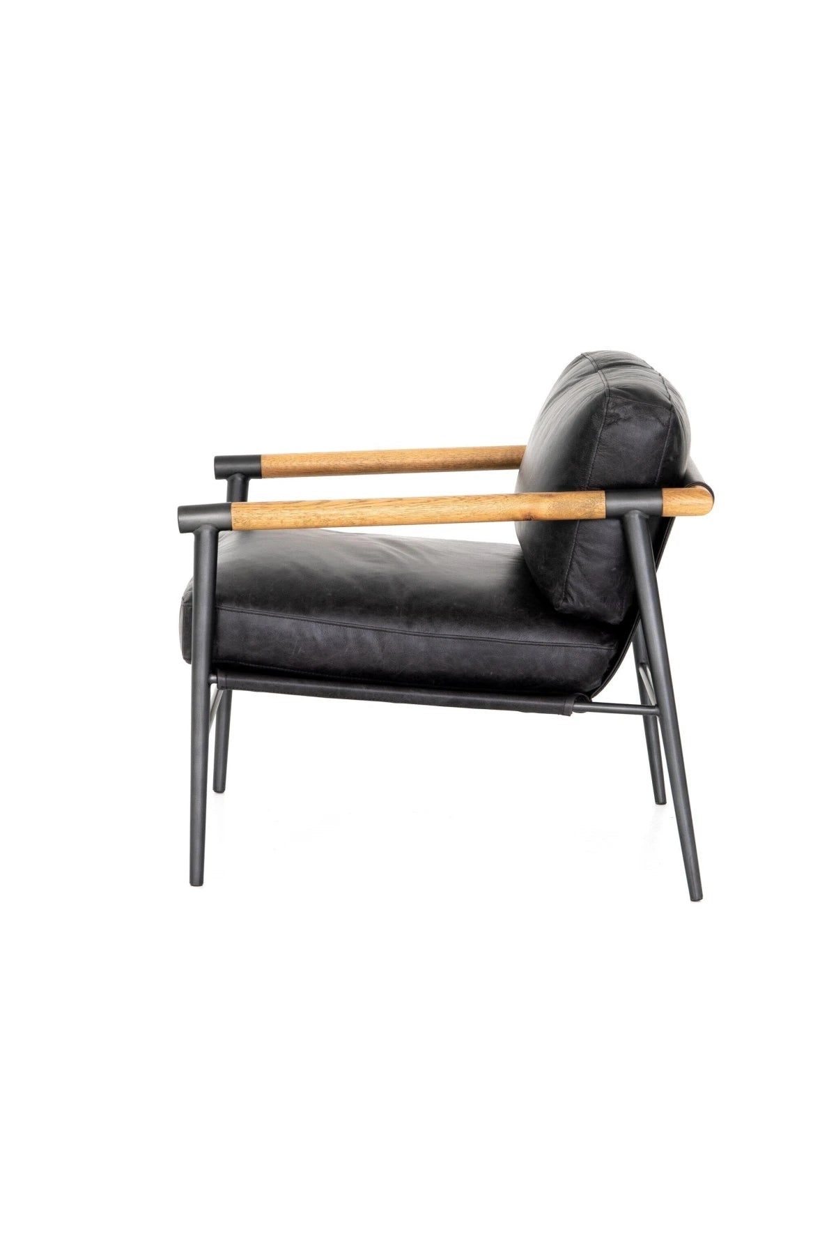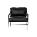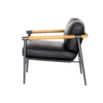 Meet the Rowen Chair. Buttery black seating of top-grain leather, with angular arms of exposed oak providing fresh contrast. Slim, carbon-finished steel legs for a dose of modern-industrial edge.